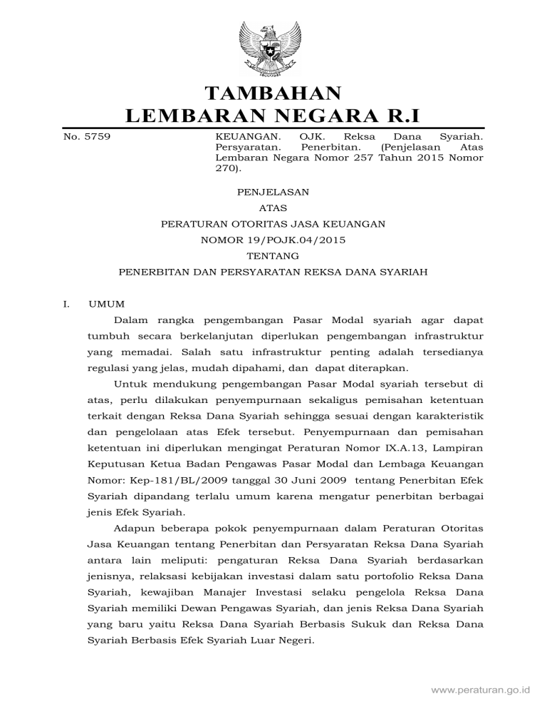 TAMBAHAN LEMBARAN NEGARA R.I No. 5759 KEUANGAN. OJK. Reksa Dana Syariah. Persyaratan. Penerbitan. (Penjelasan Atas Lembaran Negara Nomor 257 Tahun 2015 Nomor 270). PENJELASAN ATAS PERATURAN OTORITAS JASA KEUANGAN NOMOR 19/POJK.04/2015 TENTANG PENERBITAN DAN PERSYARATAN REKSA DANA SYARIAH I. UMUM Dalam rangka pengembangan Pasar Modal syariah agar dapat tumbuh secara berkelanjutan diperlukan pengembangan infrastruktur yang memadai. Salah satu infrastruktur penting adalah tersedianya regulasi yang jelas, mudah dipahami, dan dapat diterapkan. Untuk mendukung pengembangan Pasar Modal syariah tersebut di atas, perlu dilakukan penyempurnaan sekaligus pemisahan ketentuan terkait dengan Reksa Dana Syariah sehingga sesuai dengan karakteristik dan pengelolaan atas Efek tersebut. Penyempurnaan dan pemisahan ketentuan ini diperlukan mengingat Peraturan Nomor IX.A.13, Lampiran Keputusan Ketua Badan Pengawas Pasar Modal dan Lembaga Keuangan Nomor: Kep-181/BL/2009 tanggal 30 Juni 2009 tentang Penerbitan Efek Syariah dipandang terlalu umum karena mengatur penerbitan berbagai jenis Efek Syariah. Adapun beberapa pokok penyempurnaan dalam Peraturan Otoritas Jasa Keuangan tentang Penerbitan dan Persyaratan Reksa Dana Syariah antara lain meliputi: pengaturan Reksa Dana Syariah berdasarkan jenisnya, relaksasi kebijakan investasi dalam satu portofolio Reksa Dana Syariah, kewajiban Manajer Investasi selaku pengelola Reksa Dana Syariah memiliki Dewan Pengawas Syariah, dan jenis Reksa Dana Syariah yang baru yaitu Reksa Dana Syariah Berbasis Sukuk dan Reksa Dana Syariah Berbasis Efek Syariah Luar Negeri. www.peraturan.go.id No.5759 II. -2- PASAL DEMI PASAL Pasal 1 Cukup jelas. Pasal 2 Yang dimaksud dengan “penawaran umum di luar negeri” adalah penawaran umum Efek sesuai dengan peraturan perundang- undangan di negara Efek tersebut ditawarkan. Pasal 3 Cukup jelas. Pasal 4 Peraturan perundang-undangan di mengatur mengenai Umum Ketentuan sektor Pasar Pengajuan Modal yang Pernyataan Pendaftaran yang saat ini berlaku adalah Peraturan Nomor IX.A.1, Lampiran Keputusan Ketua Badan Pengawas Pasar Modal dan Lembaga Keuangan Nomor: Kep-690/BL/2011, tanggal 30 Desember 2011 tentang Ketentuan Umum Pengajuan Pernyataan Pendaftaran. Pasal 5 Cukup jelas. Pasal 6 Cukup jelas. Pasal 7 Ayat (1) Dewan Pengawas Syariah Manajer Investasi dapat terdiri dari 1 (satu) anggota yang ditunjuk oleh Direksi. Ayat (2) Cukup jelas. Ayat (3) Cukup jelas. www.peraturan.go.id No.5759 -3- Ayat (4) Yang dimaksud dengan “pengawasan Reksa Dana Syariah dalam rangka pemenuhan Prinsip Syariah di Pasar Modal secara berkelanjutan” adalah pengawasan pemenuhan Prinsip Syariah di Pasar Modal yang dilakukan sampai dengan dibubarkannya Reksa Dana Syariah. Ayat (5) Cukup jelas. Pasal 8 Ayat (1) Cukup jelas. Ayat (2) Cukup jelas. Ayat (3) Huruf a Yang dimaksud dengan “pihak yang dituju” adalah pihak yang menggunakan jasa Dewan Pengawas Syariah. Huruf b Cukup jelas. Huruf c Cukup jelas. Huruf d Cukup jelas. Huruf e Cukup jelas. Huruf f Cukup jelas. Ayat (4) Cukup jelas. Pasal 9 Peraturan perundang-undangan di mengatur mengenai Umum Ketentuan sektor Pasar Pengajuan Modal yang Pernyataan Pendaftaran yang saat ini berlaku adalah Peraturan Nomor IX.A.1, Lampiran Keputusan Ketua Badan Pengawas Pasar Modal dan Lembaga Keuangan Nomor: Kep-690/BL/2011, tanggal 30 Desember www.peraturan.go.id No.5759 -4- 2011 tentang Ketentuan Umum Pengajuan Pernyataan Pendaftaran. Peraturan perundang-undangan mengatur mengenai di Pernyataan sektor Pasar Pendaftaran Modal Dalam yang Rangka Penawaran Umum Reksa Dana Berbentuk Perseroan yang saat ini berlaku adalah Peraturan Nomor IX.C.4, Lampiran Keputusan Ketua Badan Pengawas Pasar Modal Nomor: Kep-52/PM/1996, tanggal 17 Januari 1996 tentang Pernyataan Pendaftaran Dalam Rangka Penawaran Umum Reksa Dana Berbentuk Perseroan. Peraturan perundang-undangan di sektor Pasar Modal yang mengatur mengenai Reksa Dana Berbentuk Perseroan lainnya yang saat ini berlaku antara lain: 1. Peraturan Nomor IV.A.3, Lampiran Keputusan Ketua Badan Pengawas Pasar Modal Nomor: Kep-13/PM/2002, tanggal 14 Agustus 2002 tentang Pedoman Pengelolaan Reksa Dana Berbentuk Perseroan; dan 2. Peraturan Nomor IV.A.4, Lampiran Keputusan Ketua Badan Pengawas Pasar Modal Nomor: Kep-14/PM/2002, tanggal 14 Agustus 2002 tentang Pedoman Kontrak Reksa Dana Berbentuk Perseroan. Pasal 10 Cukup jelas. Pasal 11 Ayat (1) Peraturan perundang-undangan di sektor Pasar Modal yang mengatur mengenai pedoman kontrak pengelolaan Reksa Dana Berbentuk Perseroan yang saat ini berlaku adalah Peraturan Nomor IV.A.4, Lampiran Keputusan Ketua Badan Pengawas Pasar Modal Nomor: Kep-14/PM/2002, tanggal 14 Agustus 2002 tentang Pedoman Kontrak Pengelolaan Reksa Dana Berbentuk Perseroan. Ayat (2) Peraturan perundang-undangan di sektor Pasar Modal yang mengatur mengenai pedoman kontrak penyimpanan kekayaan Reksa Dana Berbentuk Perseroan yang saat ini berlaku adalah Peraturan Nomor IV.A.5, Lampiran Keputusan Ketua Badan www.peraturan.go.id -5- No.5759 Pengawas Pasar Modal Nomor: Kep-21/PM/1996, tanggal 17 Januari 1996 tentang Pedoman Kontrak Penyimpanan Kekayaan Reksa Dana Berbentuk Perseroan. Ayat (3) Huruf a Cukup jelas. Huruf b Cukup jelas. Huruf c Cukup jelas. Huruf d Cukup jelas. Huruf e Cukup jelas. Huruf f Angka 1 Peraturan perundang-undangan di sektor Pasar Modal yang mengatur mengenai Daftar Efek Syariah dan pihak penerbit Daftar Efek Syariah yang saat ini berlaku adalah Peraturan Nomor II.K.1, Lampiran Keputusan Ketua Badan Pengawas Pasar Modal Dan Lembaga Keuangan Nomor: KEP-208/BL/2012 Tanggal 24 April 2012 Tentang Kriteria Dan Penerbitan Daftar Efek Syariah. Angka 2 Yang dimaksud dengan “Waran Syariah” adalah Efek yang diterbitkan oleh suatu perusahaan yang memberi hak kepada pemegang Efek untuk memesan saham syariah dari perusahaan tersebut pada harga tertentu setelah 6 (enam) bulan atau lebih sejak Efek dimaksud diterbitkan. Angka 3 Cukup jelas. Angka 4 Cukup jelas. Angka 5 Cukup jel