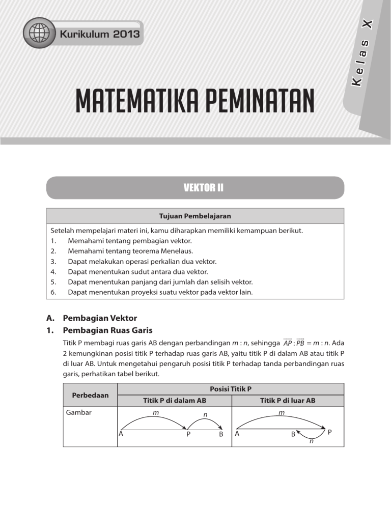 X Kela s Kurikulum 2013 matematika PEMINATAN VEKTOR II Tujuan Pembelajaran Setelah mempelajari materi ini, kamu diharapkan memiliki kemampuan berikut. 1. Memahami tentang pembagian vektor. 2. Memahami tentang teorema Menelaus. 3. Dapat melakukan operasi perkalian dua vektor. 4. Dapat menentukan sudut antara dua vektor. 5. Dapat menentukan panjang dari jumlah dan selisih vektor. 6. Dapat menentukan proyeksi suatu vektor pada vektor lain. A. Pembagian Vektor 1. Pembagian Ruas Garis Titik P membagi ruas garis AB dengan perbandingan m : n, sehingga AP : PB = m : n. Ada 2 kemungkinan posisi titik P terhadap ruas garis AB, yaitu titik P di dalam AB atau titik P di luar AB. Untuk mengetahui pengaruh posisi titik P terhadap tanda perbandingan ruas garis, perhatikan tabel berikut. Posisi Titik P Perbedaan Titik P di dalam AB m Gambar A Titik P di luar AB m n P B A B n P Perbedaan Posisi Titik P Tanda perbandingan Titik P di dalam AB AP dan PB mempunyai arah yang sama, sehingga m dan n mempunyai tanda yang sama. Perbandingan ruas garis AP : PB = m : n AP : AB = m : (m + n) Titik P di luar AB AP dan PB mempunyai arah yang berlawanan, sehingga m dan n mempunyai tanda yang berlawanan. AP : PB = m : −n AP : AB = m : (m − n) Contoh Soal 1 Diketahui layang-layang PQRS yang diagonal-diagonalnya berpotongan di titik O. Jika panjang PO = OR = 4 cm, OS = 6 cm, dan QO = 10 cm, tentukan perbandinganperbandingan berikut! c. QO : SO a. PO : OR b. PO : PR d. QO : SQ Pembahasan: Layang-layang pada soal dan unsur-unsur yang diketahui dapat digambarkan sebagai berikut. S 6 P R O 10 Q Berdasarkan gambar tersebut, diperoleh: a. PO : OR = 4 : 4 = 1 : 1 b. PO : PR = 4 : (4 + 4) = 4 : 8 = 1 : 2 c. QO : SO = QO : (− OS ) = 10 : (−6) = 5 : −3 d. QO : SQ = QO : (− QS ) = 10 : −(10 + 6) = 5 : −8 2 2. Pembagian dalam Bentuk Vektor Misalkan a , b , dan p berturut-turut merupakan vektor posisi dari titik A, B, dan P. Jika titik P membagi ruas garis AB dengan perbandingan AP : PB = m : n, berlaku rumus berikut. B n b p O a mb + na p= m+n P m A Contoh Soal 2 Diketahui vektor posisi dari titik C dan D berturut-turut adalah c dan d . Jika titik P membagi ruas garis CD dengan perbandingan CP : PD = 2 : 3, tuliskan vektor posisi dari titik P dalam c dan d ! Pembahasan: Oleh karena perbandingan CP : PD = 2 : 3, maka m = 2 dan n = 3. Dengan menggunakan rumus pembagian ruas garis dalam bentuk vektor, diperoleh: md + nc 2d + 3c 2 3 p= = = d+ c m+n 2+3 5 5 2 3 Jadi, vektor posisi dari titik P dalam c dan d adalah p = d + c . 5 5 Contoh Soal 3 Diketahui titik E(11, 3) dan F(6, 8). Jika titik P membagi ruas garis EF dengan perbandingan EP : PF = −2 : 7, tentukan koordinat titik P! Pembahasan: Oleh karena perbandingan EP : PF = −2 : 7, maka m = −2 dan n = 7. Dengan menggunakan rumus pembagian ruas garis dalam bentuk vektor, diperoleh: 6 11 65 −2 + 7 mf + ne 8 3 5 13 p= = = = m+n −2 + 7 5 1 Jadi, koordinat titik P adalah (13, 1). 3 B. Teorema Menelaus Diketahui sebuah segitiga ABC. Titik Y terletak pada sisi AC dan titik Z terletak pada sisi AB. Melalui titik Y dan Z dibuat garis YZ. Garis CB dan YZ diperpanjang sehingga berpotongan di titik X seperti pada gambar berikut. Bunyi Teorema Menelaus A Y Z B C BX Titik X, Y, Z segaris (kolinear) jika dan hanya jika XC X CY . YA AZ . = 1. ZB Teorema Menelaus disebut juga dengan teorema Ceva. SUPER "Solusi Quipper" Cara Mudah Mengingat Teorema Menelaus Agar kamu lebih mudah mengingat teorema ini, perhatikan arah panah berikut. 2 A 1 Y Z 1 2 B C X 1 2 BX XC CY . YA AZ . = 1. ZB 4 Contoh Soal 4 Perhatikan gambar berikut! A Y C Z B X Diketahui koordinat titik A(4, 8) dan B(8, −2). Jika perbandingan BX : XC = 1 : 2 dan CY : YA = 4 : 1, tentukan koordinat titik Z! Pembahasan: Mula-mula, tentukan perbandingan AZ : ZB dengan menggunakan teorema Menelaus. AZ BX CY ⋅ ⋅ = 1 ZB XC YA AZ 1 4 ⇔ ⋅ ⋅ = 1 ZB 2 1 AZ ⇔ ⋅ 2 = 1 ZB AZ 1 ⇔ = ZB 2 AZ m 1 Ini berarti, = = n 2 ZB Selanjutnya, tentukan koordinat titik Z dengan menggunakan rumus pembagian ruas garis dalam bentuk vektor. 8 4 16 1 + 2 16 mb + na −2 8 14 3 z= = = = m+n 1+ 2 3 14 3 16 14 Jadi, koordinat titik Z adalah , . 3 3 5 C. Perkalian Skalar Dua Vektor (Perkalian Titik atau Dot Product) Perhatikan gambar berikut! a θ b Pangkal vektor a dan b berimpit di satu titik Hasil perkalian skalar vektor a dan b adalah suatu bilangan real yang dapat ditentukan dengan rumus berikut. a ⋅ b = a b cos θ dengan θ adalah sudut antara vektor a dan b . Perkalian skalar vektor a dan b disebut juga dengan perkalian titik a dan b atau a ∙ b (dibaca a dot b ). Syarat perkalian skalar dua vektor adalah pangkal kedua vektor harus berimpit di satu titik. Perhatikan gambar vektor di R³ berikut! Z A (a1, a2, a3) a b θ B (b1, b2, b3) Y O X b a 1 1 Jika diketahui komponen vektornya, misalnya a = a2 dan b = b2 , perkalian b a 3 3 skalar dua vektor dapat ditentukan dengan rumus berikut. a ⋅ b = a1 ⋅ b1 + a2 ⋅ b2 + a3 ⋅ b3 Tips: Cukup kalikan elemen-elemen yang seletak. 6 Sekarang, perhatikan gambar berikut ini! A(a1, a2, a3) Z A(a1, a2, a3) a Y θ O θ O B(b1, b2, b3) b X B(b1, b2, b3) Jika vektor a tegak lurus vektor b (θ = 90°), diperoleh: a ⋅ b = a b cos 90° = a1 ⋅ b1 + a2 ⋅ b2 + a3 ⋅ b3 = 0 Contoh Soal 5 Perhatikan gambar berikut! a =4 45° b =6 Tentukan nilai dari a ∙ b ! Pembahasan: Syarat perkalian skalar dua vektor adalah pangkal kedua vektor harus berimpit di satu titik. Oleh karena itu, vektor b harus digeser sedemikian rupa hingga pangkalnya berimpit dengan pangkal vektor a . a =4 θ 45° b =6 7 Berdasarkan gambar tersebut, diketahui θ = 180° − 45° = 135° (sudut berpelurus). Dengan demikian, diperoleh: a ⋅ b = a b cos θ = ( 4 )( 6 ) cos 135° 1 = 24 − 2 2 = −12 2 Jadi, nilai dari a ⋅ b = −12 2 . Contoh Soal 6 Diketahui a = 2i − 3j + k dan b = −5i − 2 j + 4 k . Tentukan nilai dari a ⋅ b ! Pembahasan: Oleh karena yang diketahui komponen vektornya, maka cukup kalikan elemen-elemen