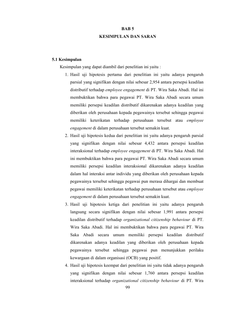 BAB 5 KESIMPULAN DAN SARAN 5.1 Kesimpulan Kesimpulan yang dapat diambil dari penelitian ini yaitu : 1. Hasil uji hipotesis pertama dari penelitian ini yaitu adanya pengaruh parsial yang signifikan dengan nilai sebesar 2,954 antara persepsi keadilan distributif terhadap employee engagement di PT. Wira Saka Abadi. Hal ini membuktikan bahwa para pegawai PT. Wira Saka Abadi secara umum memiliki persepsi keadilan distributif dikarenakan adanya keadilan yang diberikan oleh perusahaan kepada pegawainya tersebut sehingga pegawai memiliki keterikatan terhadap perusahaan tersebut atau employee engagement di dalam perusahaan tersebut semakin kuat. 2. Hasil uji hipotesis kedua dari penelitian ini yaitu adanya pengaruh parsial yang signifikan dengan nilai sebesar 4,432 antara persepsi keadilan interaksional terhadap employee engagement di PT. Wira Saka Abadi. Hal ini membuktikan bahwa para pegawai PT. Wira Saka Abadi secara umum memiliki persepsi keadilan interaksional dikarenakan adanya keadilan dalam hal interaksi antar individu yang diberikan oleh perusahaan kepada pegawainya tersebut sehingga pegawai pun merasa dihargai dan membuat pegawai memiliki keterikatan terhadap perusahaan tersebut atau employee engagement di dalam perusahaan tersebut semakin kuat. 3. Hasil uji hipotesis ketiga dari penelitian ini yaitu adanya pengaruh langsung secara signifikan dengan nilai sebesar 1,991 antara persepsi keadilan distributif terhadap organizational citizenship behaviour di PT. Wira Saka Abadi. Hal ini membuktikan bahwa para pegawai PT. Wira Saka Abadi secara umum memiliki persepsi keadilan distributif dikarenakan adanya keadilan yang diberikan oleh perusahaan kepada pegawainya tersebut sehingga pegawai pun menunjukkan perilaku kewargaan di dalam organisasi (OCB) yang positif. 4. Hasil uji hipotesis keempat dari penelitian ini yaitu tidak adanya pengaruh yang signifikan dengan nilai sebesar 1,760 antara persepsi keadilan interaksional terhadap organizational citizenship behaviour di PT. Wira 99 100 Saka Abadi. Hal ini membuktikan bahwa para pegawai PT. Wira Saka Abadi yang memiliki persepsi keadilan interaksional yang tinggi tidak akan berpengaruh secara langsung terhadap perilaku kewargaan di dalam organisasi (OCB). 5. Hasil uji hipotesis kelima dari penelitian ini yaitu adanya pengaruh langsung secara signifikan dengan nilai sebesar 3,885 antara employee engagement terhadap organizational citizenship behaviour di PT. Wira Saka Abadi. Hal ini membuktikan bahwa para pegawai PT. Wira Saka Abadi secara umum memiliki keterikatan dengan perusahannya atau memiliki employee engagement yang kuat dan memungkinkan pegawai untuk menunjukkan perilaku kewargaan di dalam organisasi (OCB) yang positif juga. 6. Hasil uji hipotesis keenam dari hasil penelitian ini yaitu adanya pengaruh simultan secara signifikan dengan nilai sebesar 2,254 antara persepsi keadilan distributif terhadap organizational citizenship behaviour dengan employee engagement sebagai variabel intervening di PT. Wira Saka Abadi. Hal ini membuktikan bahwa employee engagement memediasi penuh variabel persepsi keadilan distributif terhadap organizational citizenship behaviour. Sehingga dengan adanya pengaruh tersebut para pegawai PT. Wira Saka Abadi secara umum memiliki persepsi keadilan distributif yang meningkatkan keterikatan terhadap perusahaannya tersebut (employee engagement) dan membuat para pegawai merasa harus melakukan hal lebih untuk perusahaannya yang akhirnya akan meningkatkan perilaku kewargaan di dalam organisasi (OCB) yang positif. 7. Hasil uji hipotesis ketujuh dari penelitian ini yaitu adanya pengaruh simultan secara signifikan dengan nilai sebesar 2,894 antara persepsi keadilan interaksional terhadap organizational citizenship behaviour dengan employee engagement sebagai variabel intervening di PT. Wira Saka Abadi. Hal ini membuktikan bahwa employee engagement memediasi penuh variabel persepsi keadilan distributif terhadap organizational citizenship behaviour. Namun apabila persepsi keadilan interaksional dihubungkan secara langsung dengan organizational citizenship behaviour, hasilnya tidak berpengaruh signifikan seperti yang disebutkan pada hipotesis keempat. Hal ini berarti bahwa pegawai PT. 101 Wira Saka Abadi yang memiliki persepsi keadilan interaksional akan cenderung untuk menunjukkan perilaku kewargaan di dalam organisasi (OCB) yang positif jika pegawai tersebut sudah memiliki keterikatan dengan perusahaan atau pegawai memiliki employee engagement yang kuat terlebih dahulu. 5.3 Saran 1. Saran untuk perusahaan Saran yang dapat diberikan untuk perusahaan yaitu: a. Perusahaan harus terus berusaha memberikan keadilan berupa keadilan distributif kepada para pegawai di mana keadilan distributif itu dapat diberikan dengan cara memberi tunjangan kesehatan dan cuti sama rata, memberikan bantuan biaya jika pegawai membutuhkan sesuatu atau kebutuhan mendesak, memberikan gaji yang adil sesuai dengan kontribusi yang diberikan pegawai dan juga sesuai dengan pengalaman kerjanya. b. Selain itu keadilan interaksional di dalam perusahaan juga harus terus dikembangkan dan ditingkatkan, di mana persepsi keadilan interaksional dapat ditingkatkan dengan cara melakukan training dan seminar untuk semua karyawan. c. Mempertahankan employee engagement yang sudah ada di dalam perusahaan serta meningkatkan employee engagement tersebut dengan cara meningkatkan persepsi akan keadilan distributif dan persepsi akan keadilan interaksional kepada pegawai. d. Mempertahankan dan meningkatkan Organizational Citizenship Behaviour (OCB) di dalam perusahaan dengan meningkatkan keadilan distributif seperti memberikan biaya bantuan kesehatan untuk keluarga karyawan yang sakit dan memberikan biaya bantuan kesehatan di luar Jamsostek. 2. Saran untuk penelitian selanjutnya Saran yang dapat diberikan untuk penelitian selanjutnya yaitu: a. Penelitian ini hanya menggunakan kuesioner sebagai alat penelitian, diharapkan penelitian selanjutnya dapat menggunakan wawancara, 102 obs