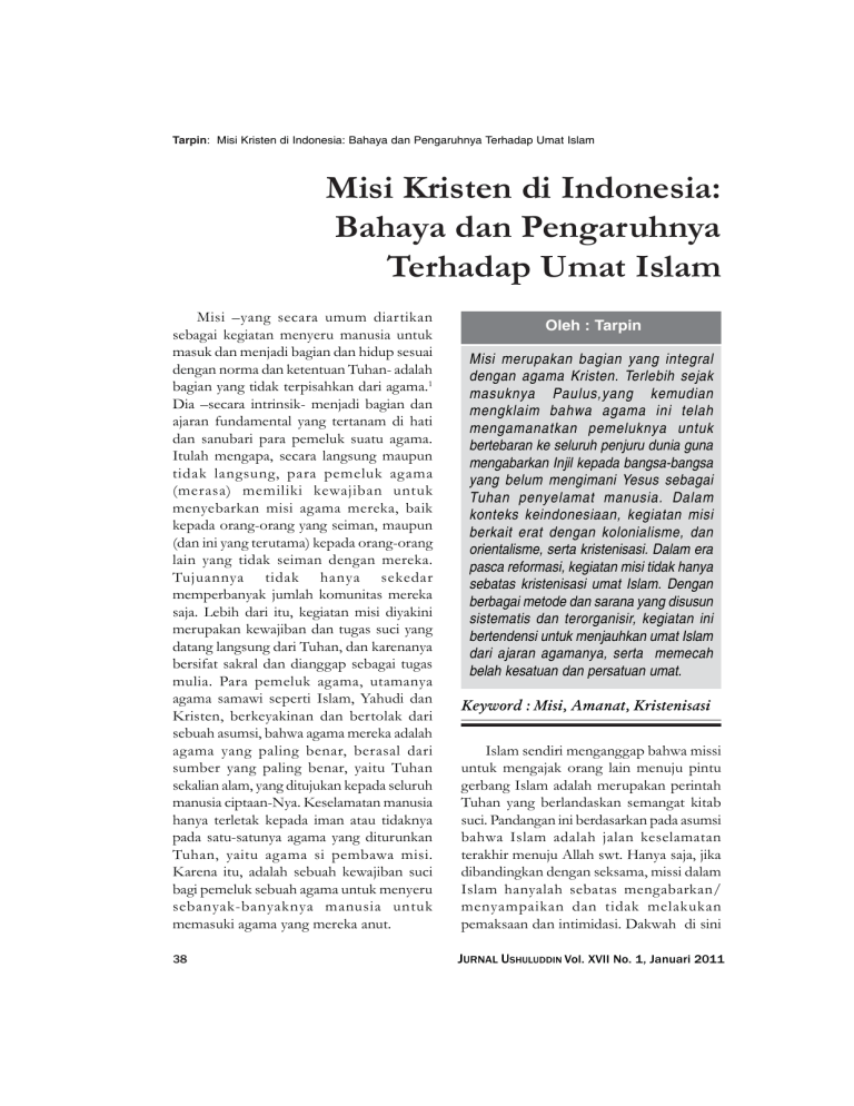 Tarpin: Misi Kristen di Indonesia: Bahaya dan Pengaruhnya Terhadap Umat Islam Misi Kristen di Indonesia: Bahaya dan Pengaruhnya Terhadap Umat Islam Misi –yang secara umum diartikan sebagai kegiatan menyeru manusia untuk masuk dan menjadi bagian dan hidup sesuai dengan norma dan ketentuan Tuhan- adalah bagian yang tidak terpisahkan dari agama.1 Dia –secara intrinsik- menjadi bagian dan ajaran fundamental yang tertanam di hati dan sanubari para pemeluk suatu agama. Itulah mengapa, secara langsung maupun tidak langsung, para pemeluk agama (merasa) memiliki kewajiban untuk menyebarkan misi agama mereka, baik kepada orang-orang yang seiman, maupun (dan ini yang terutama) kepada orang-orang lain yang tidak seiman dengan mereka. Tujuannya tidak hanya sekedar memperbanyak jumlah komunitas mereka saja. Lebih dari itu, kegiatan misi diyakini merupakan kewajiban dan tugas suci yang datang langsung dari Tuhan, dan karenanya bersifat sakral dan dianggap sebagai tugas mulia. Para pemeluk agama, utamanya agama samawi seperti Islam, Yahudi dan Kristen, berkeyakinan dan bertolak dari sebuah asumsi, bahwa agama mereka adalah agama yang paling benar, berasal dari sumber yang paling benar, yaitu Tuhan sekalian alam, yang ditujukan kepada seluruh manusia ciptaan-Nya. Keselamatan manusia hanya terletak kepada iman atau tidaknya pada satu-satunya agama yang diturunkan Tuhan, yaitu agama si pembawa misi. Karena itu, adalah sebuah kewajiban suci bagi pemeluk sebuah agama untuk menyeru sebanyak-banyaknya manusia untuk memasuki agama yang mereka anut. Islam sendiri menganggap bahwa missi untuk mengajak orang lain menuju pintu gerbang Islam adalah merupakan perintah Tuhan yang berlandaskan semangat kitab suci. Pandangan ini berdasarkan pada asumsi bahwa Islam adalah jalan keselamatan terakhir menuju Allah swt. Hanya saja, jika dibandingkan dengan seksama, missi dalam Islam hanyalah sebatas mengabarkan/ menyampaikan dan tidak melakukan pemaksaan dan intimidasi. Dakwah di sini 38 JURNAL USHULUDDIN Vol. XVII No. 1, Januari 2011 Oleh : Tarpin Misi merupakan bagian yang integral dengan agama Kristen. Terlebih sejak masuknya Paulus,yang kemudian mengklaim bahwa agama ini telah mengamanatkan pemeluknya untuk bertebaran ke seluruh penjuru dunia guna mengabarkan Injil kepada bangsa-bangsa yang belum mengimani Yesus sebagai Tuhan penyelamat manusia. Dalam konteks keindonesiaan, kegiatan misi berkait erat dengan kolonialisme, dan orientalisme, serta kristenisasi. Dalam era pasca reformasi, kegiatan misi tidak hanya sebatas kristenisasi umat Islam. Dengan berbagai metode dan sarana yang disusun sistematis dan terorganisir, kegiatan ini bertendensi untuk menjauhkan umat Islam dari ajaran agamanya, serta memecah belah kesatuan dan persatuan umat. Keyword : Misi, Amanat, Kristenisasi Tarpin: Misi Kristen di Indonesia: Bahaya dan Pengaruhnya Terhadap Umat Islam sebagai bukti bahwa kebenaran yang diyakini oleh seorang Muslim telah disampaikan kepada orang lain. Out put berupa ketertarikan dan pemilihan Islam sebagai agama tidaklah menjadi target utama dalam Islam. Sementara dalam Kristen, missi tidak sekedar menawarkan ajaran Kristen kepada pihak lain, tetapi juga mengandung keharusan agar objek missi benar-benar dapat dikatakan sebagai penganut Kristen secara formal. Dengan demikian, beban di pundak missonaris lebih berat dibanding beban da’i dalam Islam. Maka tidaklah mengherankan jika missi Kristen terkadang terkesan melalui cara-cara yang tidak lazim dilakukan oleh missionaris terhadap agama-agama lain. Misi Kristen di Indonesia merupakan suatu fenomena yang muncul seiring dengan sejarah keberadaan agama itu sendiri di bumi Nusantara ini. Setiap umat Kristen, secara genetik merasa memiliki kewajiban untuk menyebarkan agama mereka, serta menarik pemeluk agama/ kepercayaan lain ke dalam agama Kristen. Banyak alasan dan faktor yang melatarbelakangi kegiatan misi. Diantaranya adalah, karena secara eksklusif, Teologi Kristen telah mengklaim bahwa satu-satunya keselamatan hanyalah bagi siapa yang berada dan termasuk di dalam Gereja Yesus Kristus, yaitu Kristen, sebagai mana perkataan Yesus di dalam Injil, “Siapa tidak besama Aku, ia melawan Aku dan siapa tidak berkumpul bersama Ku berceraiberai”2. Dari sinilah kemudian berkembang slogan extra ecclesias nulla salus (Tidak ada keselamatan di luar Gereja). Misi Kristen di Indonesia merupakan persoalan utama yang sering kali menjadi batu sandungan dalam membina kerukunan antar umat beragama, terutama antara umat Kristen dengan umat Islam. Persoalannya bukan saja karena arogansi slogan di atas secara politis telah mengkerdilkan (bahkan menganggap tidak ada) keselamatan dan JURNAL USHULUDDIN Vol. XVII No. 1, Januari 2011 eksistensi agama-agama lain (terutama Islam), melainkan karena implikasi dari kegiatan misi Kristen –dalam prakteknyatelah menyelusup dan menjelajah di tengahtengah komunitas yang nyata-nyata telah beragama (umat Islam). Antipati umat Islam terhadap kegiatan-kegiatan misi Kristen, baik yang terang-terangan maupun terselubung-, kerap kali memanas dan menimbulkan konflik horizontal maupun vertikal. Kecurigaan (kalau tidak bisa dikatakan kebencian) terhadap segala kegiatan yang berbau misi semakin lama semakin membubung, terlebih jika mengingat, betapa dalam beberapa dekade terakhir secara kuantitatif terjadi peningkatan populasi umat Kristen, dan semakin banyaknya umat Islam yang mengalami konversi pindah ke agama Kristen. Tulisan ini bermaksud menjawab beberapa persoalan yang berhubungan dengan misi Kristen di Indonesia, seperti: apa arti misi Kristen, apa yang melatarbelakanginya, apa tujuan dan bagaimana kegiatan misi itu dilakukan? A. Pengertian Misi Kristen Istilah misi berasal dari bahasa Latin mitto yang merupakan terjemahan dari kata Yunani apostell, artinya mengutus.3 Secara umum kata misi bisa merujuk pada pengutusan seseorang dengan tujuan khusus, misalnya misi kesenian, misi budaya, dan lain-lain. Dalam konteks kekristenan, misi dipahami dalam arti pe