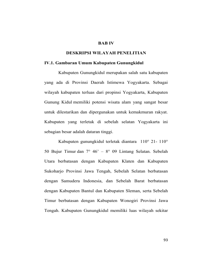 BAB IV DESKRIPSI WILAYAH PENELITIAN IV.1. Gambaran Umum Kabupaten Gunungkidul Kabupaten Gunungkidul merupakan salah satu kabupaten yang ada di Provinsi Daerah Istimewa Yogyakarta. Sebagai wilayah kabupaten terluas dari propinsi Yogyakarta, Kabupaten Gunung Kidul memiliki potensi wisata alam yang sangat besar untuk dilestarikan dan dipergunakan untuk kemakmuran rakyat. Kabupaten yang terletak di sebelah selatan Yogyakarta ini sebagian besar adalah dataran tinggi. Kabupaten gunungkidul terletak diantara 110° 21- 110° 50 Bujur Timur dan 7° 46’ – 8° 09 Lintang Selatan. Sebelah Utara berbatasan dengan Kabupaten Klaten dan Kabupaten Sukoharjo Provinsi Jawa Tengah, Sebelah Selatan berbatasan dengan Samudera Indonesia, dan Sebelah Barat berbatasan dengan Kabupaten Bantul dan Kabupaten Sleman, serta Sebelah Timur berbatasan dengan Kabupaten Wonogiri Provinsi Jawa Tengah. Kabupaten Gunungkidul memiliki luas wilayah sekitar 93 1.485,36 Km atau ± 46,63% dan keseluruhan luas wilayah Yogyakarta. Berikut kami sajikan peta kabupaten Gunungkidul : Gambar 1. Peta Kabupaten Gunungkidul Sumber : ( Map data @2017 google (Akses 4 januari 2017 ) Kabupaten Gunungkidul merupakan dataran tinggi dan bergunung-gunung, dengan topografi keadaan tanahnya secara garis besar dibagi menjadi 3 (tiga) wilayah pengembangan (Zona), yaitu: 1. Zona Utara(Zona Batur Agung) Dengan ketinggian 200 - 700 m di atas permukaan laut. Wilayah ini berpotensi untuk obyek wisata alam 94 perbukitan dan wisata geologi, meliputi Kecamatan Patuk, Nglipar, Ngawen, Semin, Gedangsari Bagian Utara dan Ponjong bagian utara. 2. Zona Tengah (Zona Ledok Wonosari) Dengan ketinggian 150 - 200 m di atas permukaan laut. Wilayah ini berpotensi untuk wisata alam perbukitan, wisata geologi dan ekowisata hutan, meliputi Kecamatan Playen, Wonosari, Karangmojo, Semanu Bagian Utara dan Ponjong Bagian Tengah. 3. Zona Selatan(Zona Pegunungan Seribu) Dengan ketinggian 100 - 300 m di atas permukaan laut. Wilayah ini berpotensi untuk wisata pantai, wisata bahari, wisata geologi dan ekowisata kars, meliputi Kecamatan Tepus, Tanjungsari, Panggang, Purwosari, Paliyan, Saptosari, Girisubo, Rongkop, Semanu Bagian Selatan dan Ponjong Bagian Selatan. Secara administratif Kabupaten Gunungkidul terdiri dan 18 kecamatan dan 144 desa, terletak di ujung tenggara kota 95 Yogyakarta dengan jarak tempuh dan Yogyakarta ke Wonosari (Ibu Kota Kabupaten Gunungkidul) ± 40 Km. Daerah ini memiliki potensi obyek dan daya tarik wisata yang cukup beragam terutama obyek wisata alam yang masih segar dan alami.Berikut peta daerah wisata di kabupaten Gunungkidul : Gambar 2. Peta Daerah Wisata Kabupaten Gunungkidul Sumber : Dinas kebudayaan dan pariwisata Kabupaten Gunungkidul (Peta wisata Kabupaten Gunungkidul.) 96 Perencanaan dan pelaksanaan pembangunan kepariwisataan di Kabupaten Gunungkidul dilakukan secara terpadu antar berbagai komponen yang menentukan dan menunjang keberhasilannya. Seperti pengembangan Obyek dan Daya Tarik Wisata, akomodasi, transportasi, telekomunikasi, air bersih dan cinderamata serta meningkatkan kuantitas dan kualitas sumberdaya manusia yang merupakan pelaku utama dalam pembangunan kepariwisataan. Melihat Gunungkidul adalah memandang gerak dinamis warga masyarakat yang siap untuk menghadapi tantangan keterbatasan potensi lahan dan kondisi geografis yang kurang mendukung. Namun dibalik itu, Gunungkidul menyimpan sejuta pesona keindahan alam yang sangat menarik untuk dinikmati. Indahnya debur ombak pantai laut selatan, semilirnya hembusan angin pegu sejuknya kawasan hutan wisata dan magisnya tempat tempat peninggalan sejarah, dengan tangan terbuka siap menyambut kunjungan para wisatawan. 97 IV.2. Gambaran Umum Desa Bejiharjo IV.2.1. Sejarah Desa Bejiharjo Desa Bejiharjo merupakan salah satu desa di Kecamatan Karangmojo Kabupaten Gunungkidul mempunyai riwayat atau sejarah keberadaannya. Pada masa Sebelum Kemerdekaan Republik Indonesia pada tanggal 17 Agustus 1945, bangsa Indonesia khususnya di wilayah Yogyakarta telah memiliki bentuk pemerintahan yang dilakukan oleh Kasultanan Ngayogyakarta Hadiningrat. Bentuk pemerintahan di tingkat desa disebut Kelurahan. Kelurahan dipimpin oleh seorang Lurah, yang dipilih oleh rakyat dengan sistem perwakilan per kepala keluarga. Setelah proklamasi kemerdekaan 17 Agustus 1945 beberapa kelurahan di antaranya, Kalurahan Kulwo, Kalurahan Banyubening dan Kalurahan Grogol mulai berpikir dan berupaya membentukan daerah Otonom. Kelurahan-kelurahan yang dirasakan belum mampu mengatur daerahnya sendiri kemudian menggabungkan diri, sehingga pada Tahun 1948 mulai ada rintisan pembentukan Kalurahan baru. Untuk itu dibentuklah sebuah Panitia Pembentukan Kelurahan baru gabungan dari 98 ketiga kelurahan tersebut di atas. Anggota Panitia diambil dari Lurah dan Carik dari ketiga Kalurahan tersebut ditambah beberapa orang pemuda. Dari hasil musyawarah tersebut diambil suatu kesepakatan yaitu menjadikan Kalurahan baru yang merupakan gabungan dari Kelurahan Kulwo, Banyubening dan Grogol yang diberi Nama Kelurahan “Bedjihardjo.” ( ejakan lama) “ Bejiharjo.”(ejakan baru). Kata Bedjiharjo secara etimologis berasal dari kata Bedji yang berati sumber air, dan hardjo dari kata kerta raharjo yang berarti subur makmur loh jinawi. Dengan mengambil nama Bejiharjo diharapkan kelurahan baru ini nantinya merupakan desa yang mampu menjadi sumber kesejahteraan dan kemakmuran rakyat. IV.2.2. Demografi Desa Bejiharjo Secara geografis desa Bejiharjo berbatasan dengan beberapa wilayah lainnya yang ada di kabupaten Gunungkidul yaitu wilayah bagian selatan berbatasan dengan desa Bendungan dan desa Wiladeg, wilayah bagian barat berbatasan dengan Kecamatan Wonosari dan di wilayah utara berbatasan dengan 99 Kecamatan Nglipar, sedangkan untuk wilayah timur desa Bejiharjo berbatasan dengan desa Ngawis dan Wiladeg. Sedangkan luas wilayah desa Bejiharjo yaitu 1.825.4825 Ha, yang terdiri dari area persawahan seluas 49,5145 Ha, tanah pekarangan seluas 759,0425 Ha, tan