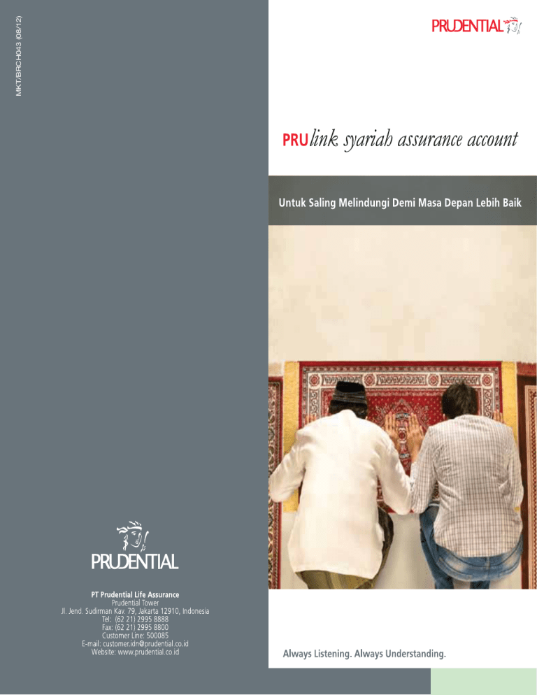 MKT/BRCH043 (08/12) Lebih dekat dengan PRUlink Apa itu PRUlink syariah assurance account “Manusia berencana, Tuhan yang menentukan. Dalam kehidupan banyak tahapan yang akan Anda lalui. Dapatkan perlindungan dalam mengarungi setiap tahapan kehidupan tersebut untuk Anda dan keluarga di jalan yang berkah” 1 Masa Kerja Produktif syariah assurance account ? PRUlink syariah assurance account adalah produk asuransi jiwa yang dikaitkan dengan investasi yang memberikan perlindungan sekaligus keuntungan berinvestasi yang sesuai dengan prinsip-prinsip syariah. Keistimewaan Prestasi gemilang dan keberhasilan usaha adalah tujuan Anda di masa kerja produktif 1. Manfaat Kematian (Death Benefit). Pernikahan 2 Pernikahan yang berkah, salah satu saat penting dalam hidup yang Anda dambakan 2. Manfaat Cacat Total dan Tetap (Total and Permanent Disability). 3. Dapat menambahkan nilai Uang Pertanggungan (Sum Assured) setiap saat. 4. Dapat melakukan penambahan kontribusi (Top-up) setiap saat. 3 5. Dapat menentukan sendiri besarnya komposisi dari nilai proteksi dan nilai investasi. Kelahiran Anak Kehadiran buah hati Anda, titipan Allah SWT, adalah kebahagiaan yang tidak ternilai 6. Dapat melakukan pengalihan dana (Fund Switching). 7. Pilihan manfaat asuransi tambahan (Riders) yang beragam. Pendidikan Anak 4 Pendidikan buah hati Anda mewujudkan impian hari depan mereka 8. Surplus Sharing*, dana yang akan diberikan kepada Pemegang Polis bila terdapat kelebihan dana dari rekening Tabarru'. Persyaratan Usia Masuk: 5 Masa Pensiun Nikmati masa pensiun Anda yang telah Anda persiapkan sejak dini 1. Pemegang Polis: minimal 21 tahun 2. Peserta: 1 - 70 tahun * Keterangan lengkap dapat dibaca di dalam buku Polis. Manfaat Utama 1. Memberikan perlindungan jiwa Seumur Hidup Biaya-biaya 2. Memberikan perlindungan terhadap Cacat Total dan Tetap • Sebagian kontribusi dialokasikan ke dalam unit dengan menggunakan harga unit yang berlaku saat itu. Harga unit dapat berubah mengikuti kinerja masing-masing dana investasi. Manfaat Tambahan: • Penilaian harga unit dilakukan setiap hari kerja, Senin sampai dengan Jumat, dengan mengacu pada harga pasar yang berlaku bagi instrumen investasi di mana dana investasi ditempatkan. Anda dapat menambahkan beragam manfaat Asuransi Tambahan (riders) pada produk PRUlink syariah assurance account untuk melengkapi perlindungan dalam setiap tahapan kehidupan Anda, sebagai berikut: • PRUcrisis cover syariah 34 • PRUcrisis cover benefit syariah 34 • PRUpersonal accident death syariah • PRUpersonal accident death & disablement syariah • PRUmed syariah • PRUhospital & surgical cover syariah • PRUwaiver syariah 33 • PRUpayor syariah 33 • PRUspouse waiver syariah 33 • PRUspouse payor syariah 33 • PRUparent payor syariah 33 • PRUlink term syariah • PRUmultiple crisis cover syariah • PRUcrisis income syariah • PRUearly stage crisis cover syariah • PRUjuvenile crisis cover syariah • Iuran Tabbaru’ ditentukan berdasarkan usia, jenis kelamin dan besarnya Uang Pertanggungan. • Biaya administrasi sebesar Rp 37.500 per bulan. • Bebas biaya pengalihan dana investasi (switching) di tahun Polis yang sama untuk 5 transaksi per tahun. Switching berikutnya di tahun Polis yang sama akan dikenakan biaya sebesar Rp 100.000 per transaksi. • Tidak ada biaya penarikan dana. • Kontribusi yang tidak dialokasikan ke dalam unit digunakan untuk membayar biaya wakalah dengan komposisi sebagai berikut: Tahun 1: 80% Tahun 2: 80% Tahun 3 - 5: 15% Tahun 6 dan seterusnya : 0% • Alokasi investasi untuk Top-up (PRUsaver syariah & tunggal) sebesar 95% per transaksi. • Ujrah sebesar maksimum 2% per tahun dari Nilai Aktiva Bersih (tergantung dari jenis dana investasi yang dipilih). • Setiap penarikan yang dilakukan sebelum Polis berjalan lebih dari 3 tahun akan dikenakan pajak penghasilan sesuai dengan peraturan perundang-undangan yang berlaku atas selisih Nilai Tunai terhadap total kontribusi yang dibayarkan. Peraturan perpajakan dapat berubah sesuai keputusan legislatif di luar kebijakan Prudential. Pilihan Dana Investasi Ilustrasi Manfaat Ada 3 macam pilihan dana investasi yang dapat Anda pilih, beserta profil risikonya masing-masing, sebagai berikut: Contoh: Ilustrasi manfaat Nilai Tunai untuk 20 tahun pertama Usia masuk 35 tahun. Kontribusi Dasar Rp 1.000.000,-/bulan. Uang Pertanggungan Rp 300.000.000. Pilihan dana investasi PRUlink Syariah Rupiah Equity Fund. Asumsi tingkat investasi 15% (asumsi tinggi). DANA INVESTASI PROFIL RISIKO PRUlink Syariah Rupiah Equity Fund Investasi saham, risiko tinggi Investasi seimbang, risiko sedang Investasi deposito dan obligasi, risiko sedang PRUlink Syariah Rupiah Cash & Bond Fund Manfaat (dalam Rp ‘000) PRUlink Syariah Rupiah Managed Fund Nilai Tunai 600,000 500,000 400,000 UP 300,000 200,000 100,000 0 Tahun 1 2 3 4 5 6 7 Usia masuk Performa PRUlink 9 10 11 12 13 14 15 16 17 18 19 20 Masa Usia 99 tahun Pertanggungan Manfaat pertanggungan jiwa: Uang Pertanggungan* + Nilai Tunai** Hasil investasi bersih rata-rata (%) per tahun 2011 (data per 31 Desember 2011) 2011 3 tahun terakhir Sejak diluncurkan PRUlink Syariah Rupiah Equity Fund 2,66% 34,32% 11,89% PRUlink Syariah Rupiah Managed Fund 4,26% 23,53% 12,20% PRUlink Syariah Rupiah Cash & Bond Fund 6,76% 11,31% 7,87% DANA INVESTASI 8 Catatan: Kinerja investasi di atas merupakan hasil pada tahun-tahun sebelumnya. Hasil pada saat mendatang bisa naik atau turun. Manfaat akhir kontrak: Nilai Tunai** Seluruh data dan perhitungan hanya sebatas ilustrasi dan bersifat tidak mengikat serta ketentuannya akan mengacu pada Polis asuransi yang berlaku. * Uang Pertanggungan (UP) dijamin. ** Kinerja dari PRUlink syariah tidak dijamin. Nilai investasi dapat lebih besar ataupun lebih kecil dari kontribusi yang diinvestasikan, tergantung dari risiko masing-masing jenis dana investasi. Pemegang Polis mengambil keputusan sepenuhnya untuk menempatkan alokasi dana PRUlink syariah yang memungkinkan optimalisasi tingka
