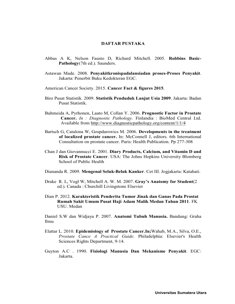 DAFTAR PUSTAKA Abbas A K, Nelson Fausto D, Richard Mitchell. 2005. Robbins BasicPathology(7th ed.). Saunders. Astawan Made. 2008. Penyakitkronispadalansiadan proses-Proses Penyakit. Jakarta: Penerbit Buku Kedokteran EGC. American Cancer Society. 2015. Cancer Fact & figures 2015. Biro Pusat Statistik. 2009. Statistik Penduduk Lanjut Usia 2009. Jakarta: Badan Pusat Statistik. Buhmeida A, Pyrhonen, Laato M, Collan Y. 2006. Prognostic Factor in Prostate Cancer. In : Diagnostic Pathology. Finlandia : BioMed Central Ltd. Available from http://www.diagnosticpathology.org/content/1/1/4 Bartsch G, Catalona W, Gospdarowics M. 2006. Developments in the treatment of localized prostate cancer. In: McConnell J, editors. 6th International Consultation on prostate cancer. Paris: Health Publication. Pp 277-308 Chan J dan Giovannucci E. 2001. Diary Products, Calcium, and Vitamin D and Risk of Prostate Cancer. USA: The Johns Hopkins University Blomberg School of Public Health Diananda R. 2009. Mengenal Seluk-Beluk Kanker. Cet III. Jogjakarta: Katahati. Drake R. L, Vogl W, Mitchell A. W. M. 2007. Gray’s Anatomy for Student(2 ed.). Canada : Churchill Livingstone Elsevier Dian P. 2012. Karakteristik Penderita Tumor Jinak dan Ganas Pada Prostat Rumah Sakit Umum Pusat Haji Adam Malik Medan Tahun 2011. FK USU. Medan Daniel S.W dan Widjaya P. 2007. Anatomi Tubuh Manusia. Bandung: Graha Ilmu Elattar L. 2010. Epidemiology of Prostate Cancer.In;Wahab, M.A., Silva, O.E., Prostate Cance A Practical Guide. Philadelphia: Elsevier's Health Sciences Rights Department, 9-14. Guyton A.C . 1990. Fisiologi Manusia Dan Mekanisme Penyakit. EGC: Jakarta. Universitas Sumatera Utara Gundhowiardjo S dan Julius A P. 2015. Radioterapi & Onkologi Indonesia. Vol.6 Guyton A. C dan Hall J. E. 2014. Buku Ajar Fisiologi Kedokteran(11 ed.). Philadelphia: Elsevier. Haas G. P dan Wael A. S. 1997. Epidemiology of Prostate Cancer. CA – A `Cancer Journal for Clinicians. 47 (5) : 273 – 287 Homma Y, Gotoh M, Yokoyama O, Masumori N, Kawauchi A, Yamanishi T, Ishizuka O, Seki N, Kamoto T, Nagai A, Ozono S. 2011. Outline of JUA Clinical Guidelines For Benign Prostatic Hyperplasia. Japanese Urological Association. Isselbacher Kurt J. 2000. Horison Prinsip-Prinsip Ilmu Penyakit Dalam. Jakarta: EGC Jemal A, Tiwari R C, Murray T, Ghafoor A, Ward E et al. 2004. Cancer statistics, CA Cancer J. Clin. (2004); 54: pp. 8-29. Junaidi F. 2012. Hubungan Antara Grading Histopatologi (Gleason Score) dan Level PSA pada Kanker Prostat di Rumah Sakit Umum Pusat H. Adam Malik Medan.Medan: Universitas Sumatera Utara. Jong win de dan Sjamsuhidajat R. 2004. Buku Ajar Ilmu Bedah,Edisi II. Jakarta: EGC. ________, 2010. Buku Ajar Ilmu Bedah,Edisi III. Jakarta: EGC. Jong Win de. 2005. Kanker, Apakah Itu? Pengobatan, Harapan Hidup, dan Dukungan Keluarga. Jakarta: Arcan. Kemenkes RI. 2015. Indonesian Society of Urologic Oncology (ISUO) meeting. 2011. http://www..nationalplanningcycles.org Kemenkes RI. 2012. Gambaran Penyakit Tidak Menular Di Rumah Sakit Di Indonesia Tahun 2009 dan 2010.http://www..nationalplanningcycles.org Kresno S.B. 2001.Imunologi: Diagnosis dan prosedur LaboratoriumEdisi IV, Fakultas Kedokteran UI Press, Jakarta. Kim HL dan Steinberg GD. 2000. New insights and candidate genes and their implication for care of patient with hereditary prostate cancer. Curr Urol Rep 1:9. Mansjoer Arif, Kuspuji Triyanti, Rakhmi Syafitri, Wahyu Ika Wardhani,Wiwik Setiowulan. 2000. Kapita selekta kedokteran. Edisi ke 3. Jakarta: Penerbit Media Aesculapius, FKUI. Universitas Sumatera Utara Mireille J Broders. 2008, Screening for prostate cancer in Dutch hereditary prostate cancer families. J. Cancer :Vol 122, 871–876. 2008 McNeal JE. 1988. Normal Histology of the Prostate. Am J Surg Pathol 12(8):619- 633 Moyad MA. 2002. Selenium and vitamin E supplements of prostate cancer: Evidence or embellishment? Urology 59:9. McLaughlin, Leonard M. Schuman, Erik Bjelke, Gloria Gridley, Sholom Wacholder.1990. Diet, Tobacco Use, and Fatal Prostate Cancer: Results from the Lutheran Brotherhood Cohort Study, National Cancer Institute. Cancer Research 50. 6836-6840. O Reilly. 1999. Aetiology and Pathology of Prostate Cancer: Vol. 6. Pienta. 2000. Etiology, Epidemiology, and Prevention of Carcinoma of the Prostate. /n.Walsh, P.C., Reti, A.B.,Vaughn, E.D., Wein A.J. (eds). CampbelFs Urology 7th ed.Philadelphia.W.B.Saunder Co.p.248996.dalam Umar dan Agoes, 2002. Purnomo B.B. 2011. Dasar-dasar Urologi. Edisi III. Jakarta: Sagung Seto. Putriyuni A dan Hilbertina N. 2014. Adenokarsinoma prostat : Penilaian Prognostik Dan Derajat Histopatologi Berdasarkan The 2005 Gleason Isup Modified System (Adenokarsinoma Prostat Yang Didiagnosis Di Laboratorium Patologi Anatomi Periode 2010-2012.). Padang: Jurnalmka, Fakultas Kedokteran Andalas. Physicians Commite for Responsible Medicine (PCRM). 2012. http://www.nutritio nnd.org/oncology/protate.cancer.html.Wasington,DC.AS. Presti J.C. 2004. Neoplasms of the Prostate Cancer.In: Tanagho, E.A., McAninch, `J.W., Smith’s General Urology, Sixteenth edition. USA: The McGraw-Hill Companies, 367-384. Ragunathan Nageenthren A/L. 2015. Gambaran Pasien Kanker Prostat Di RSUP H. Adam Malik Medan Dari Januari 2012–Desember 2013. Skripsi. Medan: FK USU. Roehrborn C. G. 2013. Benign Prostate Hyperplasia. In: Campbell-Walsh Urology. 10th ed. Elsevier Inc. Suyono J dan Wijaya C. 1995. Deteksi Dini Penyakit Akibat Kerja, Cet II. Jakarta: EGC Universitas Sumatera Utara Surveillance, Epidemiology, and End Results (SEER) Program (www.seer.cancer.gov) SEER∗Stat Database: Incidence—SEER 9 Regs Limited-Use, Nov 2006 Sub (1973–2005), National Cancer Institute, DCCPS, Surveillance Research Program, Cancer Statistics Branch, released April 2008, based onthe November 2007 submission. Slone Ethel. 2003. Anatomi dan fisiologi Untuk Pemula. Cet I, EGC, Jakarta. Supriyanto Wawan. 2010. Ancaman Penyakit Kanker Deteksi dini dan Pengobatannya. Yogyakarta : Cahaya Ilmu. WHO. 2010. Pro
