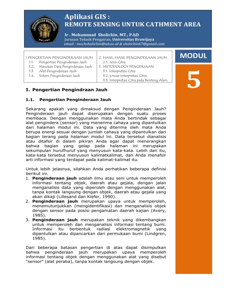Aplikasi GIS : REMOTE SENSING UNTUK CATHMENT AREA Ir . Mohammad Sholichin, MT., P.hD Jurusan Teknik Pengairan, Universitas Brawijaya email : mochsholichin@ub.ac.id & sholichin67@gmail.com 1. 2. 3. I PENGERTIAN PENGINDERAAN JAUH 4. 1.1. Pengertian Penginderaan Jauh 1.2. Masukan Data Penginderaan Jauh 1.3. Alat Penginderaan Jauh 1.4. Sistem Penginderaan Jauh 2. HASIL-HASIL PENGINDERAAN JAUH 2.1. Jenis Citra 5. METODOLOGY PENGERJAAN 3.1. Interpretasi Citra 3.2. Unsur Interpretasi Citra 3.3. Interpretasi Citra pada Benteng Alam I. Pengertian Pengindraan Jauh 1.1. Pengertian Penginderaan Jauh Sekarang apakah yang dimaksud dengan Penginderaan Jauh? Penginderaan jauh dapat diserupakan dengan suatu proses membaca. Dengan menggunakan mata Anda bertindak sebagai alat pengindera (sensor) yang menerima cahaya yang dipantulkan dari halaman modul ini. Data yang diterima oleh mata Anda berupa energi sesuai dengan jumlah cahaya yang dipantulkan dari bagian terang pada halaman modul ini. Data tersebut dianalisis atau ditafsir di dalam pikiran Anda agar dapat menerangkan bahwa bagian yang gelap pada halaman ini merupakan sekumpulan hurufhuruf yang menyusun kata-kata. Lebih dari itu, kata-kata tersebut menyusun kalimatkalimat, dan Anda menafsir arti informasi yang terdapat pada kalimat-kalimat itu. Untuk lebih jelasnya, silahkan Anda perhatikan beberapa definisi berikut ini. 1. Penginderaan jauh adalah ilmu atau seni untuk memperoleh informasi tentang objek, daerah atau gejala, dengan jalan menganalisis data yang diperoleh dengan menggunakan alat, tanpa kontak langsung dengan objek, daerah atau gejala yang akan dikaji (Lillesand dan Kiefer, 1990). 2. Penginderaan jauh merupakan upaya untuk memperoleh, menemutunjukkan (mengidentifikasi) dan menganalisis objek dengan sensor pada posisi pengamatan daerah kajian (Avery, 1985). 3. Penginderaan jauh merupakan teknik yang dikembangkan untuk memperoleh dan menganalisis informasi tentang bumi. Informasi itu berbentuk radiasi elektromagnetik yang dipantulkan atau dipancarkan dari permukaan bumi (Lindgren, 1985). Dari beberapa batasan pengertian di atas dapat disimpulkan bahwa penginderaan jauh merupakan upaya memperoleh informasi tentang objek dengan menggunakan alat yang disebut “sensor” (alat peraba), tanpa kontak langsung dengan objek. MODUL 5 Mata Kuliah / MateriKuliah Brawijaya University 2012 Dengan kata lain dapat dinyatakan bahwa penginderaan jauh merupakan upaya untuk memperoleh data dari jarak jauh dengan menggunakan peralatan tertentu. Data yang diperoleh itu kemudian dianalisis dan dimanfaatkan untuk berbagai keperluan. Data yang diperoleh dari penginderaan jauh dapat berbentuk hasil dari variasi daya, gelombang bunyi atau energi elektromagnetik. Sebagai contoh grafimeter memperoleh data dari variasi daya tarik bumi (gravitasi), sonar pada sistem navigasi memperoleh data dari gelombang bunyi dan mata kita memperoleh data dari energi elektromagnetik. (Tentang tiga hal ini akan diuraikan lebih lanjut pada bagian lain). Jadi penginderaan jauh merupakan pemantauan terhadap suatu objek dari jarak jauh dengan tidak melakukan kontak langsung dengan objek tersebut. 1.2. Masukan Data Penginderaan Jauh Dalam penginderaan jauh didapat masukan data atau hasil observasi yang disebut citra. Citra dapat diartikan sebagai gambaran yang tampak dari suatu objek yang sedang diamati, sebagai hasil liputan atau rekaman suatu alat pemantau. Sebagai contoh, memotret bunga di taman. Foto bunga yang berhasil kita buat itu merupakan citra bunga tersebut. Menurut Simonett (1983): bahwa citra sebagai gambaran rekaman suatu objek (biasanya berupa suatu gambaran pada foto) yang didapat dengan cara optik, elektro optik, optik mekanik atau elektronik. Di dalam bahasa Inggris terdapat dua istilah yang berarti citra dalam bahasa Indonesia, yaitu “image” dan “imagery”, akan tetapi istilah imagery dirasa lebih tepat penggunaannya (Susanto, 1986). Agar dapat dimanfaatkan maka citra tersebut harus diinterpretasikan atau diterjemahkan/ditafsirkan terlebih dahulu. Interpretasi citra merupakan kegiatan mengkaji foto udara dan atau citra dengan maksud untuk mengidentifikasi objek dan menilai arti pentingnya objek tersebut (Estes dan Simonett, 1975). Singkatnya interpretasi citra merupakan suatu proses pengenalan objek yang berupa gambar (citra) untuk digunakan dalam disiplin ilmu tertentu seperti Geologi, Geografi, Ekologi, Geodesi dan disiplin ilmu lainnya. Dalam menginterpretasikan citra dibagi menjadi beberapa tahapan, yaitu: • Deteksi ialah pengenalan objek yang mempunyai karakteristik tertentu oleh sensor. • Identifikasi ialah mencirikan objek dengan menggunakan data rujukan. • Analisis ialah mengumpulkan keterangan lebih lanjut secara terinci. 1.2. Alat Penginderaan Jauh Untuk melakukan penginderaan jarak jauh diperlukan alat sensor, alat pengolah data dan alat-alat lainnya sebagai pendukung. Oleh karena sensor tidak ditempatkan pada objek, maka perlu adanya wahana atau alat sebagai tempat untuk meletakkan sensor. Wahana tersebut dapat berupa balon udara, pesawat terbang, satelit atau wahana lainnya (lihat gambar 1.1). Antara sensor, wahana, dan citra diharapkan selalu berkaitan, karena hal itu akan menentukan skala citra yang dihasilkan. 98 Mata Kuliah / MateriKuliah Brawijaya University 2012 Gambar 1.1. Wahana Penginderaan Jauh (Lindgren, 1985). Dengan menggunakan wahana seperti di atas itulah maka alat penginderaan jauh ditempatkan. Semakin tinggi letak sensor maka daerah yang terdeteksi atau yang dapat diterima oleh sensor semakin luas. Jadi jangkauan penginderaannya semakin luas seperti digambarkan pada gambar 1.2. Gambar 1.2. Konsep multitingkat (berdasarkan uraian National Academy of Sciences, 1977) Keterangan: I. Satelit dengan orbit 200 - 36.000 km; II. Pesawat yang terbang rendah (> 15 km); III. Pesawat yang terbang rendah (9 – 15 km); IV. Pesawat yang terbang rendah (< 9 km). (Sumber: Drs. Suryantoro MS, IKIP Malang). Alat sensor dalam penginderaan jauh dapat