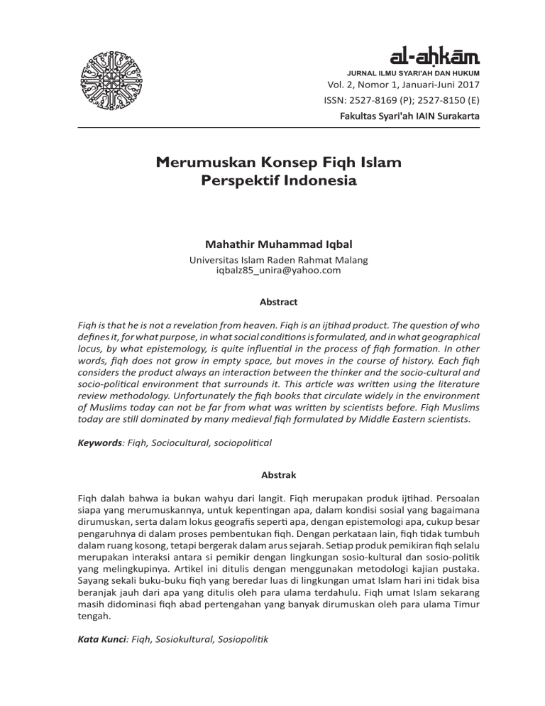 JURNAL ILMU SYARI'AH DAN HUKUM Vol. 2, Nomor 1, Januari-Juni 2017 ISSN: 2527-8169 (P); 2527-8150 (E) Fakultas Syari'ah IAIN Surakarta Merumuskan Konsep Fiqh Islam Perspektif Indonesia Mahathir Muhammad Iqbal Universitas Islam Raden Rahmat Malang iqbalz85_unira@yahoo.com Abstract Fiqh is that he is not a revelation from heaven. Fiqh is an ijtihad product. The question of who defines it, for what purpose, in what social conditions is formulated, and in what geographical locus, by what epistemology, is quite influential in the process of fiqh formation. In other words, fiqh does not grow in empty space, but moves in the course of history. Each fiqh considers the product always an interaction between the thinker and the socio-cultural and socio-political environment that surrounds it. This article was written using the literature review methodology. Unfortunately the fiqh books that circulate widely in the environment of Muslims today can not be far from what was written by scientists before. Fiqh Muslims today are still dominated by many medieval fiqh formulated by Middle Eastern scientists. Keywords: Fiqh, Sociocultural, sociopolitical Abstrak Fiqh dalah bahwa ia bukan wahyu dari langit. Fiqh merupakan produk ijtihad. Persoalan siapa yang merumuskannya, untuk kepentingan apa, dalam kondisi sosial yang bagaimana dirumuskan, serta dalam lokus geografis seperti apa, dengan epistemologi apa, cukup besar pengaruhnya di dalam proses pembentukan fiqh. Dengan perkataan lain, fiqh tidak tumbuh dalam ruang kosong, tetapi bergerak dalam arus sejarah. Setiap produk pemikiran fiqh selalu merupakan interaksi antara si pemikir dengan lingkungan sosio-kultural dan sosio-politik yang melingkupinya. Artikel ini ditulis dengan menggunakan metodologi kajian pustaka. Sayang sekali buku-buku fiqh yang beredar luas di lingkungan umat Islam hari ini tidak bisa beranjak jauh dari apa yang ditulis oleh para ulama terdahulu. Fiqh umat Islam sekarang masih didominasi fiqh abad pertengahan yang banyak dirumuskan oleh para ulama Timur tengah. Kata Kunci: Fiqh, Sosiokultural, Sosiopolitik Mahathir Muhammad Iqbal 2 A.Pendahuluan Sejak abad VII Masehi fiqh berada pada puncak kesakralan dan kemapanan. Orientasi keberagamaan umat selalu merujuk pada fiqh sebagai justifikasi keselamatan dan kesesatan. Sebagai rujukan hukum, fiqh tampak subjektif, hitam-putih, benar-salah, dan halal-haram. Dengan logika ini kreativitas dan kebebasan manusia menjadi hal yang mahal. Ortodoksi fiqh dijaga betul melalui elemen-elemen “kekuasaan” sehingga dapat terus bertahan dalam kemerdekaannya. Gerakan menjaga otoritas fiqh yang cukup massif, misalnya, dengan memunculkan “kampanye” tertutupnya pintu ijtihad. Gerakan ini jelas, mengorientasikan (memaksa) orang untuk senantiasa tunduk pada produk pemahaman keagamaan puluhan abad silam dan menisbikan hentakan gelombang zaman. Kesalahpahaman terjadi, pemeluk teguh ortodoksi fiqh jatuh pada pemahaman dan keyakinan fiqh sebagai syariat yang taken for granted, tak boleh digoyahkan. Dalam bahasa yang lain, fiqh sebagai produk intelektual pada masa dan dalam konteks tertentu yang bersifat dinamis kini berubah menjadi stagnan serta kaku.1Memang ortodoksi fiqh sedikit demi sedikit mulai mencair. Namun belumlah menjadi trend yang mainstream. Perlawanan terhadap pembuka jalan ijtihad bergentayangan disana-sini. Upaya pembaruaan pemaknaan dan penafsiran terhadap ajaran agama (Al-Quran dan Hadits) terus mendapatkan tekanan. Salah satu ciri menonjol produk “mujadid baru” adalah selalu mengorientasikan pada kemaslahatan umat. Orientasi ini meniscayakan perkembangan zaman menjadi rujukan penting dalam mamahami dan menafsirkan ajaran Allah. Lebih dari itu, prinsip ini membalik logika fiqh klasik bahwa “agama bagi Tuhan” kepada logika keumatan: “agama bagi manusia”. Oleh karena itu, pintu ijtihad dan penakwilan terhadap ayat-ayat Al-Quran tidak akan pernah tertutup.2 B. Sekilas Tentang Definisi Fiqh Yang dimaksud dengan fiqh dalam tulisan ini adalah kitab-kitab yang menjelaskan tentang hukum-hukum ‘amali yang bersifat praktis sebagai produk dari aktivitas ijtihad para ulama. (al-ahkam al-syar’iyyah al-amaliyyah al-muktasab min adillatiha al-tafsiliyyah).3 Buku-buku fiqh tersebut dalam waktu yang cukup lama menguasai percakapan dan diskursus 1 Fajar Kurnianto, Tiga Sebab kemandekan Fiqh,Jawa Pos,7 Maret 2004,hlm. 4. 2 Muhammad Salman Ghanim,Kritik Ortodoksi: Tafsir Ayat Ibadah, Politik dan Feminisme, (Yogyakarta: LKiS, 2000), hlm. vii-viii. 3 Abdul Moqsith Ghazali,“Reorientasi Istinbath NU dan Operasionalisasi Ijtihad Jama’i” dalam Imdadun Rahmat, “Kritik nalar Fikih NU: Transformasi Paradigma Bahtsul Matsa’il”, (Jakarta: lakpesdam NU, 2002), hlm. 87-88. ~ Vol. 2, Nomor 1, Januari-Juni 2017 Merumuskan Konsep Fiqh Islam3 pemikiran Islam, hingga akhirnya ia menjadi sentral dan rujukan utama umat Islam. Fiqh dianggap sebagai penjelasan paling otoritatif menyangkut Islam. Setiap aktivitas umat baik yang personal maupun publik selalu dicari ketentuan hukumnya di dalam fiqh. Itu sebabnya fiqh tidak hanya berbicara hal-hal yang terkait dengan ritus peribadatan, makanan dan minuman yang halal, dan urusan keluarga. Pembicaraan fiqh bahkan bisa melebar ke soalsoal politik, ekonomi dan sosial. Bahkan, tidak hanya berbicara tentang perkara empiris yang riil terjadi masyarakat, fiqh juga memberi jawaban terhadap soal-soal yang diandaikan terjadi. Fiqh merespons semua soal kehidupan sehingga harus di cek terus-menerus apakah jawaban yang diberikannya itu sudah memadai atau justru menjadi blunder, sebab jawaban fiqh kerapkali tak ditunjang dengan argumentasi yang kokoh. Buku-buku fiqh kadang tak lebih dari sebuah antologi dari pikiran superfisial sejumlah para ulama yang tercerai berai dimana-mana. Abdul Moqsith Ghazali, misalnya, berpendapat bahwa buku fiqh amat jarang menjelaskan kerangka metodologi yang dipakainya. Ini mungkin karena secara metodologis sebagian besar fiqh memang mengikuti sa