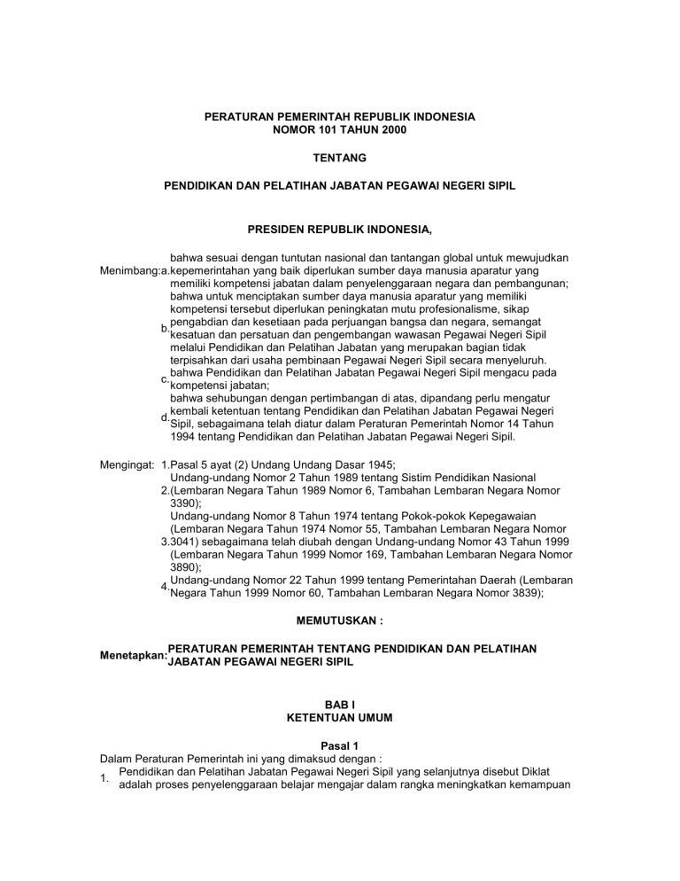 PERATURAN PEMERINTAH REPUBLIK INDONESIA NOMOR 101 TAHUN 2000 TENTANG PENDIDIKAN DAN PELATIHAN JABATAN PEGAWAI NEGERI SIPIL PRESIDEN REPUBLIK INDONESIA, bahwa sesuai dengan tuntutan nasional dan tantangan global untuk mewujudkan Menimbang:a.kepemerintahan yang baik diperlukan sumber daya manusia aparatur yang memiliki kompetensi jabatan dalam penyelenggaraan negara dan pembangunan; bahwa untuk menciptakan sumber daya manusia aparatur yang memiliki kompetensi tersebut diperlukan peningkatan mutu profesionalisme, sikap pengabdian dan kesetiaan pada perjuangan bangsa dan negara, semangat b. kesatuan dan persatuan dan pengembangan wawasan Pegawai Negeri Sipil melalui Pendidikan dan Pelatihan Jabatan yang merupakan bagian tidak terpisahkan dari usaha pembinaan Pegawai Negeri Sipil secara menyeluruh. bahwa Pendidikan dan Pelatihan Jabatan Pegawai Negeri Sipil mengacu pada c. kompetensi jabatan; bahwa sehubungan dengan pertimbangan di atas, dipandang perlu mengatur kembali ketentuan tentang Pendidikan dan Pelatihan Jabatan Pegawai Negeri d. Sipil, sebagaimana telah diatur dalam Peraturan Pemerintah Nomor 14 Tahun 1994 tentang Pendidikan dan Pelatihan Jabatan Pegawai Negeri Sipil. Mengingat: 1.Pasal 5 ayat (2) Undang Undang Dasar 1945; Undang-undang Nomor 2 Tahun 1989 tentang Sistim Pendidikan Nasional 2.(Lembaran Negara Tahun 1989 Nomor 6, Tambahan Lembaran Negara Nomor 3390); Undang-undang Nomor 8 Tahun 1974 tentang Pokok-pokok Kepegawaian (Lembaran Negara Tahun 1974 Nomor 55, Tambahan Lembaran Negara Nomor 3.3041) sebagaimana telah diubah dengan Undang-undang Nomor 43 Tahun 1999 (Lembaran Negara Tahun 1999 Nomor 169, Tambahan Lembaran Negara Nomor 3890); Undang-undang Nomor 22 Tahun 1999 tentang Pemerintahan Daerah (Lembaran 4. Negara Tahun 1999 Nomor 60, Tambahan Lembaran Negara Nomor 3839); MEMUTUSKAN : Menetapkan: PERATURAN PEMERINTAH TENTANG PENDIDIKAN DAN PELATIHAN JABATAN PEGAWAI NEGERI SIPIL BAB I KETENTUAN UMUM Pasal 1 Dalam Peraturan Pemerintah ini yang dimaksud dengan : Pendidikan dan Pelatihan Jabatan Pegawai Negeri Sipil yang selanjutnya disebut Diklat 1. adalah proses penyelenggaraan belajar mengajar dalam rangka meningkatkan kemampuan 2. 3. 4. 5. 6. 7. 8. 9. 10. Pegawai Negeri Sipil. Calon Pegawai Negeri Sipil yang selanjutnya disebut CPNS adalah Warga Negara Indonesia yang melamar, lulus seleksi dan diangkat untuk diupersiapkan menjadi Pegawai Negeri Sipil sesuai dengan ketentuan peraturan Perundang-undangan yang berlaku. Pegawai Negeri Sipil yang selanjutnya disebut PNS adalah PNS sebagaimana dimaksud dalam Undang-undang Nomor 8 Tahun 1974 tentang Pokok-pokok Kepegawaian sebagaimana telah diubah dengan Undang-undang Nomor 43 Tahun 1999. Jabatan adalah kedudukan yang menunjukkan tugas, tanggung jawab, wewenang dan hak seseorang PNS dalam suatu satuan organisasi negara. Pejabat pembina kepegawaian adalah Menteri, Jaksa Agung, Kepala Kepolisian Negara, Pimpinan Lembaga Pemerintah Non Departemen, Sekretaris Negara, Sekretaris Kabinet, Sekretaris Militer, Sekretaris Presiden, Sekretaris Wakil Presiden, Pimpinan Kesekretariatan Lembaga Tertinggi/Tinggi Negara, Gubernur dan Bupati/Walikota. Instansi Pengendali Diklat yang selanjutnya disebut Instansi Pengendali adalah Badan Kepegawaian Negara.yang secara fungsional bertanggung jawab atas pengembangan dan pengawasan standar kompetensi jabatan serta pengendalian pemanfaatan lulusan Diklat. Instansi Pembina Diklat yang selanjutnya disebut Instansi Pembina adalah Lembaga Administrasi Negara yang secara fungsional bertanggung jawab atas pengaturan, koordinasi dan penyelenggaraan Diklat.. Instansi Pembina Jabatan Fungsional adalah lembaga pemerintah yang bertanggung jawab atas pembinaan Jabatan Fungsional menurut peraturan perundang-undangan yang berlaku. Widyaiswara adalah PNS yang diangkat sebagai pejabat fungsional oleh Pejabat yang berwenang dengan tugas, tanggung jawab, wewenang untuk mendidik, mengajar dan / atau melatih PNS pada lembaga Diklat Pemerintah.. Lembaga Diklat Pemerintah Non Departemen, Kesekretariatan Lembaga Tertinggi/Tinggi Negara dan Perangkat Daerah yang bertugas melakukan pengelolaan Diklat. BAB II TUJUAN DAN SASARAN DIKLAT Pasal 2 Diklat bertujuan : meningkatkan pengetahuan, keahlian, keterampilan dan sikap untuk dapat melaksanakan a. tugas jabatan secara profesional dengan dilandasi kepribadian dan etika PNS sesuai dengan kebutuhan instansi; menciptakan aparatur yang mampu berperan sebagai pembaharu dan perekat persatuan dan b. kesatuan bangsa; memantapkan sikap dan semangat pengabdian yang berorientasi pada pelayanan, c. pengayoman dan pemberdayaan masyarakat; menciptakan kesamaan visi dan dinamika pola pikir dalam melaksanakan tugas d. pemerintahan umum dan pembangunan demi terwujudnya kepemerintahan yang baik. Pasal 3 Sasaran Diklat adalah terwujudnya PNS yang memiliki kompetensi yang sesuai dengan persyaratan jabatan masing-masing. BAB III JENIS DAN JENJANG DIKLAT Pasal 4 Jenis Diklat terdiri dari : a. Diklat Prajabatan; b. Diklat Dalam Jabatan. Pasal 5 (1) Diklat Prajabatan merupakan syarat pengangkatan CPNS menjadi PNS (2) Diklat Prajabatan terdiri dari : a. Diklat Prajabatan Golongan I untuk menjadi PNS Golongan I; b. Diklat Prajabatan Golongan II untuk menjadi PNS Golongan II; c. Diklat Prajabatan Golongan III untuk menjadi PNS Golongan III. Pasal 6 CPNS wajib diikutsertakan dalam Diklat Prajabatan selambat-lambatnya 2 (dua) tahun setelah (1) pengangkatannya sebagai CPNS. (2) CPNS wajib mengikuti dan lulus Diklat Prajabatan untuk diangkat sebagai PNS. Pasal 7 Diklat Prajabatan dilaksanakan untuk memberikan pengetahuan dalam rangka pembentukan wawasan kebangsaan, kepribadian dan etika PNS, disamping pengetahuan dasar tentang sistem penyelenggaraan pemerintahan negara, bidang tugas dan budaya organisasinya agar mampu melaksanakan tugas dan perannya sebagai pelayan masyarakat. Pasal 8 Diklat Dalam Jabatan dilaksanakan untuk mengembangkan pengetahuan, keterampilan dan (1) sikap PNS agar dapat melaksanakan tugas