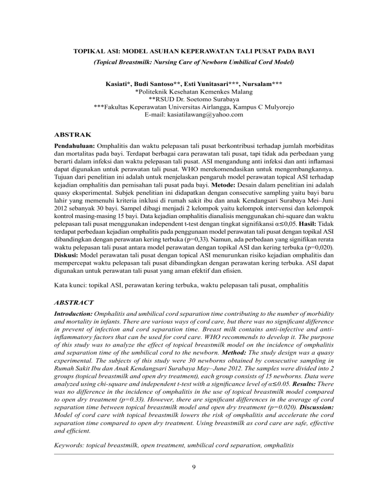 TOPIKAL ASI: MODEL ASUHAN KEPERAWATAN TALI PUSAT PADA BAYI (Topical Breastmilk: Nursing Care of Newborn Umbilical Cord Model) Kasiati*, Budi Santoso**, Esti Yunitasari***, Nursalam*** *Politeknik Kesehatan Kemenkes Malang **RSUD Dr. Soetomo Surabaya ***Fakultas Keperawatan Universitas Airlangga, Kampus C Mulyorejo E-mail: kasiatilawang@yahoo.com ABSTRAK Pendahuluan: Omphalitis dan waktu pelepasan tali pusat berkontribusi terhadap jumlah morbiditas dan mortalitas pada bayi. Terdapat berbagai cara perawatan tali pusat, tapi tidak ada perbedaan yang berarti dalam infeksi dan waktu pelepasan tali pusat. ASI mengandung anti infeksi dan anti inflamasi dapat digunakan untuk perawatan tali pusat. WHO merekomendasikan untuk mengembangkannya. Tujuan dari penelitian ini adalah untuk menjelaskan pengaruh model perawatan topical ASI terhadap kejadian omphalitis dan pemisahan tali pusat pada bayi. Metode: Desain dalam penelitian ini adalah quasy eksperimental. Subjek penelitian ini didapatkan dengan consecutive sampling yaitu bayi baru lahir yang memenuhi kriteria inklusi di rumah sakit ibu dan anak Kendangsari Surabaya Mei–Juni 2012 sebanyak 30 bayi. Sampel dibagi menjadi 2 kelompok yaitu kelompok intervensi dan kelompok kontrol masing-masing 15 bayi. Data kejadian omphalitis dianalisis menggunakan chi-square dan waktu pelepasan tali pusat menggunakan independent t-test dengan tingkat signifikansi α≤0,05. Hasil: Tidak terdapat perbedaan kejadian omphalitis pada penggunaan model perawatan tali pusat dengan topikal ASI dibandingkan dengan perawatan kering terbuka (p=0,33). Namun, ada perbedaan yang signifikan rerata waktu pelepasan tali pusat antara model perawatan dengan topikal ASI dan kering terbuka (p=0,020). Diskusi: Model perawatan tali pusat dengan topical ASI menurunkan risiko kejadian omphalitis dan mempercepat waktu pelepasan tali pusat dibandingkan dengan perawatan kering terbuka. ASI dapat digunakan untuk perawatan tali pusat yang aman efektif dan efisien. Kata kunci: topikal ASI, perawatan kering terbuka, waktu pelepasan tali pusat, omphalitis ABSTRACT Introduction: Omphalitis and umbilical cord separation time contributing to the number of morbidity and mortality in infants. There are various ways of cord care, but there was no significant difference in prevent of infection and cord separation time. Breast milk contains anti-infective and antiinflammatory factors that can be used for cord care. WHO recommends to develop it. The purpose of this study was to analyze the effect of topical breastmilk model on the incidence of omphalitis and separation time of the umbilical cord to the newborn. Method: The study design was a quasy experimental. The subjects of this study were 30 newborns obtained by consecutive sampling in Rumah Sakit Ibu dan Anak Kendangsari Surabaya May–June 2012. The samples were divided into 2 groups (topical breastmilk and open dry treatment), each group consists of 15 newborns. Data were analyzed using chi-square and independent t-test with a significance level of α≤0.05. Results: There was no difference in the incidence of omphalitis in the use of topical breastmilk model compared to open dry treatment (p=0.33). However, there are significant differences in the average of cord separation time between topical breastmilk model and open dry treatment (p=0.020). Discussion: Model of cord care with topical breastmilk lowers the risk of omphalitis and accelerate the cord separation time compared to open dry treatment. Using breastmilk as cord care are safe, effective and efficient. Keywords: topical breastmilk, open treatment, umbilical cord separation, omphalitis 9 Jurnal Ners Vol. 8 No. 1 April 2013: 9–16 berkembang. Bukti dari tinjauan sistematik oleh Zupan et al. (2004) menyimpulkan bahwa tidak ada perbedaan bermakna kejadian infeksi antara pemberian antibiotik atau antiseptik pada perawatan tali pusat dibanding dengan perawatan kering. Upaya pencegahan infeksi tali pusat dan tetanus neonatorum berkontribusi terhadap angka morbiditas dan mortalitas. Salah satu tindakan pencegahan adalah dengan perawatan dini tali pusat yang baik, benar dan aman selama di rumah sakit maupun di rumah. Pelepasan tali pusat harus terjadi dalam 5 sampai 15 hari, meski dapat saja pelepasan berlangsung lama pada penggunaan antiseptik dan infeksi tali pusat atau omphalitis. Perawatan tali pusat menggunakan cara tradisional akan lebih baik dari pada memberikan bahan yang berbahaya pada tali pusat. Salah satu intervensi yang dapat di lakukan oleh perawat sebagai caring adalah dengan memberikan asuhan keperawatan pada bayi di rumah sakit maupun setelah pulang dengan pendekatan model perawatan topikal air susu ibu (ASI). Model asuhan perawatan topikal ASI pada tali pusat pada bayi dapat mencegah omphalitis dan mempercepat pelepasan tali pusat pada bayi lahir. Model asuhan perawatan topikal ASI pada tali pusat merupakan bentuk peran yang dikembangkan perawat dalam hal meningkatkan kepercayaan – harapan (faith – hope) untuk proses carative dan curative dengan alternatif (Watson, 1989). ASI mengandung imunoglobulin A, G dan M sebagai anti infeksi, sedangkan non immunoglobulin pada ASI seperti lactoferin dan lisozim berfungsi sebagai anti bakteri, anti virus atau anti mikroba yang menyebabkan anti inflamasi atau anti radang. Pendekatan carative dan berpikir kritis yang dikembangkan melalui perawatan tali pusat dengan ASI adalah sebagai praktek perawatan tali pusat yang tidak berbahaya, gratis, tersedia dan steril untuk melindungi bayi dari infeksi tali pusat. WHO menyarankan hal yang sama untuk diteliti. Mullany (2003) berpendapat bahwa ASI mempunyai banyak agen imunologis, bahan anti inflamsi dan antimikroba. PENDAHULUAN Omphalitis atau infeksi tali pusat disebabkan oleh bakteri yang memasuki tubuh melalui tali pusat pada bayi. Bakteri dapat masuk akibat dari pemotongan tali pusat dengan instrumen yang tidak steril, kontak kulit ke kulit, teknik cuci tangan yang tidak benar, perawatan ta