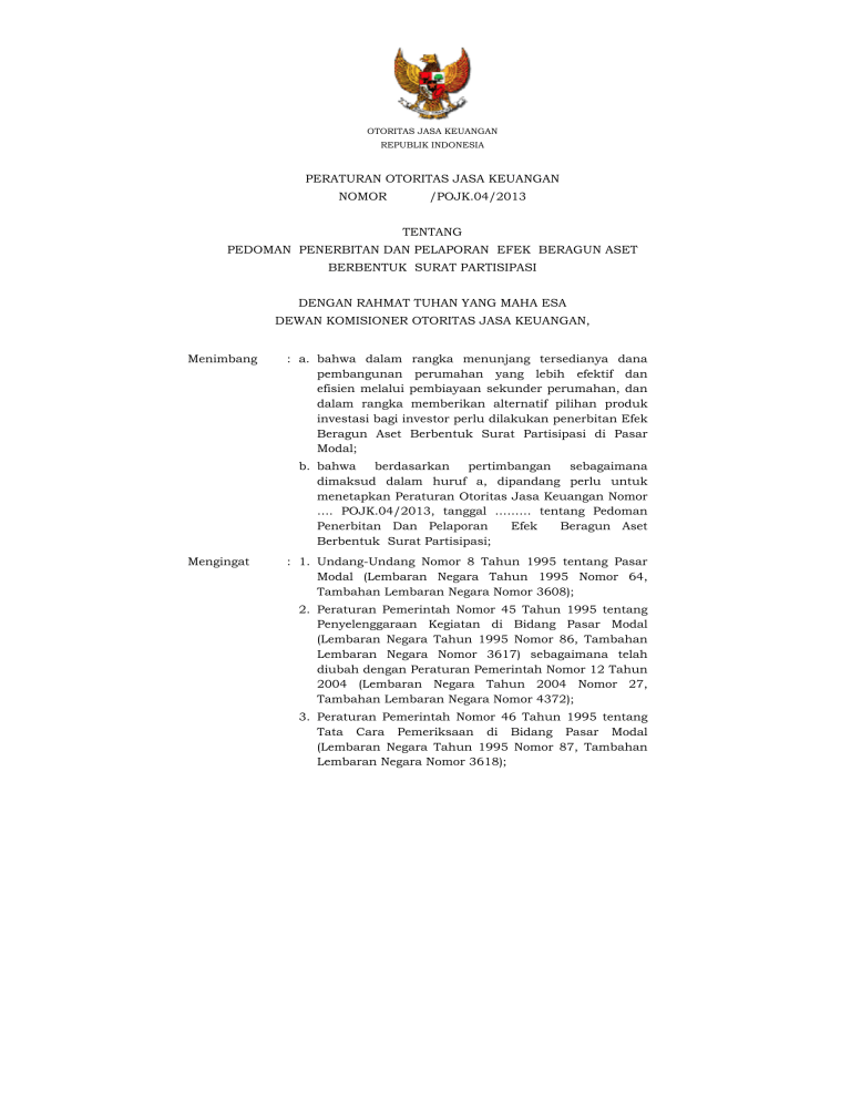 OTORITAS JASA KEUANGAN REPUBLIK INDONESIA PERATURAN OTORITAS JASA KEUANGAN NOMOR /POJK.04/2013 TENTANG PEDOMAN PENERBITAN DAN PELAPORAN EFEK BERAGUN ASET BERBENTUK SURAT PARTISIPASI DENGAN RAHMAT TUHAN YANG MAHA ESA DEWAN KOMISIONER OTORITAS JASA KEUANGAN, Menimbang : a. bahwa dalam rangka menunjang tersedianya dana pembangunan perumahan yang lebih efektif dan efisien melalui pembiayaan sekunder perumahan, dan dalam rangka memberikan alternatif pilihan produk investasi bagi investor perlu dilakukan penerbitan Efek Beragun Aset Berbentuk Surat Partisipasi di Pasar Modal; b. bahwa berdasarkan pertimbangan sebagaimana dimaksud dalam huruf a, dipandang perlu untuk menetapkan Peraturan Otoritas Jasa Keuangan Nomor …. POJK.04/2013, tanggal ……… tentang Pedoman Penerbitan Dan Pelaporan Efek Beragun Aset Berbentuk Surat Partisipasi; Mengingat : 1. Undang-Undang Nomor 8 Tahun 1995 tentang Pasar Modal (Lembaran Negara Tahun 1995 Nomor 64, Tambahan Lembaran Negara Nomor 3608); 2. Peraturan Pemerintah Nomor 45 Tahun 1995 tentang Penyelenggaraan Kegiatan di Bidang Pasar Modal (Lembaran Negara Tahun 1995 Nomor 86, Tambahan Lembaran Negara Nomor 3617) sebagaimana telah diubah dengan Peraturan Pemerintah Nomor 12 Tahun 2004 (Lembaran Negara Tahun 2004 Nomor 27, Tambahan Lembaran Negara Nomor 4372); 3. Peraturan Pemerintah Nomor 46 Tahun 1995 tentang Tata Cara Pemeriksaan di Bidang Pasar Modal (Lembaran Negara Tahun 1995 Nomor 87, Tambahan Lembaran Negara Nomor 3618); ‐ 2 ‐ MEMUTUSKAN: Menetapkan : PERATURAN OTORITAS JASA KEUANGAN TENTANG PEDOMAN PENERBITAN DAN PELAPORAN EFEK BERAGUN ASET BERBENTUK SURAT PARTISIPASI. BAB I Ketentuan Umum Pasal 1 Dalam peraturan ini, yang dimaksud dengan: a. Efek Beragun Aset Berbentuk Surat Partisipasi yang selanjutnya disebut EBA-SP adalah Efek Beragun Aset yang diterbitkan oleh Penerbit yang merupakan bukti kepemilikan secara proporsional atas Kumpulan Piutang yang dimiliki bersama oleh sejumlah pemegang EBA-SP. b. Penerbit adalah pihak yang melakukan penerbitan EBA-SP dalam rangka sekuritisasi. c. Kumpulan Piutang adalah Aset Keuangan yang telah dibeli oleh Penerbit dari Kreditur Asal. d. EBA-SP Arus Kas Tetap adalah EBA-SP yang memberikan pemegangnya penghasilan tertentu seperti kepada pemegang Efek bersifat utang. e. EBA-SP Arus Kas Tidak Tetap adalah EBA-SP yang memberikan pemegangnya suatu penghasilan tidak tertentu seperti kepada pemegang Efek bersifat ekuitas. f. Aset Keuangan adalah piutang yang diperoleh Kreditur Asal dari penerbitan Kredit Pemilikan Rumah, termasuk hak agunan yang melekat padanya. g. Kreditur Asal (Originator) adalah setiap bank atau lembaga keuangan yang mempunyai dan menjual Aset Keuangan dalam rangka sekuritisasi. h. Kredit Pemilikan Rumah (KPR) adalah fasilitas kredit yang diterbitkan oleh Kreditur Asal untuk membeli rumah siap huni. i. Pernyataan Pendaftaran adalah dokumen yang wajib disampaikan kepada Otoritas Jasa Keuangan oleh Penerbit dalam rangka Penawaran Umum EBASP. j. Penawaran Umum adalah kegiatan penawaran EBA-SP yang dilakukan oleh Penerbit untuk menjual EBA-SP kepada masyarakat berdasarkan peraturan perundang-undangan di bidang Pasar Modal. k. Dokumen Keterbukaan adalah dokumen yang memuat Informasi atau Fakta Material dan dibuat oleh Penerbit, serta diberikan kepada setiap pemodal sebelum yang bersangkutan menjadi pemegang EBA-SP. l. Informasi atau Fakta Material adalah informasi atau fakta penting dan relevan mengenai peristiwa, kejadian, atau fakta yang dapat mempengaruhi harga EBA-SP dan/atau keputusan pemodal, pemegang EBA-SP, atau Pihak lain yang berkepentingan atas informasi atau fakta tersebut. m. Dokumen Transaksi adalah perjanjian-perjanjian yang dibuat untuk mendukung kegiatan penerbitan EBA-SP, seperti perjanjian perwaliamanatan, perjanjian penyediaan jasa, dan perjanjian penitipan. ‐ 3 ‐ n. Penyedia Jasa (Servicer) adalah Pihak yang bertanggung jawab untuk memproses dan mengawasi pembayaran yang dilakukan debitur, melakukan tindakan awal berupa peringatan atau hal-hal lain karena debitur terlambat atau gagal memenuhi kewajibannya, melakukan negosiasi, menyelesaikan tuntutan terhadap debitur dan jasa lain yang ditetapkan dalam perjanjian penyediaan jasa. o. Sarana Peningkatan Kredit adalah sarana yang bertujuan untuk meningkatkan kualitas dan nilai Kumpulan Piutang dan/atau surat berharga dalam transaksi sekuritisasi, seperti: 1) subordinasi dari kelas EBA-SP tertentu terhadap kelas EBA-SP lainnya dalam satu penerbitan EBA-SP yang sama; 2) Letter of Credit (L/C); 3) dana jaminan; 4) asuransi; 5) jaminan atas tingkat bunga; 6) jaminan atas tersedianya likuiditas pada jatuh tempo; 7) jaminan atas pembayaran pajak; atau 8) “swap” atas tingkat bunga atau atas nilai tukar mata uang asing. Pasal 2 (1) EBA-SP dapat ditawarkan melalui Penawaran Umum. (2) Penawaran Umum EBA-SP oleh Penerbit hanya dapat dilakukan setelah Pernyataan Pendaftaran EBA-SP yang disampaikan oleh Penerbit dinyatakan Efektif oleh Otoritas Jasa Keuangan. Pasal 3 Dalam hal EBA-SP tidak ditawarkan melalui Penawaran Umum, maka Penerbit tidak diwajibkan menyampaikan Pernyataan Pendaftaran kepada Otoritas Jasa Keuangan, namun wajib menyampaikan dokumen kepada Otoritas Jasa Keuangan paling lambat 10 (sepuluh) hari kerja sejak diterbitkannya EBA-SP, sebagai berikut: a. Dokumen Keterbukaan EBA-SP; b. Dokumen Transaksi EBA-SP; dan c. spesimen sertifikat EBA-SP. Pasal 4 Pihak yang dapat melakukan penerbitan EBA-SP adalah perusahaan yang bergerak di bidang pembiayaan sekunder perumahan dan memenuhi persyaratan sebagai berikut: a. memiliki modal disetor paling sedikit Rp. 1.000.000.000.000 (satu triliun rupiah); b. memiliki paling sedikit 2 (dua) orang direktur, dimana paling kurang 1 (satu) orang direktur memiliki keahlian dan/atau pengalaman di bidang sekuritisasi atau memiliki sertifikat kecakapan di bidang pengelolaan investasi; ‐ 4 ‐ c. memiliki pegawai yang memiliki sertifikat kecakapan di bidang analisa KPR dan/atau pengalaman kerja