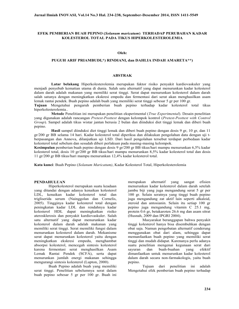 Jurnal Ilmiah INOVASI, Vol.14 No.3 Hal. 234-238, September-Desember 2014, ISSN 1411-5549 EFEK PEMBERIAN BUAH PEPINO (Solanum maricatum) TERHADAP PERUBAHAN KADAR KOLESTEROL TOTAL PADA TIKUS HIPERKOLESTEROLEMIA Oleh: PUGUH ARIF PRIAMBUDI,*) RINDIANI, dan DAHLIA INDAH AMARETA**) ABSTRAK Latar belakang Hiperkolesterolemia merupakan faktor risiko penyakit kardiovaskuler yang menjadi penyebab kematian utama di dunia. Salah satu alternatif yang dapat menurunkan kadar kolesterol dalam darah adalah makanan yang memiliki serat tinggi. Serat dapat menurunkan kolesterol dalam darah salah satunya dengan meningkatkan ekskresi empedu dan fermentasi dari serat akan menghasilkan asam lemak rantai pendek. Buah pepino adalah buah yang memiliki serat tinggi sebesar 5 gr per 100 gr. Tujuan Mengetahui pengaruh pemberian buah pepino terhadap kadar kolesterol total tikus hiperkolesterolemia.. Metode Penelitian ini merupakan penelitian eksperimental (True Experimental). Desain penelitian yang digunakan adalah rancangan Pretest-Posttest dengan kelompok kontrol (Pretest-Posttest with Control Group). Sampel adalah tikus wistar jantan berusia 2 bulan dan diinduksi diet tinggi lemak dan diberi buah pepino. Hasil sampel diinduksi diet tinggi lemak dan diberi buah pepino dengan dosis 9 gr, 10 gr, dan 11 gr/200 gr BB selama 14 hari. Kadar kolesterol total diperiksa dan dilakukan pengolahan data dengan uji tberpasangan dan Annova, dilanjutkan uji LSD. Dari hasil pengolahan tersebut terdapat perbedaan kadar kolesterol total sebelum dan sesudah diberi perlakuan pada masing-masing kelompok. Kesimpulan pemberian buah pepino dengan dosis 9 gr/200 gr BB tikus/hari mampu menurunkan 6,5% kadar kolesterol total, dosis 10 gr/200 gr BB tikus/hari mampu menurunkan 8,5% kadar kolesterol total dan dosis 11 gr/200 gr BB tikus/hari mampu menurunkan 12,4% kadar kolesterol total. Kata kunci: Buah Pepino (Solanum Maricatum), Kadar Kolesterol Total, Hiperkolesterolemia PENDAHULUAN Hiperkolesterol merupakan suatu keadaan yang ditandai dengan adanya kenaikan kolesterol LDL, kenaikan kadar kolesterol total dan trigliserida serum (Nainggolan dan Cornelis, 2005). Tingginya kadar kolesterol total dengan peningkatan kadar LDL dan rendahnya kadar kolesterol HDL dapat meningkatkan risiko aterosklerosis dan penyakit kardiovaskuler. Salah satu alternatif yang dapat menurunkan kadar kolesterol dalam darah adalah makanan yang memiliki serat tinggi. Serat memiliki fungsi dalam menurunkan kolesterol dalam darah. Mekanisme serat dapat menurunkan kolesterol yaitu dengan meningkatkan ekskresi empedu, menghambat absorpsi kolesterol, mencegah sintesis kolesterol karena fermentasi serat menghasilkan Asam Lemak Rantai Pendek (SCFA), serta dapat menurunkan jumlah energi makanan sehingga mengurangi sintesis kolesterol (Lupton, 2000). Buah Pepino adalah buah yang memiliki serat tinggi. Penelitian sebelumnya serat dalam buah pepino sebesar 5 gr per 100 gr. Buah ini merupakan alternatif yang sangat efisien menurunkan kadar kolesterol dalam darah setelah jambu biji yang juga mengandung serat 5 gr per 100 gr. Selain seratnya yang tinggi buah pepino juga mengandung zat aktif lain seperti alkaloid, steroid dan antosianin. Selain itu setiap 100 gr pepino juga mengandung vitamin C 25.1 mg, protein 0.6 gr, betakaroten 26.6 mg dan asam sitrat (Husnah, 2009 dan IPGRI 2004). Masyarakat beranggapan bahwa penyakit tinggi kolesterol hanya bisa disembuhkan dengan obat saja. Namun pengobatan alternatif cenderung menggunakan obat dari alam, sehingga dapat memanfaatkan buah pepino yang memiliki serat tinggi dan mudah didapat. Karenanya perlu adanya suatu penelitian mengenai kegunaan serat dari sayuran dan buah-buahan yang efektif dimanfaatkan untuk menurunkan kadar kolesterol dalam darah secara non-farmakologis, yaitu buah pepino. Tujuan dari penelitian ini adalah Mengetahui efek pemberian buah pepino terhadap 234 Puguh,Rindiani, dan Dahlia Indah A, Efek Pemberian Buah Pepino (Solanum maricatum) Terhadap Perubahan Kadar Kolesterol Total Pada Tikus Hiperkolesterolemia perubahan kadar kolesterol total pada tikus hiperkolesterolemia. METODE Penelitian ini merupakan penelitian eksperimental (True Experimental). Desain penelitian yang digunakan adalah rancangan Pretest-Posttest dengan kelompok kontrol (Pretest-Posttest with Control Group) (Notoadmodjo, 2010). Sampel yaitu tikus (R. Norvegicus) yang dikondisikan hiperkolesterolemia, dilakukan randomisasi menjadi 5 kelompok yaitu kelompok kontrol positif (X0) yang setelah kondisi hiperkolesterolemia diberikan diet standar yaitu pakan pellet Turbo dan air minum. Kelompok II (X1), adalah kelompok tikus hiperkolesterolemia yang diberi perlakuan diet standar dengan pemberian buah pepino dosis dosis I (9 gr/BB tikus) Kelompok III (X2), adalah kelompok tikus hiperkolesterolemia yang diberi perlakuan diet standar dengan pemberian buah pepino dosis II (10 gr/BB tikus) Kelompok IV (X3), adalah kelompok tikus hiperkolesterolemia yang diberi perlakuan diet standar dengan pemberian buah pepino dosis III (11 gr/BB tikus) Kelompok V (X4), adalah kelompok tikus hiperkolesterolemia yang diberi diet standar dengan perlakuan pemberian obat simvastatin Prosedur Kerja 1. Persiapan pakan buah pepino dan obat simvastatin Pakan standar yang digunakan adalah pellet Turbo sebanyak ±50 gram/kelompok perlakuan/hari dan air minum aquades ±100 ml/hari. Produk perlakuan yang diberikan yaitu obat simvastatin dengan dosis 0,18 mg/kg BB tikus dan buah pepino pada dosis I, II, dan III. 2. Pemilihan dan Pemeliharaan Tikus Percobaan Pemilihan 25 ekor tikus jantan Sprague Dawley, dengan berat 200 – 300 gr, berumur 2-3 bulan. Pemilihan tikus secara randominasi menjadi lima kelompok yang sesuai dengan kriteria inklusi. Pengadaptasian tikus selama 7 hari, menggunakan pakan standar dan air minum. Tikus tersebut dikandangkan dengan kondisi cahaya dan ventilasi yang cukup dan pada suhu ruang yang sesuai, siklus gelap terang 12 jam (sekitar 25 - 290C) (Rochmawati, 2008). Tikus pe