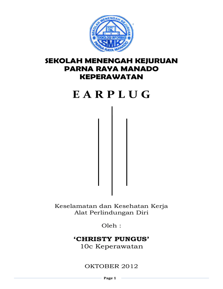 SEKOLAH MENENGAH KEJURUAN PARNA RAYA MANADO KEPERAWATAN EARPLUG Keselamatan dan Kesehatan Kerja Alat Perlindungan Diri Oleh : ‘CHRISTY PUNGUS’ 10c Keperawatan OKTOBER 2012 Page 1 KATA PENGANTAR Puji syukur kehadirat Tuhan Yang Maha Esa, atas berkat rahmat dan tuntunanNya makalah tentang Keselamatan dan Kesehatan Kerja “Earplug” bisa diselesaikan dengan segala baik. Diharapkan melalui makalah ini para pembaca serta masyarakat pada umumnya dapat lebih mengetahui alat perlindungan telinga atau earplug. Saya menyadari bahwa makalah ini masih jauh dari sempurna, oleh karena itu kritik dan saran dari semua pihak yang bersifat membangun selalu saya harapkan demi kesempurnaan makalah ini. Akhir kata, saya sampaikan terima kasih. Manado, Oktober 2012 Christy Pungus Page 2 DAFTAR ISI Kata Pengantar ………………………………………………………………………………………………….. i Daftar Isi……………………………………………………………………………………………………………. ii Perlindungan dari Air…………………………………….……………………………………………………. 1 Perlindungan Pendengaran………..………………………………………………………………………… 1 Sejarah…………………………………….………………………………………………………………………….. 2 Dasar Colokan Jenis …………………………..…………………………………..……………….................. 2 Peringkat Kebisingan Pengurangan…………………………………………………………................. 4 Update diharapkan …………………………..…………………………………………………………………. 4 Musisi atau Hi-Fi Penyumbat telinga …………………………………………………………………… 5 Flight telinga perlindungan………………………………………………………………………………….. 6 Resiko Kesehatan ……………………………………….………………………………………………………. 7 Kepustakaan dan Sumber ……………..…………………………………………………………………….. 8 Uraian / Rangkuman ………………………………………………………………………………………….. 8 Page 3 EARPLUG Earplug adalah sebuah perangkat yang dimaksudkan untuk dimasukkan ke dalam liang telinga untuk melindungi telinga pengguna dari suara keras atau intrusi air, benda asing, debu atau angin yang berlebihan. Perlindungan Dari Air Penyumbat telinga terutama dirancang untuk menjaga air keluar dari saluran telinga, terutama saat berenang dan olahraga air. Jenis earplug dapat dibuat dari lilin atau moldable silikon yang custom pas ke saluran telinga oleh pemakainya. Exostosis, atau telinga Surfer , adalah suatu kondisi yang mempengaruhi orang-orang yang menghabiskan banyak waktu di dalam air di daerah beriklim dingin. Selain itu, angin dapat meningkatkan prevalensi jumlah exostosis terlihat pada satu telinga versus bergantung lainnya pada arah itu berasal dari dan orientasi individu untuk angin. Custom-fitted penyumbat telinga peselancar membantu mengurangi jumlah air dingin dan angin yang diizinkan untuk memasuki saluran telinga eksternal dan, dengan demikian, membantu memperlambat perkembangan exostosis. Sebuah studi tahun 2003 yang diterbitkan dalam Clinical THT menemukan bahwa bola kapas jenuh dengan petroleum jelly lebih efektif dalam menjaga air keluar dari telinga, adalah lebih mudah digunakan, dan lebih nyaman daripada colokan lilin, colokan busa, EarGuard, atau Aquafit. Jacques-Yves Cousteau ,memperingatkan bahwa penyumbat telinga berbahaya bagi penyelam, terutama penyelam . Penyelam bernapas kompresi udara atau campuran gas lain pada tekanan yang cocok dengan tekanan air. Tekanan ini juga di dalam telinga, tetapi tidak antara gendang telinga dan earplug, sehingga tekanan di belakang gendang telinga akan sering meledak gendang telinga. Penyelam kulit memiliki tekanan kurang dalam telinga, tetapi mereka juga hanya memiliki tekanan atmosfer dalam saluran telinga luar. "Proplugs Doc" menawarkan penyumbat telinga vented untuk memungkinkan penyelam untuk menyamakan dengan aman dan melindungi telinga mereka. Perlindungan Pendengaran Ada terutama tiga jenis penutup telinga untuk mendengar perlindungan: Foam penutup telinga, terutama yang terbuat dari busa memori , yang dipadatkan dan dimasukkan ke dalam liang telinga, di mana mereka berkembang untuk pasang. Silicone penutup telinga, yang digulung menjadi bola dan hati-hati dibentuk agar sesuai di atas bagian eksternal dari saluran telinga, menyediakan custom sesuai nyaman bagi pengguna. Bergelang penutup telinga, termasuk sebagian besar jenis musisi 'atau' penutup telinga Hi-Fi ', serta cetakan kustom setelah mereka dibentuk. Page 4 NIOSH Keselamatan Pertambangan dan Penelitian Kesehatan merekomendasikan menggunakan roll, tarik, dan tahan metode ketika menggunakan penyumbat telinga memori busa. Proses ini melibatkan pengguna bergulir earplug ke batang tipis, menarik kembali telinga, dan memegang earplug jauh di dengan kanal dengan jari. [4] Untuk mendapatkan segel lengkap, pengguna harus menunggu sekitar 20 detik untuk earplug untuk memperluas dalam kanal. Selain itu, mereka mungkin baik sekali pakai atau non-sekali pakai, dengan busa dan silikon yang umumnya menjadi pakai atau untuk menggunakan jumlah yang relatif terbatas kali, sementara yang padat secara umum dapat dianggap sebagai non-sekali pakai. Sebuah variasi dari busa bantalan telinga tradisional adalah no-roll busa earplug yang menggunakan batang built-in pusat untuk mendorong busa dihubungkan ke telinga. Ini penutup telinga mencapai segel karena bentuknya meruncing mereka, daripada ekspansi setelah digulung. Sangkutan telinga adalah sangat berguna untuk orang terke