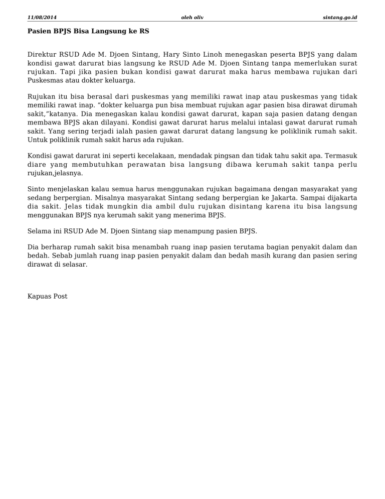 11/08/2014 oleh oliv sintang.go.id Pasien BPJS Bisa Langsung ke RS Direktur RSUD Ade M. Djoen Sintang, Hary Sinto Linoh menegaskan peserta BPJS yang dalam kondisi gawat darurat bias langsung ke RSUD Ade M. Djoen Sintang tanpa memerlukan surat rujukan. Tapi jika pasien bukan kondisi gawat darurat maka harus membawa rujukan dari Puskesmas atau dokter keluarga. Rujukan itu bisa berasal dari puskesmas yang memiliki rawat inap atau puskesmas yang tidak memiliki rawat inap. “dokter keluarga pun bisa membuat rujukan agar pasien bisa dirawat dirumah sakit,”katanya. Dia menegaskan kalau kondisi gawat darurat, kapan saja pasien datang dengan membawa BPJS akan dilayani. Kondisi gawat darurat harus melalui intalasi gawat darurat rumah sakit. Yang sering terjadi ialah pasien gawat darurat datang langsung ke poliklinik rumah sakit. Untuk poliklinik rumah sakit harus ada rujukan. Kondisi gawat darurat ini seperti kecelakaan, mendadak pingsan dan tidak tahu sakit apa. Termasuk diare yang membutuhkan perawatan bisa langsung dibawa kerumah sakit tanpa perlu rujukan,jelasnya. Sinto menjelaskan kalau semua harus menggunakan rujukan bagaimana dengan masyarakat yang sedang berpergian. Misalnya masyarakat Sintang sedang berpergian ke Jakarta. Sampai dijakarta dia sakit. Jelas tidak mungkin dia ambil dulu rujukan disintang karena itu bisa langsung menggunakan BPJS nya kerumah sakit yang menerima BPJS. Selama ini RSUD Ade M. Djoen Sintang siap menampung pasien BPJS. Dia berharap rumah sakit bisa menambah ruang inap pasien terutama bagian penyakit dalam dan bedah. Sebab jumlah ruang inap pasien penyakit dalam dan bedah masih kurang dan pasien sering dirawat di selasar. Kapuas Post