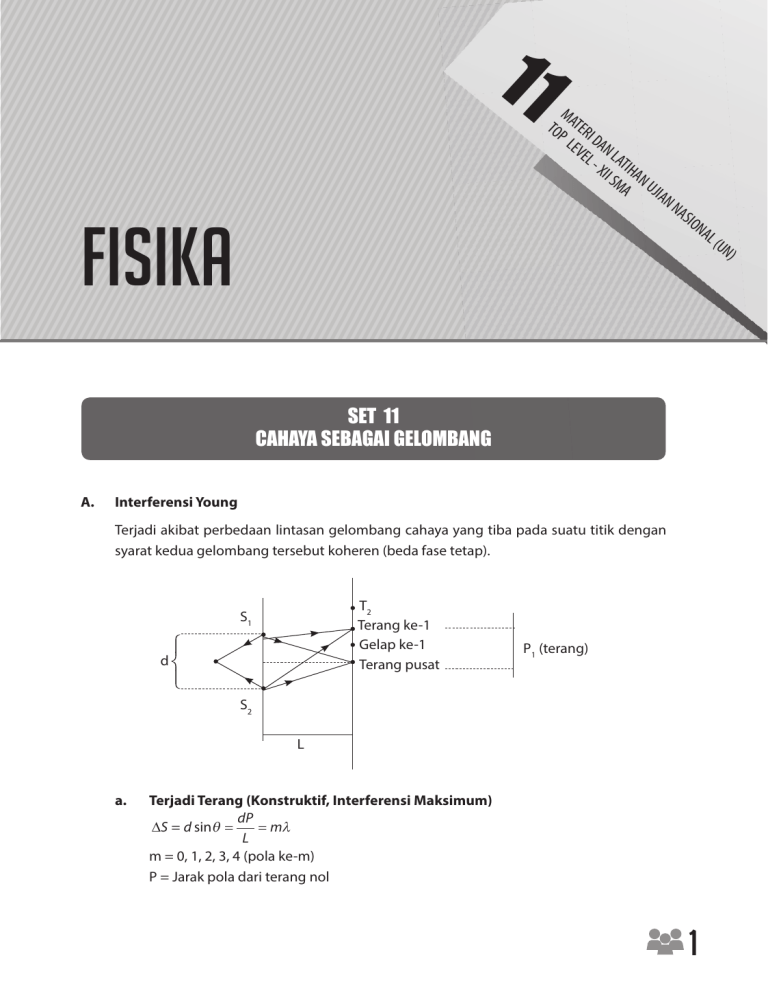 11 M TO ATER P L ID EV AN EL LAT - X IH II S AN MA UJ IAN FISIKA NA SIO NA SET 11 CAHAYA SEBAGAI GELOMBANG A. Interferensi Young Terjadi akibat perbedaan lintasan gelombang cahaya yang tiba pada suatu titik dengan syarat kedua gelombang tersebut koheren (beda fase tetap). T2 Terang ke-1 Gelap ke-1 Terang pusat S1 d P1 (terang) S2 L a. Terjadi Terang (Konstruktif, Interferensi Maksimum) dP ∆S = d sinθ = = mλ L m = 0, 1, 2, 3, 4 (pola ke-m) P = Jarak pola dari terang nol 1 L( UN ) b. Terjadi Gelap (Destruktif, Interferensi Minimum) ∆S = d sinθ = 1 dP = m − λ 2 L CONTOH SOAL 1. Dua celah yang berjarak 1 mm, disinari cahaya dengan panjang gelombang 6.000 Ǻ. Jika jarak celah ke layar 1 m, maka jarak antara gelap ke-3 dan terang ke-5 adalah . . . . A. 1,8 mm B. 1,7 mm C. 1,6 mm D. 1,5 mm E. 1,4 mm Pembahasan: ∆P = P5 ( terang ) − P3 ( gelap ) = = 5 Lλ 2 d -7 5 1( 6 × 10 ) 2 1 × 10-3 = 1,5 mm Jawaban: D 2. Dua celah yang berjarak 3 × 10-5 m, disinari cahaya monokromatis dengan panjang gelombang 6.000 Ǻ membentuk pola interferensi pada layar jaraknya 2 meter dari celah 4 tersebut. Jika percobaan dilakukan dalam air n = , maka jarak antara dua garis terang 3 yang berurutan adalah . . . . A. 0,01 m B. 0,02 m C. 0,03 m D. 0,04 m E. 0,05 m Pembahasan: Diketahui: d = 3 × 10-5 m λ1 = 6.000 Ǻ = 6 × 10-7 m L=2m 2 4 n= 3 ∆P = . . . ? Jawab: λ1 n1 = λ2 n2 Lλ2 d 2 × 4,5 × 10-7 = 3 × 10-5 ∆P = 4 6 × 10-7 = 3 1 λ2 = 3 × 10-2 = 0, 03m λ2 = 4,5 × 10-7 m Jawaban: C 3. Cahaya tampak memancar dalam dua macam panjang gelombang λ1 = 430 nm dan λ2 = 510 nm digunakan dalam celah ganda dengan jarak antarcelah 0,02 mm serta jarak celah ke layar 1 meter. Jarak antara kedua cahaya pada pita terang ke-4 adalah . . . . (dalam cm) Pembahasan: Diketahui: λ1 = 430nm -6 ∆λ = 80nm = 8 × 10 cm λ2 = 510nm d = 0,02 mm = 2 × 10-3 cm L = 1 m = 100 cm m = 4 (terang ke-4) ∆P = ...? Jawab: ∆P = mL × ∆λ 4 × 100 × 8 × 10-6 = d 2 × 10-3 = 16 × 10-1 = 1, 6 cm LATIHAN SOAL 1. Pada interferensi Young, jika jarak antara kedua celahnya dijadikan setengah kali semula, maka jarak antara dua garis terang yang berurutan . . . semula. 3 B. Difraksi/Lenturan Pada Kisi Difraksi adalah peristiwa terjadinya terang dan gelap pada layar karena pembelokan Arah Rambat Cahaya pada celah sempit: d= 1 N θ = sudut deviasi d = jarak antar celah kisi N = banyak garis per satuan panjang Lensa θ P Kisi Layar a. Syarat Terjadinya Terang d sin θ = mλ atau m = 0, 1, 2, 3, . . . b. dP = mλ L Terjadi Gelap 1 dP 1 = m − λ d sin θ = m − λ atau 2 L 2 m = 1, 2, 3, . . . CONTOH SOAL 1. 4 Sebuah kisi yang memiliki 4.000 garis tiap centimeter digunakan untuk menentukan panjang gelombang cahaya. Jika sudut antara garis pusat dan garis pada orde pertama adalah 10° (sin 10° = 0,17). Dari hasil pengamatan, panjang gelombang cahaya itu adalah .... Pembahasan: Diketahui: N = 4.000 garis/cm 1 1 d= = cm = 0,25 × 10 -3 m = 25 × 10 -5 m N 4000 m = 1 (terang) θ = 10° λ=...? Jawab: d sinθ = mλ λ= d sinθ 25 × 10-5 × 0,17 = 1 m = 4,25 × 10 -5 m LATIHAN SOAL 1. Cahaya polikromatik jatuh tegak lurus pada kisi yang memiliki konstanta 2.000 garis per centimeter. Jika jarak kisi-layar 1,5 meter, maka jarak garis terang ke-2 berkas sinar biru adalah . . . . (dalam cm) A. 7,6 B. 8,6 C. 9,6 D. 10,6 E. 11,6 2. Suatu berkas sinar sejajar mengenai tegak lurus suatu kisi yang lebarnya 4 mm. Di belakang celah diberi lensa positif, dengan fokus 40 cm. Garis terang pusat dengan garis gelap pertama berjarak 0,56 mm. Panjang gelombang sinar tersebut . . . . A. 1,12 × 10-5 m B. 1,5 × 10-5 m C. 1,65 × 10-5 m D. 1,7 × 10-5 m E. 1,8 × 10-5 m 3. Cahaya monokromatis dengan panjang gelombang 6.000 Ǻ mengenai kisi yang terdiri atas 1.000 garis/cm. Garis terang orde pertama diamati terjadi pada sudut 15°. Apabila kisi tersebut diganti dengan kisi yang terdiri atas 750 garis/cm, maka pada sudut 15° tersebut akan diamati keadaan/pola . . . . 5 6