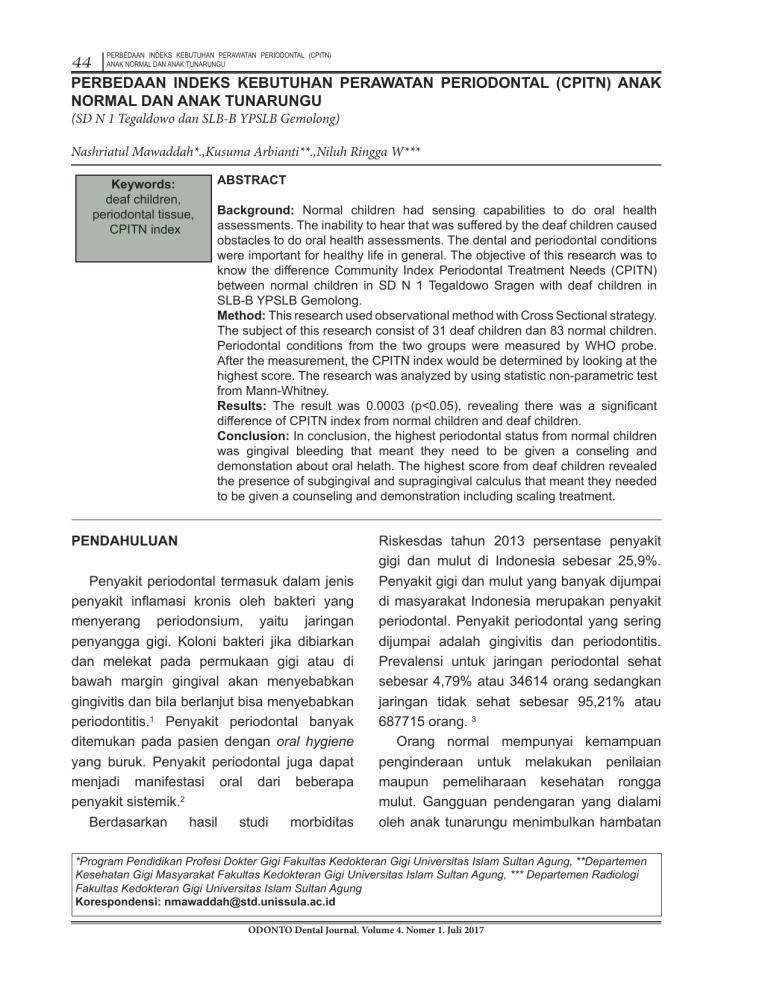 44 PERBEDAAN INDEKS KEBUTUHAN PERAWATAN PERIODONTAL (CPITN) ANAK NORMAL DAN ANAK TUNARUNGU PERBEDAAN INDEKS KEBUTUHAN PERAWATAN PERIODONTAL (CPITN) ANAK NORMAL DAN ANAK TUNARUNGU (SD N 1 Tegaldowo dan SLB-B YPSLB Gemolong) Nashriatul Mawaddah*.,Kusuma Arbianti**.,Niluh Ringga W*** Keywords: deaf children, periodontal tissue, CPITN index ABSTRACT Background: Normal children had sensing capabilities to do oral health assessments. The inability to hear that was suffered by the deaf children caused obstacles to do oral health assessments. The dental and periodontal conditions were important for healthy life in general. The objective of this research was to know the difference Community Index Periodontal Treatment Needs (CPITN) between normal children in SD N 1 Tegaldowo Sragen with deaf children in SLB-B YPSLB Gemolong. Method: This research used observational method with Cross Sectional strategy. The subject of this research consist of 31 deaf children dan 83 normal children. Periodontal conditions from the two groups were measured by WHO probe. After the measurement, the CPITN index would be determined by looking at the highest score. The research was analyzed by using statistic non-parametric test from Mann-Whitney. Results: The result was 0.0003 (p<0.05), revealing there was a significant difference of CPITN index from normal children and deaf children. Conclusion: In conclusion, the highest periodontal status from normal children was gingival bleeding that meant they need to be given a conseling and demonstation about oral helath. The highest score from deaf children revealed the presence of subgingival and supragingival calculus that meant they needed to be given a counseling and demonstration including scaling treatment. PENDAHULUAN Penyakit periodontal termasuk dalam jenis penyakit inflamasi kronis oleh bakteri yang menyerang periodonsium, yaitu jaringan penyangga gigi. Koloni bakteri jika dibiarkan dan melekat pada permukaan gigi atau di bawah margin gingival akan menyebabkan gingivitis dan bila berlanjut bisa menyebabkan periodontitis.1 Penyakit periodontal banyak ditemukan pada pasien dengan oral hygiene yang buruk. Penyakit periodontal juga dapat menjadi manifestasi oral dari beberapa penyakit sistemik.2 Berdasarkan hasil studi morbiditas Riskesdas tahun 2013 persentase penyakit gigi dan mulut di Indonesia sebesar 25,9%. Penyakit gigi dan mulut yang banyak dijumpai di masyarakat Indonesia merupakan penyakit periodontal. Penyakit periodontal yang sering dijumpai adalah gingivitis dan periodontitis. Prevalensi untuk jaringan periodontal sehat sebesar 4,79% atau 34614 orang sedangkan jaringan tidak sehat sebesar 95,21% atau 687715 orang. 3 Orang normal mempunyai kemampuan penginderaan untuk melakukan penilaian maupun pemeliharaan kesehatan rongga mulut. Gangguan pendengaran yang dialami oleh anak tunarungu menimbulkan hambatan *Program Pendidikan Profesi Dokter Gigi Fakultas Kedokteran Gigi Universitas Islam Sultan Agung, **Departemen Kesehatan Gigi Masyarakat Fakultas Kedokteran Gigi Universitas Islam Sultan Agung, *** Departemen Radiologi Fakultas Kedokteran Gigi Universitas Islam Sultan Agung Korespondensi: nmawaddah@std.unissula.ac.id ODONTO Dental Journal. Volume 4. Nomer 1. Juli 2017 Mawaddah/Arbianti/Ringga dalam penilaian maupun pemeliharaan kesehatan rongga mulut. Kesehatan rongga mulut yang meliputi kesehatan gigi dan jaringan penyangga gigi (jaringan periodontal) merupakan hal penting dalam kesehatan dan kesejahteraan tubuh secara umum serta memmpengaruhi kualitas kehidupan termasuk didalamnya fungsi bicara, pengunyahan, dan rasa percaya diri.4 Berdasarkan uraian diatas maka peneliti ingin mengetahui perbedaanindeks kebutuhan perawatan periodontal (CPITN) anak normal di SD N 1 Tegaldowo dan anak tunarungu di SLB-B YPSLB Gemolong. METODE PENELITIAN Jenis penelitian yang digunakan adalah penelitian observasional dengan rancangan penelitian Cross Sectional, yaitu penelitian yang lebih representatif dalam mendeskripsikan karakteristik populasi. Subjek pada penelitian hanya diobservasi sekali saja dan pengukuran dilakukan terhadap status karakter atau variable subjek pada saat pemeriksaan. Penelitian ini dilakukan pada bulan Oktober 2016.Sampel yang digunakan pada penelitian ini adalah Total Sampling. Sampel tediri dari 31 anak tunarungu SLB-B YPSLB Gemolong dan 83 anak normal SD N 1 Tegaldowo. Sampel diperiksa menggunakan probe periodontal WHO dengan teknik walking stroke pada sulkus gingiva gigi indeks.Pemeriksaan 45 dilakukan berdasarkan 6 sekstan (empat gigi posterior dan dua gigi anterior) yaitu molar pertama kanan atas (16), incisivus pertama kanan atas (11), molar pertama kiri atas (26), molar pertama kiri bawah (36), incisivus pertama kiri bawah (31), dan molar pertama kanan bawah (46).Kondisi periodontal sehat, diberikan skor CPITN yaitu skor 0, bila terjadi perdarahan setelah probing diberi skor 1, bila terlihat kalkulus supragingiva/subgingiva di beri skor 2, untuk kedalaman poket 4- 5 mm diberi skor 3, dan untuk kedalaman poket lebih dari 6 mm diberi skor 4.Dari keseluruhan skor yang didapatkan dari tiap sekstan, ditentukan skor tertinggi untuk menentukan nilai kemaknaan CPITN. Analisa data menggunakan uji statistik non parametrik Mann-Whitney. HASIL PENELITIAN Hasil dari penelitian ini dapat dilihat pada tabel 1. Tabel 1 menunjukkah bahwa frekuensi tertinggi indeks CPITN anak normal adalah perdarahan setelah probing (skor 1) yaitu sebanyak 46 orang (55,4%). Kalkulus supra maupun subgingiva (skor 2) merupakan frekuensi tertinggi pada skor CPITN anak tunarungu yaitu sebanyak 21 orang (67,7%). Hasil pemeriksaan indeks CPITN tersebut juga menegaskan bahwa kondisi jaringan periodontal anak tunarungu lebih parah dibanding anak normal. ODONTO Dental Journal. Volume 4. Nomer 1. Juli 2017 46 PERBEDAAN INDEKS KEBUTUHAN PERAWATAN PERIODONTAL (CPITN) ANAK NORMAL DAN ANAK TUNARUNGU Tabel 2. Distribusi rata-rata indeks CPITN pada sekstan anak tunarungu di SLB-B YPSLB Gemolong B