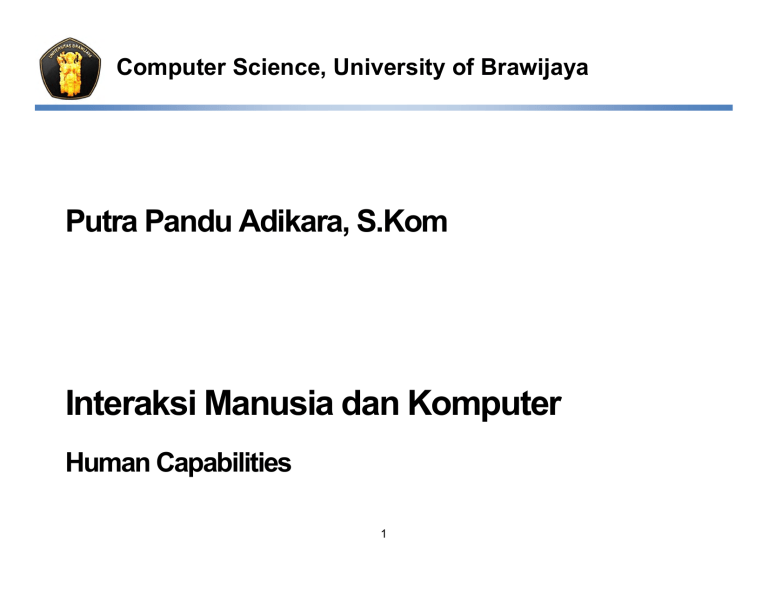 Computer Science, University of Brawijaya Putra Pandu Adikara, S.Kom Interaksi Manusia dan Komputer Human Capabilities 1 Tujuan Perkuliahan Memahami Human Capabilities Menjelaskan aspek-aspek manusia yang terkait dengan IMK Menjelaskan pentingnya aspek manusia dalam merancang IMK 2 Bagaimana Membuat Desain Sistem Yg Efektif? harus memahami kemampuan dan keterbatasan manusia manusia sangat kompleks, tidak konsisten, kurang deterministik (sulit diprediksi) memahami bagaimana membuat sistem yg dpt diandalkan dan aman utk digunakan manusia 3 Bagaimana Membuat Desain Sistem Yg Efektif? dapat dicapai dengan mempelajari tentang aspek-aspek psikologi kognitif manusia • bagaimana manusia merasakan dunia disekitarnya, • bagaimana manusia menyimpan & memproses informasi serta memecahkan masalah, • bagaimana manusia memanipulasi objek scr fisik aspek sosial & aspek organisasional yang berpengaruh 4 Manusia Manusia adalah aspek pertama dan utama karena manusia adalah subjek di dalam sistem komputer. Sistem komputer membantu manusia dalam menyelesaikan masalah-masalah dengan cara yang lebih efektif dan efisien Studi manusia dalam IMK akan menghasilkan suatu sistem yang dapat diandalkan, aman, dan nyaman bagi manusia 5 Manusia Keterbatasan manusia dalam memproses informasi yang mendorong terciptanya sistem komputer. Informasi yang diterima dan respon yang diberikan oleh manusia terbatas melalui saluran yang dimiliki oleh manusia. Saluran masukan yang dimiliki oleh manusia terdiri dari penglihatan (visual), pendengaran (auditory), sentuhan (haptic) dan gerakan (movement), dan informasi yang tersimpan di dalam memori manusia. Informasi yang tersimpan diproses dan diolah menjadi bahan pertimbangan, pemecahan masalah, dan keterampilan manusia. 6 Saluran Masukan dan Keluaran 7 Penglihatan 8 Penglihatan Sistem visual manusia (penglihatan) secara normal digunakan untuk menghasilkan persepsi yang teroganisir tentang gerakan, ukuran, bentuk, jarak, posisi relatif, dan tekstur Pada dunia nyata sistem visual manusia digunakan untuk melihat semua bentuk 3 dimensi, sedangkan pada sistem komputer yang menggunakan layar komputer 2 dimensi, sistem visual manusia dipaksa untuk dapat mengerti objek 2 dimensi yang dimanipulasi menjadi objek 3 dimensi 9 Interpretasi Sinyal Ukuran dan kedalaman Sudut pandang manusia seberapa banyak area dari objek pandang dapat dilihat yang berhubungan dengan ukuran dan jarak dari mata manusia. Objek yang familier atau sering dilihat dipersepsikan mempunyai ukuran yang konstan walau ada perubahan dalam sudut pandang dari kejauhan. Ketajaman pandangan kemampuan penglihatan untuk menerima dan mempersepsikan detil dengan baik. 10 Interpretasi Sinyal Kecemerlangan (Luminance) jumlah cahaya yang dipantulkan oleh permukaan benda (Candela/m2) semakin besar luminans dari sebuah objek, detil objek yang dapat dilihat mata juga akan semakin bertambah diameter pupil yang semakin mengecil akan meningkatkan kedalaman fokusnya semakin besar luminans sebuah objek akan menyebabkan mata bertambah sensistif terhadap kedipan (flicker) Ketajaman pandangan akan meningkat seiring banyaknya cahaya, namun juga akan meningkatkan kedipan mata (flicker) 11 Interpretasi Sinyal Kontras hubungan antara cahaya yang dikeluarkan oleh suatu objek dan cahaya latar belakang objek tersebut atau selisih antara luminans objek dan latar belakang, dibandingkan dengan luminans latar belakang bernilai positif jika cahaya yang dipancarkan oleh sebuah objek lebih besar dibanding yang dipancarkan oleh latar belakang • objek yang sesungguhnya akan tampak bernilai negatif jika cahaya yang dipancarkan oleh sebuah objek lebih kecil dibanding yang dipancarkan oleh latar belakang • objek sesungguhnya akan terserap oleh latar belakang dan menjadi tidak tampak 12 Kisi kisi herman 13 Faktor-faktor Yang Mempengaruhi Penglihatan Kecerahan tanggapan subyektif terhadap cahaya luminans yang tinggi akan berimplikasi pada kecerahan yang tinggi 14 Interpretasi Sinyal Warna merupakan sensasi yang diperoleh oleh mata panjang gelombang cahaya tampak berkisar antara 400 – 700 nm (dari ultraviolet s.d. infrared), dan dengan luminans konstan dan jumlah cahaya putih yang ditambahkan (saturasi) dijaga tetap, seseorang yang memiliki penglihatan normal mampu membedakan 128 warna mata dapat membedakan warna secara akurat ketika posisi objek membentuk sudut kurang lebih 60o terhadap mata (dengan posisi kepala dan mata diam) 15 Interpretasi Sinyal Warna retina manusia terdiri atas banyak sekali rods dan cones yang sensitif terhadap cahaya • rods bertanggung jawab untuk penglihatan malam • cones merupakan sel-sel yang sangat sensitif terhadap warna • fotopigmen dalam cones akan menterjemahkan panjang gelombang menjadi sensasi warna yang kisarannya ditentukan oleh 3 buah fotopigmen yaitu biru (445 nm), hijau (535 nm) dan merah (575 nm) 16 Interpretasi Sinyal Warna Warna dibentuk dari: Hue (corak warna), merupakan bermacam-macam warna dalam corak yang berbeda. Makin tinggi nilai suatu corak warna, maka akan makin jelas pula warnanya. Insensity (intensitas), merupakan tingkat kecerahan suatu warna. Saturation (kejenuhan), merupakan penyerapan warna putih, makin sedikit warna putih dari suatu warna, maka semakin gelap warna itu, sebaliknya makin banyak jumlah unsur putih, makin jenuh warna itu. 17 Interpretasi Sinyal Warna transmisivitas lensa mempunyai efek karena lensa akan menyerap energi hampir dua kali lebih banyak pada daerah biru dibanding warna merah atau kuning • penuaan usia menyebabkan penguningan lensa bertambah sehingga menyebabkan mata menjadi semakin tidak sensistif terhadap warna biru dan transmisivitas cairan mata menyebabkan pandangan menjadi kabur dan tidak terang 18 Interpretasi Sinyal Warna penggunaan warna yang tepat akan membuat tampilan antarmuka menjadi menarik warna bukan suatu besaran fisik karena warna merupakan sensasi yang dihubungkan dengan sistem syaraf yang diperoleh dengan adanya interaksi antara warna dengan sistem 