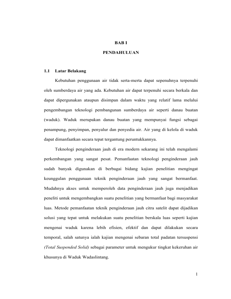 BAB I PENDAHULUAN BAB I PENDAHULUAN 1.1 Latar Belakang Kebutuhan penggunaan air tidak serta-merta dapat sepenuhnya terpenuhi oleh sumberdaya air yang ada. Kebutuhan air dapat terpenuhi secara berkala dan dapat dipergunakan ataupun disimpan dalam waktu yang relatif lama melalui pengembangan teknologi pembangunan sumberdaya air seperti danau buatan (waduk). Waduk merupakan danau buatan yang mempunyai fungsi sebagai penampung, penyimpan, penyalur dan penyedia air. Air yang di kelola di waduk dapat dimanfaatkan secara tepat tergantung peruntukkannya. Teknologi penginderaan jauh di era modern sekarang ini telah mengalami perkembangan yang sangat pesat. Pemanfaatan teknologi penginderaan jauh sudah banyak digunakan di berbagai bidang kajian penelitian mengingat keunggulan penggunaan teknik penginderaan jauh yang sangat bermanfaat. Mudahnya akses untuk memperoleh data penginderaan jauh juga menjadikan peneliti untuk mengembangkan suatu penelitian yang bermanfaat bagi masyarakat luas. Metode pemanfaatan teknik penginderaan jauh citra satelit dapat dijadikan solusi yang tepat untuk melakukan suatu penelitian berskala luas seperti kajian mengenai waduk karena lebih efisien, efektif dan dapat dilakukan secara temporal, salah satunya ialah kajian mengenai sebaran total padatan tersuspensi (Total Suspended Solid) sebagai parameter untuk mengukur tingkat kekeruhan air khusunya di Waduk Wadaslintang. 1 Waduk Wadaslintang terletak di bagian selatan wilayah Kecamatan Wadaslintang Kabupaten Wonosobo yang berbatasan langsung dengan Kecamatan Padureso Kabupaten Kebumen. Waduk Wadaslintang dibangun pada masa pemerintahan Presiden Soeharto pada tahun 1982 dan selesai pada tahun 1988 selama lebih kurang 7 tahun. Waduk Wadaslintang dibangun dengan tujuan pokok sebagai penopang kehidupan masyarakat sekitar khususnya. Fungsi utama waduk tersebut ialah sebagai irigasi, Pembangkit Listrik Tenaga Air (PLTA), pengendali banjir, penampung air, perikanan dan pariwisata (http://bbws-so.net, diakses 20 Juni 2015). Mengingat banyaknya manfaat dan kegunaan waduk sebagai fasilitator sumberdaya air, maka perlu adanya penanganan khusus terhadap waduk tersebut. Masalah terbesar yang dihadapi oleh Waduk Wadaslintang ialah penurunan fungsi dan kegunaan waduk yang disebabkan oleh pendangkalan sebagai akibat tingginya konsentrasi material-material (laju sedimentasi) yang masuk ke waduk. Perubahan penggunaan lahan di bagian hulu memegang peranan penting terhadap proses sedimentasi tersebut mengingat material bawaan tersebut merupakan hasil dari proses erosi yang awalnya berasal dari bagian hulu. Tanah yang terlarut akibat erosi pada akhirnya akan mengalami sedimentasi (pengendapan) di bagian hilir badan air sehingga mengakibatkan pendangkalan. Proses erosi dan sedimentasi perlu diperhitungkan dengan seksama, terutama pada waduk yang berfungsi sebagai pembangkit tenaga listrik (PLTA), pelabuhan, dan saluran-saluran air pembuang untuk mencegah terjadinya (banjir kanal). Laju 2 erosi dan sedimentasi yang tinggi dapat memperpendek umur waduk. (Effendi, 2003). Prioritas penanganan dan rehabilitasi waduk tidak hanya terfokus pada daerah waduk saja, melainkan pada daerah pewilayahan Daerah Aliran Sungai (DAS) seperti daerah hulu, tengah, dan hilir juga harus dipertimbangkan. Jika permasalahan tersebut tidak segera ditangani, bukan tidak mungkin masalahmasalah lain akan muncul seperti pencemaran perairan, penurunan kualitas perairan, dan penurunan debit air waduk yang disebabkan oleh tingginya laju sedimentasi yang masuk ke waduk dalam waktu yang sangat singkat sehingga merugikan banyak pihak pengguna waduk. Penelitian ini difokuskan pada persebaran TSS yang ada pada Waduk Wadaslintang sehingga dapat diketahui sejauh mana persebaran padatan tersuspensi yang telah mencemari perairan waduk. Total Suspended Solid (TSS) juga disebut padatan tersuspensi yaitu bahanbahan tersuspensi (diameter > 1 μm) yang tertahan pada saringan miliopore dengan diameter pori 0,45 μm. TSS terdiri dari lumpur dan pasir halus serta jasadjasad renik. Penyebab TSS di perairan yang utama adalah kikisan tanah atau erosi tanah yang terbawa ke badan air. Konsentrasi TSS apabila terlalu tinggi akan menghambat penetrasi cahaya ke dalam air dan mengakibatkan terganggunya proses fotosintesis (Effendi dalam Lestari, 2009:4). TSS dapat dijadikan sebagai indikator kekeruhan air dari proses sedimentasi. Sebagai gambaran bahwa total volume sedimen Waduk Wadaslintang pada awal pengukuran sebesar 460.037 m3/tahun selama 6 tahun yaitu dari tahun 1987- 3 1992. Pada pengukuran di tahun berikutnya yaitu tahun 1992-2004 mengalami peningkatan sebesar 1.923.812,09 m3/tahun selama 11 tahun. Peningkatan sedimen tersebut akibat aktivitas penjarahan hutan di daerah hulu yang berlangsung sejak tahun 2000-2004. Setelah dilaksanakan reboisasi lahan kritis, pada tahun 2004-2008 total muatan sedimen yang dihasilkan sebesar 711.247,34 m3/tahun selama 4 tahun dan sedimentasi waduk dinyatakan telah menurun (Bina, 2008). Pencegahan dan pengendalian sebagai upaya pelestarian waduk terhadap kualitas air perlu dilakukan agar pencemaran dan erosi yang berujung pada pendangkalan waduk dapat dikendalikan sebagaimana mestinya sehingga fungsi dan peran waduk tetap terpenuhi. Perlu adanya sebuah terobosan baru atau setidaknya dapat meminimalisir akibat-akibat yang akan terjadi dengan manajemen yang tepat. Di dalam kondisi alami, tubuh air pada umumnya tidak jernih namun terdapat bermacam-macam jenis material organik dan anorganik yang berbentuk suspensi. Material inilah yang mengakibatkan terjadinya hamburan dan penyerapan yang bervariasi dalam pemancaran energi melalui air. Interaksi antara hamburan, penyerapan, dan pemancaran mempengaruhi pantulan spektral yang dapat diukur. Interaksi ini menunjukkan bahwa perlu dilakukan penelitian lebih lanjut mengenai banyak variasi pantulan spektral pada macammacam kondisi air dengan analisis penginderaan jauh. Penanganan waduk dengan melihat distribusi spasial dari pa