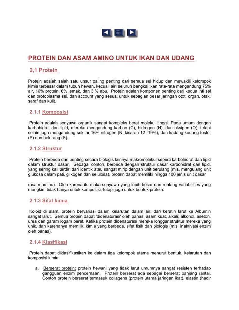 PROTEIN DAN ASAM AMINO UNTUK IKAN DAN UDANG 2,1 Protein Protein adalah salah satu unsur paling penting dari semua sel hidup dan mewakili kelompok kimia terbesar dalam tubuh hewan, kecuali air; seluruh bangkai ikan rata-rata mengandung 75% air, 16% protein, 6% lemak, dan 3 % abu. Protein adalah komponen penting dari kedua inti sel dan protoplasma sel, dan account yang sesuai untuk sebagian besar jaringan otot, organ, otak, saraf dan kulit. 2.1.1 Komposisi Protein adalah senyawa organik sangat kompleks berat molekul tinggi. Pada umum dengan karbohidrat dan lipid, mereka mengandung karbon (C), hidrogen (H), dan oksigen (O), tetapi selain juga mengandung sekitar 16% nitrogen (N: kisaran 12 -19%), dan kadang-kadang fosfor (P) dan belerang (S). 2.1.2 Struktur Protein berbeda dari penting secara biologis lainnya makromolekul seperti karbohidrat dan lipid dalam struktur dasar. Sebagai contoh, berbeda dengan struktur dasar karbohidrat dan lipid, yang sering kali terdiri dari identik atau sangat mirip dengan unit berulang (mis. mengulang unit glukosa dalam pati, glikogen dan selulosa), protein dapat memiliki hingga 100 jenis unit dasar (asam amino). Oleh karena itu maka senyawa yang lebih besar dan rentang variabilities yang mungkin, tidak hanya untuk komposisi, tetapi juga untuk bentuk protein. 2.1.3 Sifat kimia Koloid di alam, protein bervariasi dalam kelarutan dalam air, dari keratin larut ke Albumin sangat larut. Semua protein dapat 'didenaturasi' oleh panas, asam kuat, alkali, alkohol, aseton, urea dan garam logam berat. Ketika protein didenaturasi mereka longgar struktur mereka yang unik, dan karenanya memiliki kimia yang berbeda, sifat fisik dan biologis (mis. inaktivasi enzim oleh panas). 2.1.4 Klasifikasi Protein dapat diklasifikasikan ke dalam tiga kelompok utama menurut bentuk, kelarutan dan komposisi kimia: a. Berserat protein: protein hewani yang tidak larut umumnya sangat resisten terhadap gangguan enzim pencernaan. Protein berserat ada sebagai berserat panjang rantai. Contoh protein berserat termasuk collagens (protein utama jaringan ikat), elastin (hadir dalam jaringan elastis seperti arteri dan tendon), dan keratin (terdapat dalam rambut, kuku, wol dan kuku mamalia). b. Globular protein: meliputi semua enzim, antigen dan hormon protein. Globular protein dapat dibagi lagi menjadi Albumin (larut dalam air, panas-coagulable protein yang terjadi pada telur, susu, darah dan banyak tanaman); globulin (tidak larut atau hemat larut dalam air, dan hadir dalam telur, susu, dan darah, dan berfungsi sebagai cadangan protein utama dalam menanam benih), dan histon (protein dasar berat molekul rendah, larut dalam air, terjadi dalam inti sel yang terkait dengan asam deoksiribonukleat - DNA). c. Conjugated protein: ini adalah protein yang menghasilkan kelompok-kelompok nonprotein serta asam amino pada hidrolisis. Contoh-contoh termasuk phosphoproteins (kasein susu, kuning telur phosvitin), glikoprotein (lendir), lipoprotein (sel membran), chromoproteins (hemoglobin, haemocyanin, sitokrom, flavoproteins), dan nucleoproteins (kombinasi dari protein dengan asam nukleat hadir dalam inti sel). Fungsi Protein 2,2 Fungsi protein dapat diringkas sebagai berikut: Untuk memperbaiki jaringan dikenakan atau terbuang (jaringan perbaikan dan pemeliharaan) dan membangun jaringan baru (seperti protein dan pertumbuhan baru). Protein dapat catabolized sebagai sumber energi, atau dapat berfungsi sebagai substrat untuk pembentukan karbohidrat atau lipid jaringan. Protein diperlukan dalam tubuh hewan untuk pembentukan hormon, enzim dan berbagai zat lain yang penting secara biologis seperti antibodi dan hemoglobin. Protein 2,3 persyaratan Studi tentang persyaratan gizi makanan ikan dan udang telah hampir seluruhnya didasarkan pada studi yang sebanding dengan yang dilakukan dengan hewan ternak darat. Oleh karena itu maka bahwa hampir semua informasi yang tersedia tentang kebutuhan gizi makanan spesies akuakultur berasal dari makanan berdasarkan uji laboratorium; binatang yang disimpan dalam sebuah lingkungan yang terkendali kepadatan tinggi dan tidak memiliki akses ke makanan alami organisme. 2.3.1 Optimum tingkat protein Berdasarkan teknik pemberian makanan yang dipelopori dan dikembangkan untuk hewan darat kebutuhan protein ikan pertama kali diselidiki dalam Chinnok salmon (Oncorhynchus tshawytscha) oleh Delong, et al, (1958). Ikan diberi makan diet seimbang dinilai mengandung kadar protein yang berkualitas tinggi (kasein: campuran agar-agar dilengkapi dengan kristal asam amino untuk mensimulasikan profil asam amino seluruh protein telur ayam) selama jangka waktu 10 minggu dan tingkat protein yang diamati memberikan pertumbuhan yang optimal diambil sebagai persyaratan (Gambar 2). Karena studi-studi awal ini pendekatan yang digunakan oleh para pekerja saat ini telah berubah sangat sedikit kalaupun ada, dengan kemungkinan pengecualian pada digunakan oleh beberapa peneliti dari protein jaringan maksimum retensi atau keseimbangan nitrogen dalam preferensi untuk berat badan sebagai kriteria persyaratan (Ogino, 1980). Kebutuhan protein diet biasanya dinyatakan dalam persentase makanan tetap atau sebagai rasio energi protein diet. Gambar. 2. Khas kurva respons dosis Hingga saat ini lebih dari 30 spesies ikan dan udang telah diteliti dengan cara ini dan hasilnya menunjukkan seragam kebutuhan protein tinggi dalam kisaran 24-57%, atau setara dengan 3070% dari kandungan energi bruto dari makanan dalam bentuk protein (Tabel 1). Sementara kebutuhan protein tinggi mungkin diharapkan untuk jenis ikan karnivora, seperti plaice (Pleuronectes platessa -50%; Cowey et al, 1972) atau Snakehead (Channa micropeltes -52%; Wee dan Tacon, 1982), fakta bahwa kebutuhan protein yang relatif tinggi juga terlihat di rumput herbivora gurami (Ctenopharyngodon idella 41-43%; Dabrowski, 1977) menunjukkan bahwa sebagian persyaratan mungkin merupakan fungsi dari metodologi yang digunakan untuk penentuan. Yang digunakan oleh pekerja yang berbeda dari berb