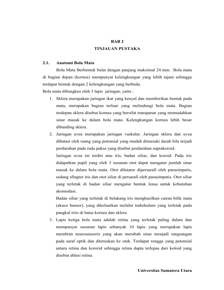 BAB 2 TINJAUAN PUSTAKA 2.1. Anatomi Bola Mata Bola Mata Berbentuk bulat dengan panjang maksimal 24 mm. Bola mata di bagian depan (kornea) mempunyai kelengkungan yang lebih tajam sehingga terdapat bentuk dengan 2 kelengkungan yang berbeda. Bola mata dibungkus oleh 3 lapis jaringan, yaitu : 1. Sklera merupakan jaringan ikat yang kenyal dan memberikan bentuk pada mata, merupakan bagian terluar yang melindungi bola mata. Bagian terdepan sklera disebut kornea yang bersifat transparan yang memudahkan sinar masuk ke dalam bola mata. Kelengkungan kornea lebih besar dibanding sklera. 2. Jaringan uvea merupakan jaringan vaskular. Jaringan sklera dan uvea dibatasi oleh ruang yang potensial yang mudah dimasuki darah bila terjadi perdarahan pada ruda paksa yang disebut perdarahan suprakoroid. Jaringan uvea ini terdiri atas iris, badan siliar, dan koroid. Pada iris didapatkan pupil yang oleh 3 susunan otot dapat mengatur jumlah sinar masuk ke dalam bola mata. Otot dilatator dipersarafi oleh parasimpatis, sedang sfingter iris dan otot siliar di persarafi oleh parasimpatis. Otot siliar yang terletak di badan siliar mengatur bentuk lensa untuk kebutuhan akomodasi. Badan siliar yang terletak di belakang iris menghasilkan cairan bilik mata (akuos humor), yang dikeluarkan melalui trabekulum yang terletak pada pangkal irirs di batas kornea dan sklera. 3. Lapis ketiga bola mata adalah retina yang terletak paling dalam dan mempunyai susunan lapis sebanyak 10 lapis yang merupakan lapis membran neurosensoris yang akan merubah sinar menjadi rangsangan pada saraf optik dan diteruskan ke otak. Terdapat rongga yang petonsial antara retina dan kororid sehingga retina dapta terlepas dari koloid yang disebut ablasi retina. Universitas Sumatera Utara Badan kaca mengisi rongga di dalam bola mata dan bersifat gelatin yang hanya menempel papil saraf optik, makula dan pars plana. Bila terdapat jaringan ikat di dalma badan kaca disertai dengan tarikan pada retina, maka akan robek dan terjadi ablasi retina. Lensa terletak di belakang pupil yang dipegang di daerah ekuatornya pada badan siliar melalui Zonula Zinn. Lensa mata mempunyai peranan pada akomodasi atau melihat dekat sehingga sinar dapat difokuskan di daerah makula lutea. Terdapat 6 otot penggerak bola mata, dan terdapat kelenjar lakrimal yang terletak di daerah temporal atas di dalam rongga orbita. Gambar 2.1. Anatomi Mata (Luiz Carlos Junquirea, 2007) 2.1.1. Kornea Universitas Sumatera Utara Kornea (Latin cornum = seperti tanduk) adalah selaput bening mata, bagian selaput mata yang tembus cahaya, merupakan lapis jaringan yang menutup bola mata sebelah depan dan terdiri atas: 1. Epitel Tebalnya 50 μm, terdiri atas 5 lapis sel epitel tidak bertanduk yang saling tumpah tindih; satu lapis sel basal, sel poligonal dan sel gepeng. Pada sel basal sering terlihat mitosis sel, dal sel muda ini terdorong ke depan menjadi lapis sel sayap dan semakin maju ke depan menjadi sel gepeng, sel basal berikatan erat dengan sel basal di sampingnya dan sel poligonal di depannya melalui desmosom dan makula okluden; ikatan ini menghambat pengaliran air, elektrolit, dan glukosa yang merupakan barrier. Sel basal menghasilkan membran basal yang melekat erat kepadanya. Bila terjadi gangguan akan mengakibatkan erosi rekuren. 2. Epitel berasal dari ektoderm permukaan. Membran Bowman Terletak di bawah membran basal epitel kornea yang merupakan kolagen yang tersusun tidak teratur seperti stroma dan berasal dari bagian depan stroma. 3. Lapis ini tidak mempunyai daya regenerasi. Stroma Terdiri atas lamel yang merupakan susunan kolagen yang sejajar dengan lainnya, pada permukaan terlihat anyaman yang teratur sedang di bagian perifer serat kolagen ini bercabang; terbentuknya kembali serat kolagen memakan waktu lama yang kadang-kadang sampai 15 bulan. Keratosit merupakan sel stroma kornea yang merupakan fibroblas terletak di antara serat kolagen stroma. Universitas Sumatera Utara Diduga keratosit membentuk bahan dasar dan serat kolagen dalam perkembangan embrio atau sesudah trauma. 4. Membran Descement Merupakan membran aselular dan merupakan batas belakang stroma kornea dihasilkan sel endotel dan merupakan membran basalnya Bersifat sangat elastik dan berkembang terus seumur hidup, mempunyai tebal 40 μm. 5. Endotel Berasal dari mesotelium, berlapis satu, bentuk hexagonal, besar 2040 μm. Endotel-melekat pada membran descement melalui hemidesmosom dan zonula okluden. Kornea dipersarafi oleh banyak saraf sensoris terutama berasal dari saraf siliar longus, saraf nasosiliar, saraf ke V saraf siliar longus berjalan suprakoroid, masuk ke dalam stroma kornea, menembus membran Bowman melepaskan selubung Schwannya. Seluruh lapis epitel dipersarafi smapai pada kedua lapis terdepan tanpa ada akhir saraf. Bulbus krause untuk sensasi dingin ditemukan di daerah limbus. Daya regenerasi saraf sesudah dipotong di daerah limbus terjadi dalam waktu 3 bulan. Trauma atau penyakit yang merusak endotel akan mengakibatkan sistem pompa endotel terganggu sehingga dekompensasi endotel dan terjadi edema korne. Endotel tidak mempunyai daya regenerasi. Kornea merupakan bagian mata yang tembus cahaya dan mnutup bola mata di sebelah depan. Pembiasan sinar terkuat dilakukan oleh kornea, dimana 40 dioptri dari 50 dioptri pembiasan sinar masuk kornea dilakukan oleh kornea. (Prof. dr. H. Sidarta Ilyas, Sp.M : Ilmu Penyakit Mata, 2007) 2.1.2. Uvea Lapis vaskular di dalam bola mata yang terdiri atas iris, badan siliar dan koroid. Universitas Sumatera Utara Perdarahan uvea dibedakan antara bagian anterior yang diperdarahi oleh 2 buah arteri siliar posterior longus yang masuk menembus sklera di temporal dan nasal dekat tempat masuk saraf optik dan 7 buah arteri siliar anterior, yang terdapat 2 pada setiap otot superior, medial inferior satu pada otot rektus lateral. Arteri siliar anterior dan posterior ini bergabung menjadi satu membentuk arteri sirkularis mayor pada badan siliar. Uvae posterior mendapat bperdarah dari 15-20 buah arteri sil