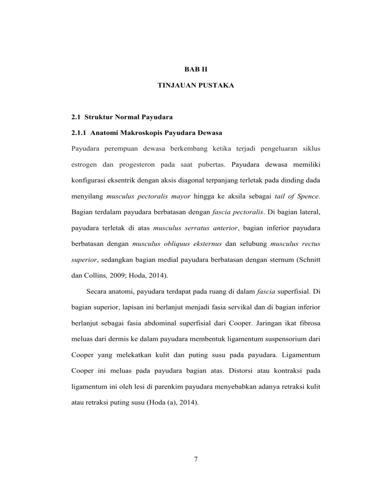 BAB II TINJAUAN PUSTAKA 2.1 Struktur Normal Payudara 2.1.1 Anatomi Makroskopis Payudara Dewasa Payudara perempuan dewasa berkembang ketika terjadi pengeluaran siklus estrogen dan progesteron pada saat pubertas. Payudara dewasa memiliki konfigurasi eksentrik dengan aksis diagonal terpanjang terletak pada dinding dada menyilang musculus pectoralis mayor hingga ke aksila sebagai tail of Spence. Bagian terdalam payudara berbatasan dengan fascia pectoralis. Di bagian lateral, payudara terletak di atas musculus serratus anterior, bagian inferior payudara berbatasan dengan musculus obliquus eksternus dan selubung musculus rectus superior, sedangkan bagian medial payudara berbatasan dengan sternum (Schnitt dan Collins, 2009; Hoda, 2014). Secara anatomi, payudara terdapat pada ruang di dalam fascia superfisial. Di bagian superior, lapisan ini berlanjut menjadi fasia servikal dan di bagian inferior berlanjut sebagai fasia abdominal superfisial dari Cooper. Jaringan ikat fibrosa meluas dari dermis ke dalam payudara membentuk ligamentum suspensorium dari Cooper yang melekatkan kulit dan puting susu pada payudara. Ligamentum Cooper ini meluas pada payudara bagian atas. Distorsi atau kontraksi pada ligamentum ini oleh lesi di parenkim payudara menyebabkan adanya retraksi kulit atau retraksi puting susu (Hoda (a), 2014). 7 8 Sirkulasi arterial payudara berasal dari arteria thoracica interna, arteria axillaris dan arteria intercostalis. Aliran darah vena umumnya mengikuti distribusi arteri. Vena-vena superfisial umumnya mengalirkan darahnya ke vena thoracica interna yang alirannya sesuai dengan aliran arteri thoracica interna (Hoda (a), 2014). Aliran limfatik payudara lebih kompleks dibandingkan organ lain, sebab berasal dari hubungan dua sistem yaitu pleksus subepitel pada kulit dan aliran limfatik dari parenkim payudara. Pada parenkim payudara, aliran limfatik berada pada stroma khusus periduktal (Tavassoli dan Eusebi, 2009). 2.1.2 Anatomi Mikroskopis Payudara Dewasa Anatomi normal payudara dewasa terdiri dari dua struktur utama yaitu duktus dan lobulus, dua tipe sel yaitu sel luminal dan mioepitel serta dua tipe stroma yaitu interlobular dan intralobular. Enam sampai sepuluh duktus bermuara pada kulit permukaan puting. Lapisan superfisial terdiri dari sel skuamus yang kemudian berubah menjadi dua lapisan epitel yaitu sel luminal dan mioepitel pada duktus atau lobulus. Cabang-cabang duktus besar selanjutnya akan menjadi unit lobular duktus terminal (Gambar 2.1). Pada wanita dewasa, duktus terminal bercabangcabang menjadi asini kecil memberikan gambaran yang menyerupai buah anggur dan bersama-sama membentuk satu lobulus (Rosai, 2011; Lester, 2015). Stroma intralobular mengandung lebih banyak pembuluh darah kapiler dan dengan kolagen yang kurang padat dibandingkan stroma interlobular. Stroma intralobular membungkus asini dari lobulus dan tersusun atas sel-sel fibroblas 9 yang responsif terhadap hormon spesifik dan sedikit sebaran limfosit, sedangkan stroma interlobular, terdiri dari jaringan ikat fibrus padat dan jaringan lemak. (Gallagher, 2007; Lester, 2015). Gambar 2.1 Gambar anatomi payudara normal (Lester, 2015) 2.2 Apoptosis 2.2.1 Penyebab Apoptosis Apoptosis adalah jalur kematian sel yang disebabkan oleh program kematian sel yang diatur dengan ketat, dimana sel yang diharuskan untuk mati mengaktifkan enzim yang memecah DNA nukleus sel itu sendiri dan protein pada nukleus serta sitoplasma. Sel yang mengalami apoptosis dipecah menjadi bagian-bagian kecil disebut badan apoptosis, kemudian mengalami fagositosis (Kumar et al., 2015). Penyebab apoptosis adalah keadaan fisiologis atau patologis (Tabel 2.1). 10 Tabel 2.1 Penyebab Apoptosis (Wong, 2011) Keadaan fisiologis: Program kematian sel dalam perkembangan embrional dengan tujuan pengurangan jaringan. Involusi fisiologis seperti pada pelepasan endometrium, regresi payudara laktasi. Kerusakan sel normal akibat proliferasi pergantian seperti pada epitel usus. Regresi dari timus pada usia anak-anak. Keadaan patologis: Obat anti kanker yang menginduksi kematian sel pada tumor. Sel T sitotoksik menginduksi kematian sel seperti pada penolakan imunitas dan penyakit graft melawan host. Kematian sel progresif dan deplesi sel CD4+ pada AIDS. Beberapa bentuk kematian sel yang diinduksi virus seperti hepatitis B atau C. Atrofi patologis organ dan jaringan sebagai hasil dari stimulus seperti atrofi prostat setelah orchidectomy. Apoptosis akibat agen penyebab injuri seperti radiasi, hipoksia, dan panas ringan. Apoptosis pada penyakit degeneratif seperti Penyakit Alzheimer dan Parkinson. Apoptosis yang terjadi pada penyakit jantung seperti infark myokardium. 2.2.2 Perubahan Morfologi dan Biokimia pada Apoptosis Perubahan morfologi pada sel akibat apoptosis terjadi pada nukleus dan sitoplasma. Pada nukleus terjadi kondensasi kromatin dan fragmentasi nukleus, kemudian diikuti oleh pembulatan sel, pengurangan volume sel dan retraksi pseudopoda. Kondensasi kromatin diawali pada bagian perifer membran nukleus, membentuk struktur seperti bulan sabit atau menyerupai cincin. Kromatin selanjutnya mengalami kondensasi sampai terjadi pemecahan di dalam sel dengan membran yang masih utuh, hal ini disebut karioreksis. Membran plasma tetap utuh selama proses ini. Pada tahap akhir apoptosis, terjadi beberapa perubahan 11 morfologi seperti pembengkakan membran, modifikasi ultrastruktur organella sitoplasma dan kehilangan integritas membran. Biasanya sel fagositik menelan sel apoptosis sebelum terbentuknya badan apoptosis. Jika sisa sel apoptosis tidak difagositosis seperti pada lingkungan kultur sel buatan, maka akan mengalami degradasi menyerupai nekrosis dan disebut nekrosis sekunder (Wong, 2011). Secara umum ada tiga perubahan biokimia utama pada apoptosis yaitu aktivasi caspase, pemecahan DNA dan protein serta perubahan membran dan pengenalan oleh sel fagosit. Pada awal apoptosis, terdapat ekspresi phosphatidylserine (PS) pada lapisan terluar membran sel. Ini menyebabkan peng