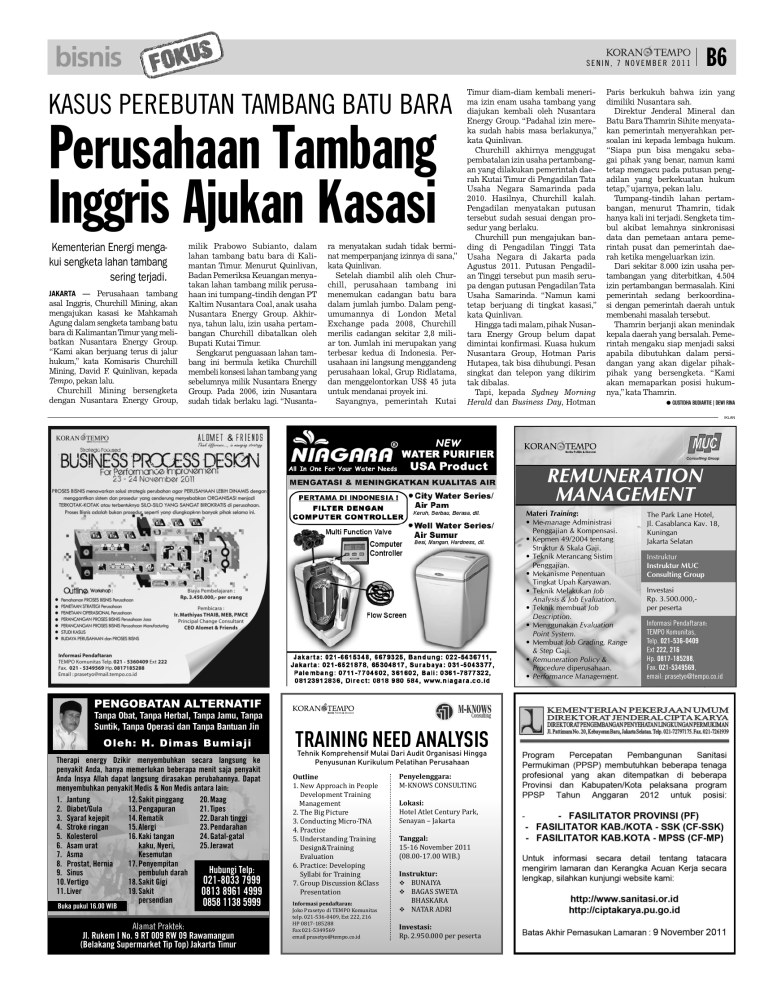 bisnis SENIN, 7 NOVEMBER 2011 KASUS PEREBUTAN TAMBANG BATU BARA Perusahaan Tambang Inggris Ajukan Kasasi Kementerian Energi mengakui sengketa lahan tambang sering terjadi. JAKARTA — Perusahaan tambang asal Inggris, Churchill Mining, akan mengajukan kasasi ke Mahkamah Agung dalam sengketa tambang batu bara di Kalimantan Timur yang melibatkan Nusantara Energy Group. “Kami akan berjuang terus di jalur hukum,” kata Komisaris Churchill Mining, David F. Quinlivan, kepada Tempo, pekan lalu. Churchill Mining bersengketa dengan Nusantara Energy Group, milik Prabowo Subianto, dalam lahan tambang batu bara di Kalimantan Timur. Menurut Quinlivan, Badan Pemeriksa Keuangan menyatakan lahan tambang milik perusahaan ini tumpang-tindih dengan PT Kaltim Nusantara Coal, anak usaha Nusantara Energy Group. Akhirnya, tahun lalu, izin usaha pertambangan Churchill dibatalkan oleh Bupati Kutai Timur. Sengkarut penguasaan lahan tambang ini bermula ketika Churchill membeli konsesi lahan tambang yang sebelumnya milik Nusantara Energy Group. Pada 2006, izin Nusantara sudah tidak berlaku lagi. “Nusanta- ra menyatakan sudah tidak berminat memperpanjang izinnya di sana,” kata Quinlivan. Setelah diambil alih oleh Churchill, perusahaan tambang ini menemukan cadangan batu bara dalam jumlah jumbo. Dalam pengumumannya di London Metal Exchange pada 2008, Churchill merilis cadangan sekitar 2,8 miliar ton. Jumlah ini merupakan yang terbesar kedua di Indonesia. Perusahaan ini langsung menggandeng perusahaan lokal, Grup Ridlatama, dan menggelontorkan US$ 45 juta untuk mendanai proyek ini. Sayangnya, pemerintah Kutai Timur diam-diam kembali menerima izin enam usaha tambang yang diajukan kembali oleh Nusantara Energy Group. “Padahal izin mereka sudah habis masa berlakunya,” kata Quinlivan. Churchill akhirnya menggugat pembatalan izin usaha pertambangan yang dilakukan pemerintah daerah Kutai Timur di Pengadilan Tata Usaha Negara Samarinda pada 2010. Hasilnya, Churchill kalah. Pengadilan menyatakan putusan tersebut sudah sesuai dengan prosedur yang berlaku. Churchill pun mengajukan banding di Pengadilan Tinggi Tata Usaha Negara di Jakarta pada Agustus 2011. Putusan Pengadilan Tinggi tersebut pun masih serupa dengan putusan Pengadilan Tata Usaha Samarinda. “Namun kami tetap berjuang di tingkat kasasi,” kata Quinlivan. Hingga tadi malam, pihak Nusantara Energy Group belum dapat dimintai konfirmasi. Kuasa hukum Nusantara Group, Hotman Paris Hutapea, tak bisa dihubungi. Pesan singkat dan telepon yang dikirim tak dibalas. Tapi, kepada Sydney Morning Herald dan Business Day, Hotman B6 Paris berkukuh bahwa izin yang dimiliki Nusantara sah. Direktur Jenderal Mineral dan Batu Bara Thamrin Sihite menyatakan pemerintah menyerahkan persoalan ini kepada lembaga hukum. “Siapa pun bisa mengaku sebagai pihak yang benar, namun kami tetap mengacu pada putusan pengadilan yang berkekuatan hukum tetap,” ujarnya, pekan lalu. Tumpang-tindih lahan pertambangan, menurut Thamrin, tidak hanya kali ini terjadi. Sengketa timbul akibat lemahnya sinkronisasi data dan pemetaan antara pemerintah pusat dan pemerintah daerah ketika mengeluarkan izin. Dari sekitar 8.000 izin usaha pertambangan yang diterbitkan, 4.504 izin pertambangan bermasalah. Kini pemerintah sedang berkoordinasi dengan pemerintah daerah untuk membenahi masalah tersebut. Thamrin berjanji akan menindak kepala daerah yang bersalah. Pemerintah mengaku siap menjadi saksi apabila dibutuhkan dalam persidangan yang akan digelar pihakpihak yang bersengketa. “Kami akan memaparkan posisi hukumnya,” kata Thamrin. ● GUSTIDHA BUDIARTIE | DEWI RINA IKLAN REMUNERATION MANAGEMENT Materi Training: • Me-manage Administrasi Penggajian & Kompensasi. • Kepmen 49/2004 tentang Struktur & Skala Gaji. • Teknik Merancang Sistim Penggajian. • Mekanisme Penentuan Tingkat Upah Karyawan. • Teknik Melakukan Job Analysis & Job Evaluation. • Teknik membuat Job Description. • Menggunakan Evaluation Point System. • Membuat Job Grading, Range & Step Gaji. • Remuneration Policy & Procedure diperusahaan. • Performance Management. PENGOBATAN ALTERNATIF Tanpa Obat, Tanpa Herbal, Tanpa Jamu, Tanpa Suntik, Tanpa Operasi dan Tanpa Bantuan Jin Oleh: H. Dimas Bumiaji Therapi energy Dzikir menyembuhkan secara langsung ke penyakit Anda, hanya memerlukan beberapa menit saja penyakit Anda Insya Allah dapat langsung dirasakan perubahannya. Dapat menyembuhkan penyakit Medis & Non Medis antara lain: 1. Jantung 12. Sakit pinggang 20. Maag 2. Diabet/Gula 13. Pengapuran 21. Tipes 22. Darah tinggi 3. Syaraf kejepit 14. Rematik 15. Alergi 23. Pendarahan 4. Stroke ringan 5. Kolesterol 16. Kaki tangan 24. Gatal-gatal 6. Asam urat kaku, Nyeri, 25. Jerawat 7. Asma Kesemutan 17. Penyempitan 8. Prostat, Hernia Hubungi Telp: pembuluh darah 9. Sinus 021-8033 7999 10. Vertigo 18. Sakit Gigi 11. Liver 19. Sakit 0813 8961 4999 persendian 0858 1138 5999 Buka pukul 16.00 WIB Alamat Praktek: Jl. Rukem I No. 9 RT 009 RW 09 Rawamangun (Belakang Supermarket Tip Top) Jakarta Timur Berita Politik & Ekonomi TRAINING NEED ANALYSIS Tehnik Komprehensif Mulai Dari Audit Organisasi Hingga Penyusunan Kurikulum Pelatihan Perusahaan Outline ͳǤ ʹǤ ͵Ǥ Ǧ ͶǤ ͷǤ Ƭ Ǥ ǣ Ǥ Ƭ Informasi pendaftaran: ǤͲʹͳǦͷ͵ǦͲͶͲͻǡʹʹʹǡʹͳ ͲͺͳǦͳͺͷʹͺͺ ͲʹͳǦͷ͵Ͷͻͷͻ ̷Ǥ Ǥ Penyelenggara: Ǧ Lokasi: ǡ Ȃ Tanggal: ͳͷǦͳʹͲͳͳ ȋͲͺǤͲͲǦͳǤͲͲǤȌ Instruktur: Investasi: ǤʹǤͻͷͲǤͲͲͲ The Park Lane Hotel, Jl. Casablanca Kav. 18, Kuningan Jakarta Selatan Instruktur Instruktur MUC Consulting Group Investasi Rp. 3.500.000,per peserta Informasi Pendaftaran: TEMPO Komunitas, Telp. 021-536-0409 Ext 222, 216 Hp. 0817-185288, Fax. 021-5349569, email: prasetyo@tempo.co.id