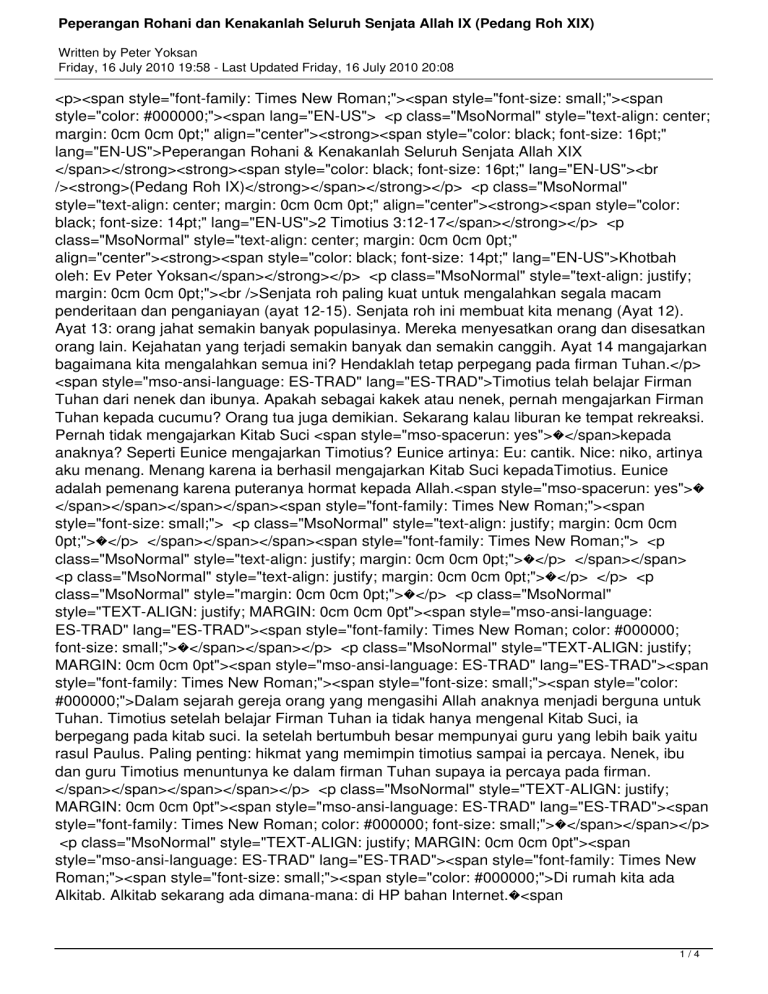 Peperangan Rohani dan Kenakanlah Seluruh Senjata Allah IX (Pedang Roh XIX) Written by Peter Yoksan Friday, 16 July 2010 19:58 - Last Updated Friday, 16 July 2010 20:08 <p><span style="font-family: Times New Roman;"><span style="font-size: small;"><span style="color: #000000;"><span lang="EN-US"> <p class="MsoNormal" style="text-align: center; margin: 0cm 0cm 0pt;" align="center"><strong><span style="color: black; font-size: 16pt;" lang="EN-US">Peperangan Rohani & Kenakanlah Seluruh Senjata Allah XIX </span></strong><strong><span style="color: black; font-size: 16pt;" lang="EN-US"><br /><strong>(Pedang Roh IX)</strong></span></strong></p> <p class="MsoNormal" style="text-align: center; margin: 0cm 0cm 0pt;" align="center"><strong><span style="color: black; font-size: 14pt;" lang="EN-US">2 Timotius 3:12-17</span></strong></p> <p class="MsoNormal" style="text-align: center; margin: 0cm 0cm 0pt;" align="center"><strong><span style="color: black; font-size: 14pt;" lang="EN-US">Khotbah oleh: Ev Peter Yoksan</span></strong></p> <p class="MsoNormal" style="text-align: justify; margin: 0cm 0cm 0pt;"><br />Senjata roh paling kuat untuk mengalahkan segala macam penderitaan dan penganiayan (ayat 12-15). Senjata roh ini membuat kita menang (Ayat 12). Ayat 13: orang jahat semakin banyak populasinya. Mereka menyesatkan orang dan disesatkan orang lain. Kejahatan yang terjadi semakin banyak dan semakin canggih. Ayat 14 mangajarkan bagaimana kita mengalahkan semua ini? Hendaklah tetap perpegang pada firman Tuhan.</p> <span style="mso-ansi-language: ES-TRAD" lang="ES-TRAD">Timotius telah belajar Firman Tuhan dari nenek dan ibunya. Apakah sebagai kakek atau nenek, pernah mengajarkan Firman Tuhan kepada cucumu? Orang tua juga demikian. Sekarang kalau liburan ke tempat rekreaksi. Pernah tidak mengajarkan Kitab Suci <span style="mso-spacerun: yes">�</span>kepada anaknya? Seperti Eunice mengajarkan Timotius? Eunice artinya: Eu: cantik. Nice: niko, artinya aku menang. Menang karena ia berhasil mengajarkan Kitab Suci kepadaTimotius. Eunice adalah pemenang karena puteranya hormat kepada Allah.<span style="mso-spacerun: yes">� </span></span></span></span><span style="font-family: Times New Roman;"><span style="font-size: small;"> <p class="MsoNormal" style="text-align: justify; margin: 0cm 0cm 0pt;">�</p> </span></span></span><span style="font-family: Times New Roman;"> <p class="MsoNormal" style="text-align: justify; margin: 0cm 0cm 0pt;">�</p> </span></span> <p class="MsoNormal" style="text-align: justify; margin: 0cm 0cm 0pt;">�</p> </p> <p class="MsoNormal" style="margin: 0cm 0cm 0pt;">�</p> <p class="MsoNormal" style="TEXT-ALIGN: justify; MARGIN: 0cm 0cm 0pt"><span style="mso-ansi-language: ES-TRAD" lang="ES-TRAD"><span style="font-family: Times New Roman; color: #000000; font-size: small;">�</span></span></p> <p class="MsoNormal" style="TEXT-ALIGN: justify; MARGIN: 0cm 0cm 0pt"><span style="mso-ansi-language: ES-TRAD" lang="ES-TRAD"><span style="font-family: Times New Roman;"><span style="font-size: small;"><span style="color: #000000;">Dalam sejarah gereja orang yang mengasihi Allah anaknya menjadi berguna untuk Tuhan. Timotius setelah belajar Firman Tuhan ia tidak hanya mengenal Kitab Suci, ia berpegang pada kitab suci. Ia setelah bertumbuh besar mempunyai guru yang lebih baik yaitu rasul Paulus. Paling penting: hikmat yang memimpin timotius sampai ia percaya. Nenek, ibu dan guru Timotius menuntunya ke dalam firman Tuhan supaya ia percaya pada firman. </span></span></span></span></p> <p class="MsoNormal" style="TEXT-ALIGN: justify; MARGIN: 0cm 0cm 0pt"><span style="mso-ansi-language: ES-TRAD" lang="ES-TRAD"><span style="font-family: Times New Roman; color: #000000; font-size: small;">�</span></span></p> <p class="MsoNormal" style="TEXT-ALIGN: justify; MARGIN: 0cm 0cm 0pt"><span style="mso-ansi-language: ES-TRAD" lang="ES-TRAD"><span style="font-family: Times New Roman;"><span style="font-size: small;"><span style="color: #000000;">Di rumah kita ada Alkitab. Alkitab sekarang ada dimana-mana: di HP bahan Internet.�<span 1/4 Peperangan Rohani dan Kenakanlah Seluruh Senjata Allah IX (Pedang Roh XIX) Written by Peter Yoksan Friday, 16 July 2010 19:58 - Last Updated Friday, 16 July 2010 20:08 style="mso-spacerun: yes">�</span>Apa gunanya Alkitab ini? Dunia ini sekarang menyedot dan merampas waktu manusia dengan begitu hebat. Waktuya telah dirampas dunia. Pagi-pagi sudah harus bangun untuk sekolah. Sampai sore baru pulang. Sampai rumah ada les sampai malam. Tidak ada waktu untuk Tuhan. Orang yang bekerja juga demikian. Kita harus bagaimana? Mempunyai rencana untuk firman Tuhan. Sekarang kita sudah harus belajar ayat 13,14,15. Firman Tuhan adalah senjata rohani yang paling kuat, memberikan kita kebenaran. </span></span></span></span></p> <p class="MsoNormal" style="TEXT-ALIGN: justify; MARGIN: 0cm 0cm 0pt"><span style="mso-ansi-language: ES-TRAD" lang="ES-TRAD"><span style="font-family: Times New Roman; color: #000000; font-size: small;">�</span></span></p> <p class="MsoNormal" style="TEXT-ALIGN: justify; MARGIN: 0cm 0cm 0pt"><span style="mso-ansi-language: ES-TRAD" lang="ES-TRAD"><span style="font-family: Times New Roman;"><span style="font-size: small;"><span style="color: #000000;">Ayat16: firman Tuhan inspirasikan oleh sAllah sendiri. Karena diinspiriaskan oleh Allah, Maka paling sempurna. Tidak ada yang cacat. Di dunia pasti ada yang cacat. Mobil paling kuat: Toyota. Di amerika berpuluh-puluh ribu Toyota perlu masuk bengkel karena pedal-gasnya rusak. Yang paling sempurna di dunia adalah Alkitab. Kejadian 2 & 3 disebutkan bahwa semua yang diciptakan Allah sungguh amat baik. Di taman Eden Adam tidak pernah: sakit, menangis dan sedih, karena tidak ada dosa. Setelah Adam dan Hawa jatuh dalam dosa, dunia menjadi rusak. Apapun yang dibuat manusia pasti ada cacatnya. Saat ini, apa yang sempurna di dunia ini? Yaitu firman Tuhan. Kenapa? Karena diilhamkan oleh Tuhan. Diilhamkan adalah bahasa asli: