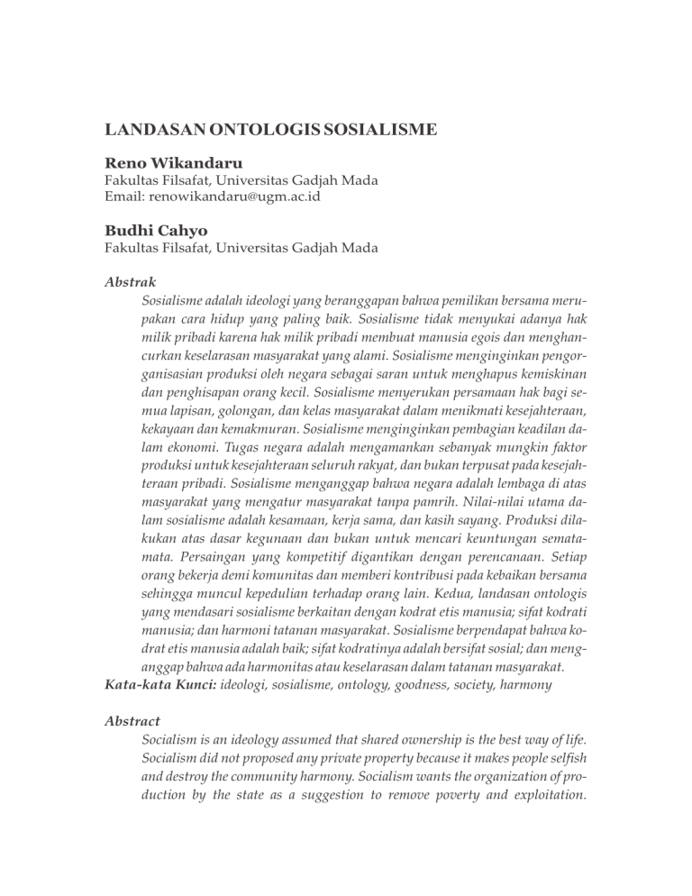 LANDASAN ONTOLOGIS SOSIALISME Reno Wikandaru Fakultas Filsafat, Universitas Gadjah Mada Email: renowikandaru@ugm.ac.id Budhi Cahyo Fakultas Filsafat, Universitas Gadjah Mada Abstrak Sosialisme adalah ideologi yang beranggapan bahwa pemilikan bersama merupakan cara hidup yang paling baik. Sosialisme tidak menyukai adanya hak milik pribadi karena hak milik pribadi membuat manusia egois dan menghancurkan keselarasan masyarakat yang alami. Sosialisme menginginkan pengorganisasian produksi oleh negara sebagai saran untuk menghapus kemiskinan dan penghisapan orang kecil. Sosialisme menyerukan persamaan hak bagi semua lapisan, golongan, dan kelas masyarakat dalam menikmati kesejahteraan, kekayaan dan kemakmuran. Sosialisme menginginkan pembagian keadilan dalam ekonomi. Tugas negara adalah mengamankan sebanyak mungkin faktor produksi untuk kesejahteraan seluruh rakyat, dan bukan terpusat pada kesejahteraan pribadi. Sosialisme menganggap bahwa negara adalah lembaga di atas masyarakat yang mengatur masyarakat tanpa pamrih. Nilai-nilai utama dalam sosialisme adalah kesamaan, kerja sama, dan kasih sayang. Produksi dilakukan atas dasar kegunaan dan bukan untuk mencari keuntungan sematamata. Persaingan yang kompetitif digantikan dengan perencanaan. Setiap orang bekerja demi komunitas dan memberi kontribusi pada kebaikan bersama sehingga muncul kepedulian terhadap orang lain. Kedua, landasan ontologis yang mendasari sosialisme berkaitan dengan kodrat etis manusia; sifat kodrati manusia; dan harmoni tatanan masyarakat. Sosialisme berpendapat bahwa kodrat etis manusia adalah baik; sifat kodratinya adalah bersifat sosial; dan menganggap bahwa ada harmonitas atau keselarasan dalam tatanan masyarakat. Kata-kata Kunci: ideologi, sosialisme, ontology, goodness, society, harmony Abstract Socialism is an ideology assumed that shared ownership is the best way of life. Socialism did not proposed any private property because it makes people selfish and destroy the community harmony. Socialism wants the organization of production by the state as a suggestion to remove poverty and exploitation. Reno Wikandaru, Budhi Cahyo 113 Socialism proposed equal rights for all groups, and classes of people to enjoy prosperity, wealth and prosperity. The state has to secure as much as possible factor of production for the welfare of all the people, and not focused on personal well-being. Socialism assumes that the state is above public institutions that govern society selflessly. The key values in socialism is equality, cooperation, and compassion. The production is done on the basis of usability and not just for the profit. Competition replaced with planning. Every person working for the community and contribute to the common good so that it appears concern for others. Second, the underlying ontological foundation of socialism ideology associated with the ethical nature of man; human nature; and harmony of the society. The ideology of socialism found ethical nature of man is good; human nature is a social being; and assumes that there is harmony in the society. Keywords: ideology, socialism, ontology, goodness, society, harmony PENDAHULUAN Ideologi adalah salah satu istilah yang memiliki cakupan yang luas karena istilah ideologi sesungguhnya dapat dibicarakan dalam banyak konteks. Ideologi dapat dibicarakan dalam konteks pendidikan, ilmu, dan tentu saja dalam konteks politik. Mengingat begitu luasnya cakupan istilah ideologi tersebut, penting karenanya untuk disampaikan di awal penelitian ini bahwa ideologi yang dikaji dalam penelitian ini adalah ideologi politik, yaitu ideologi yang menjadi landasan atau yang berkembang dalam praktek kehidupan politik. Ideologi adalah satu istilah penting yang menjadi salah satu fokus pembicaraan dalam perbincangan tentang politik, atau dalam perbincangan yang terkait dengan kehidupan kenegaraan. Hal ini tidak lain disebabkan karena ideologi merupakan salah satu faktor penting dan sekaligus bersifat mutlak dalam rangka menjaga eksistensi dan kelangsungan hidup satu bangsa atau negara. Ideologi, singkatnya, menjadi sumber nilai yang menjadi acuan dalam kehidupan masyarakat, yang pada gilirannya menjadi pedoman tingkah laku warga negara melalui penjabaran dalam bentuk peraturan hukum. Ideologi, dapat juga difungsikan sebagai kepribadian suatu bangsa dan atau negara karena ideologi juga menunjukkan orientasi suatu masyarakat, yaitu terkait dengan nilai-nilai yang dianggap penting oleh masyarakat tersebut. 114 Jurnal Filsafat, Vol. 26, No. 1, Februari 2016 Di era globalisasi seperti sekarang ini, persoalan ideologi memang jarang sekali dibicarakan karena secara umum perhatian dunia mengarah pada persoalan pertumbuhan ekonomi dan kaitannya dengan stabilitas ekonomi global. Hal ini, namun demikian, tidak berarti persoalan ideologi menjadi hilang begitu saja. Disadari atau tidak, persoalan yang bersangkutan dengan ideologi masih ada, dan bahkan menjadi semakin krusial di masa globalisasi ini karena terjadinya “percampuran” bermacam-macam ideologi. Globalisasi telah membuka kran informasi sehingga segala hal yang berasal dari sumber asing bisa dengan mudah masuk dan mempengaruhi kehidupan masyarakat, termasuk salah satunya ideologi tersebut. Hal ini menimbulkan persoalan, khususnya bagi masyarakat atau negara yang tidak memiliki basis ideologis kuat karena bisa menjadi rentan untuk terkontaminasi dengan berbagai ideologi yang berasal dari luar. Berbicara tentang ideologi, ada berbagai macam ideologi yang berkembang dalam sejarah manusia. Liberalisme, sosialisme, komunisme, fasisme, adalah beberapa nama ideologi yang berkembang dalam sejarah umat manusia. Di antara ideologi-ideologi tersebut, ada ideologi yang berkembang menjadi ideologi besar dan dianut oleh banyak negara, namun ada juga ideologi yang tidak dianut oleh banyak negara sehingga tidak mampu bertahan dalam perkembangan dunia saat ini. Di antara ideologi-ideologi yang dituliskan di atas, sosialisme adalah salah satu ideologi yang cukup 