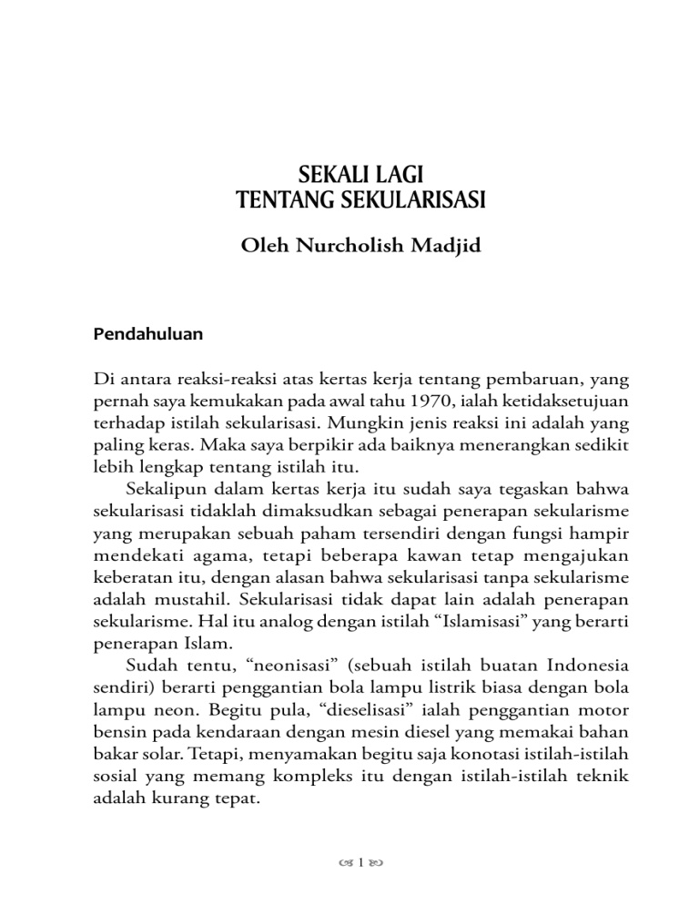 F SEKALI LAGI TENTANG SEKULARISASI G SEKALI LAGI TENTANG SEKULARISASI Oleh Nurcholish Madjid Pendahuluan Di antara reaksi-reaksi atas kertas kerja tentang pembaruan, yang pernah saya kemukakan pada awal tahu 1970, ialah ketidaksetujuan terhadap istilah sekularisasi. Mungkin jenis reaksi ini adalah yang paling keras. Maka saya berpikir ada baiknya menerangkan sedikit lebih lengkap tentang istilah itu. Sekalipun dalam kertas kerja itu sudah saya tegaskan bahwa sekularisasi tidaklah dimaksudkan sebagai penerapan sekularisme yang merupakan sebuah paham tersendiri dengan fungsi hampir mendekati agama, tetapi beberapa kawan tetap mengajukan keberatan itu, dengan alasan bahwa sekularisasi tanpa sekularisme adalah mustahil. Sekularisasi tidak dapat lain adalah penerapan sekularisme. Hal itu analog dengan istilah “Islamisasi” yang berarti penerapan Islam. Sudah tentu, “neonisasi” (sebuah istilah buatan Indonesia sendiri) berarti penggantian bola lampu listrik biasa dengan bola lampu neon. Begitu pula, “dieselisasi” ialah penggantian motor bensin pada kendaraan dengan mesin diesel yang memakai bahan bakar solar. Tetapi, menyamakan begitu saja konotasi istilah-istilah sosial yang memang kompleks itu dengan istilah-istilah teknik adalah kurang tepat. D1E F NURCHOLISH MADJID G Sebab, misalnya saja istilah “sosialisasi” dalam perkataan Inggris, socialized medicine (pengobatan yang disosialisasikan), sudah pasti bukanlah penerapan sosialisme. Di negara-negara kapitalis, justru sosialisasi pengobatan itu terjadi dengan pesat sekali, misalnya Inggris. Juga di Amerika, yang terkenal sebagai kampiun penentang sosialisme. Dalam pembendaharaan istilah-istilah agama (Islam), juga terdapat hal serupa. Umpamanya, “perang” yang diwajibkan atas kaum Muslimin sebagai tindakan defensif. Dalam satu ayat al-Qur’an yang mewajibkan perang, istilah yang dipakai ialah qitāl. Jadi, satu asal kata dengan perkataan qatl yang berarti pembunuhan. Apakah dalam hal ayat tersebut kita juga harus mengartikan qitāl sebagai pembunuhan, sehingga Tuhan mewajibkan kita saling-membunuh (arti harfiah perkataan qitāl)? Dalam perang, memang terjadi pembunuhan, tetapi inti perang bukanlah pembunuhan itu an sich, sehingga dapat diartikan bahwa berperang adalah melakukan kejahatan pembunuhan. Jadi, di sini terdapat apa yang disebut “kontradiksi interminus” (sesuai dengan hukum dialektika — lagi-lagi istilah asing — atau hukum kesatuan dari perbedaan): dalam perang yang diwajibkan itu, terdapat unsur pembunuhan yang diharamkan. Namun, perang tidak mungkin tanpa terjadinya pembunuhan (pada umumnya). Maka, “membunuh” dan “membunuh” itu juga mengenal tempat yang berbeda-beda, yang kemudian mengakibatkan perbedaan nilai padanya, malahan mungkin nilai itu berlawanan: yang satu haram dan yang lainnya wajib. Demikian pula dengan istilah sekularisasi. “Sekularisme” dan “sekularisasi”, dalam konteks yang berbeda atau berlawanan: dilarang dan disuruh. Yang dilarang sudah jelas, yaitu penerapan sekularisme dengan konsekuensi penghapusan kepercayaan kepada adanya Tuhan. Sedangkan yang diperintahkan, banyak sekali. Agama Islam pun, bila diteliti benar-benar, dimulai dengan proses sekularisasi lebih dahulu. Justru ajaran tauhid itu merupakan pangkal tolak proses sekularisasi secara besar-besaran. D2E F SEKALI LAGI TENTANG SEKULARISASI G Negasi dan Afirmasi Untuk memahami masalah ini, marilah kita perhatikan secara lebih cermat arti yang terkandung dalam kalimat syahadat yang pertama. Kalimat itu merupakan garis pemisah antara siapa mukmin dan siapa kafir. Dalam kalimat itu terkandung dua pengertian: peniadaan (negation) dan pengukuhan (affirmation). Perkataan “tidak ada Tuhan” adalah peniadaan, dan perkataan “melainkan Allah atau Tuhan itu sendiri” adalah pengukuhan. Cobalah perhatikan, betapa Islam, yang mengajarkan tauhid, itu justru memulai dengan ajaran yang meniadakan sama sekali (istilah Arabnya: nafy-un li al-jins) suatu tuhan atau ilāh. Memperhatikan hal ini adalah penting sekali. Dan dalam syahadat itu, kemudian dengan segera disusul dengan pengecualian, bahwa tidak semua tuhan itu tidak ada, kecuali satu, yaitu Tuhan itu sendiri, atau Allah (Allah adalah Ilāh yang telah memperoleh awalan al sebagai definite article). Jadi, negasi ketuhanan dalam kalimat syahadat adalah negasi yang terbatas, tidak mutlak. Sebab, memang tidak demikian yang dimaksudkan. Yang dimaksudkan ialah membebaskan manusia dari berbagai jenis kepercayaan kepada tuhan-tuhan yang selama ini dianut, kemudian mengukuhkan kepercayaan kepada Tuhan yang sebenarnya. Kalau kita hendak membahas masalah tersebut secara sedikit lebih luas, dapatlah digambarkan demikian: Agama (Islam) mengatakan bahwa manusia pertama (Adam dan Hawa) diajari tentang kepercayaan yang benar. Pasti, ajaran itu mula-mula adalah sederhana, sesuai dengan kemampuan pemahaman manusia. Kemudian disempurnakan secara bertahap, dengan diutusnya Rasul-rasul yang berdatangan sesudahnya. Rasulrasul itu, selain bertugas membawa ajaran tentang kepercayaan, atau agama yang lebih lengkap, juga meluruskan kembali umat manusia yang sudah mulai menyimpang dari ajaran sebelumnya. Sampai akhirnya tiba kerasulan Nabi Muhammad. Beliau merupakan utusan terakhir Tuhan, dengan tugas final dan universal. D3E F NURCHOLISH MADJID G Perspektif Sejarah Tetapi, guna mendapatkan gambaran lebih terang tentang proses itu, kita gunakan segi historis sebagai bahan pembahasan kita. Dan masih harus kita sempitkan lagi dengan mengambil tanah air kita sendiri sebagai misal. Menurut para ahli sejarah — sebagaimana diajarkan di sekolahsekolah — bangsa Indonesia mula-mula menganut kepercayaan Animisme atau Dinamisme. Kemudian datang agama Hindu dan Budha, yang relatif lebih sempurna daripada kepercayaan asli tersebut. Tetapi, agama Hindu dan Budha sangat mentolerir Animisme tersebut, bahkan menyerapnya menjadi bagian dari dirinya sendiri. Hal ini mengakibatkan sisa-sisa Animisme itu masih ta