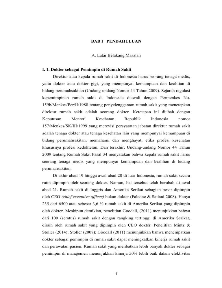 BAB I PENDAHULUAN A. Latar Belakang Masalah I. 1. Dokter sebagai Pemimpin di Rumah Sakit Direktur atau kepala rumah sakit di Indonesia harus seorang tenaga medis, yaitu dokter atau dokter gigi, yang mempunyai kemampuan dan keahlian di bidang perumahsakitan (Undang-undang Nomor 44 Tahun 2009). Sejarah regulasi kepemimpinan rumah sakit di Indonesia diawali dengan Permenkes No. 159b/Menkes/Per/II/1988 tentang penyelenggaraan rumah sakit yang menetapkan direktur rumah sakit adalah seorang dokter. Ketetapan ini diubah dengan Keputusan Menteri Kesehatan Republik Indonesia nomor 157/Menkes/SK/III/1999 yang merevisi persyaratan jabatan direktur rumah sakit adalah tenaga dokter atau tenaga kesehatan lain yang mempunyai kemampuan di bidang perumahsakitan, memahami dan menghayati etika profesi kesehatan khususnya profesi kedokteran. Dan terakhir, Undang-undang Nomor 44 Tahun 2009 tentang Rumah Sakit Pasal 34 menyatakan bahwa kepala rumah sakit harus seorang tenaga medis yang mempunyai kemampuan dan keahlian di bidang perumahsakitan. Di akhir abad 19 hingga awal abad 20 di luar Indonesia, rumah sakit secara rutin dipimpin oleh seorang dokter. Namun, hal tersebut telah berubah di awal abad 21. Rumah sakit di Inggris dan Amerika Serikat sebagian besar dipimpin oleh CEO (chief executive officer) bukan dokter (Falcone & Satiani 2008). Hanya 235 dari 6500 atau sebesar 3,6 % rumah sakit di Amerika Serikat yang dipimpin oleh dokter. Meskipun demikian, penelitian Goodall, (2011) menunjukkan bahwa dari 100 (seratus) rumah sakit dengan rangking tertinggi di Amerika Serikat, diraih oleh rumah sakit yang dipimpin oleh CEO dokter. Penelitian Mintz & Stoller (2014); Stoller (2008); Goodall (2011) menunjukkan bahwa menempatkan dokter sebagai pemimpin di rumah sakit dapat meningkatkan kinerja rumah sakit dan perawatan pasien. Rumah sakit yang melibatkan lebih banyak dokter sebagai pemimpin di manajemen menunjukkan kinerja 50% lebih baik dalam efektivitas 1 2 manajemen secara umum, manajemen kinerja dan kepemimpinan dibanding dengan rumah sakit yang melibatkan sedikit dokter (Falcone & Satiani, 2008). Hal ini menunjukkan bahwa posisi dokter sebagai pucuk pimpinan rumah sakit menjadi peluang positif bagi rumah sakit. I. 2. Permasalahan Kepemimpinan Dokter di Rumah Sakit Di Indonesia, penunjukan dan pengangkatan dokter menjadi pemimpin di rumah sakit dilakukan tanpa mempersiapkan dokter terlebih dahulu untuk menjadi pemimpin. Peraturan Menteri Kesehatan Republik Indonesia Nomor 971 Tahun 2009 tentang Standar Kompetensi Pejabat Struktural Kesehatan (Menteri Kesehatan, 2009) hanya mengatur kompetensi yang harus dimiliki pejabat setruktural, tetapi tidak disertai dengan langkah-langkah dan upaya memikat, merekrut, menyeleksi dan mempersiapkan seseorang menjadi pejabat yang siap memimpin. Ketidaksiapan dokter dalam memimpin rumah sakit berdampak pada kinerja rumah sakit secara keseluruhan. Banyak dokter yang baru saja dipromosikan menjadi pemimpin rumah sakit yang tidak memiliki bekal yang cukup, terutama pada masalah keuangan, manajemen perubahan, komunikasi, motivasi, team building, manajemen risiko dan ketrampilan kepemimpinan. Sebanyak 59% dokter yang direkrut menjadi pemimpin tidak dapat secara jelas mendeskripsikan peran, tanggung jawab dan tujuan kinerja untuk peran kepemimpinannya (Falcone & Satiani, 2008). Sangat disayangkan bahwa kinerja dokter pada posisi dan jabatan barunya hanyalah pas-pasan atau malah buruk. Banyak dokter yang memimpin rumah sakit di Indonesia harus menghadapi demonstrasi dari karyawan, demonstrasi warga sekitar rumah sakit, mendapat tuntutan hukum dari pasien, konflik dengan pemilik rumah sakit hingga menjadi tersangka kasus korupsi bahkan sejak masih di awal masa jabatannya (Batampos.co.id ; Sultrakini.com ; Radarmakassar.com; Mimbarriuanews.com; Kupang news, 2014). Kebutuhan, kompleksitas dan tanggung jawab kepemimpinan rumah sakit di era modern saat ini terlalu penting untuk diberikan pada pemimpin accidental yang tidak siap memimpin. 3 I. 3. Tantangan Kepemimpinan Dokter di Rumah Sakit Dewasa ini rumah sakit mendapat tantangan dan tekanan berat terkait cakupan universal, efisiensi biaya pelayanan dan mutu pelayanan kesehatan. Di samping itu, perubahan lingkungan, regulasi, pesatnya persaingan antar rumah sakit turut menjadi tantangan berat bagi rumah sakit (Mintz & Stoller, 2014). Kepemimpinan seorang Chief Executive Officer (CEO) jelas berbeda dengan kepemimpinan fungsional dokter. Beberapa ketrampilan esensial yang dibutuhkan untuk menjadi CEO antara lain adalah kepemimpinan, ketajaman insting bisnis, pengalaman, kemampuan untuk mengelola ke bawah dan ke atas serta kepekaan terhadap tujuan bisnis yang sangat berbeda dengan kualifikasi yang dimiliki dokter sebagai klinisi. Tabel 1 Perbedaan Peran CEO dengan Praktisi Dokter Pembeda Skala Ruang lingkup Tanggung jawab Peran Fokus Poin vokal Lokasi Horizon Otonomi Lingkungan Keputusan Dasar keputusan Konsekuensi kesalahan Gratifikasi Penutupan/Pengakhiran CEO Ratusan hingga ribuan unsur Perusahaan secara global Pada dewan komisaris dan institusi Cheerleader, bertanggung jawab pada ratusan hingga ribuan karyawan Difus/menyebar Kendala mutu dan biaya pelayanan Ruangan yang luas Jauh Servant leader Dinamis, dapat menyentuh seluruh lingkungan organisasi Konsensus Waktu berpikir, luar biasa krisis Ekonomis, tidak ada kesalahan langsung bahkan jika keputusan mempengaruhi pelayanan pasien Tertunda Rancu Dokter Satu pasien setiap waktu Satu workshop yang fokus Pada pasien Sangat terdefinisi, terbatas dalam sistem perannya Presisi, tepat Kebenaran dan kualitas layanan Ruangan pasien/ruang periksa Tahun ke tahun Captain of the ship Sangat terbatas pada hirarki Independen Informasi tidak lengkap, jarang krisis Kesalahan sangat merugikan pasien walau dilakukan tidak dengan sengaja Hampir selalu seketika Jelas Sumber: Falcon & Satiani (2008) Kualifikasi inti dari kepemimpinan dokter adalah kepekaan terhadap misi dan visi, ketrampilan komunikasi, integr
