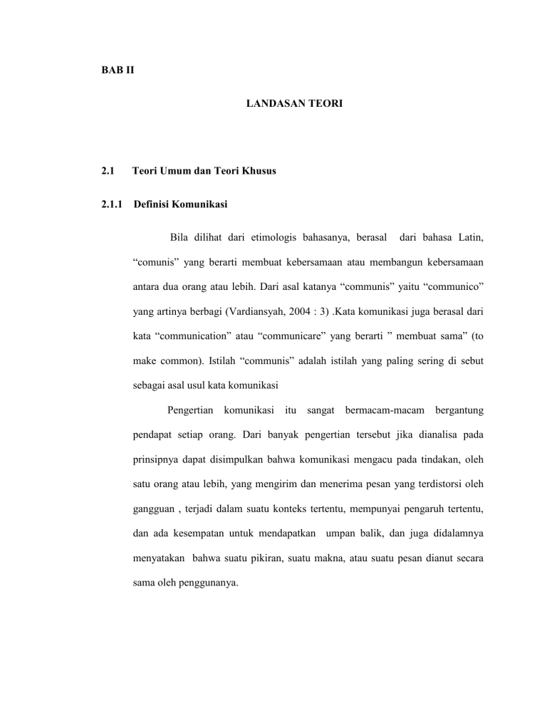 BAB II LANDASAN TEORI 2.1 Teori Umum dan Teori Khusus 2.1.1 Definisi Komunikasi Bila dilihat dari etimologis bahasanya, berasal dari bahasa Latin, “comunis” yang berarti membuat kebersamaan atau membangun kebersamaan antara dua orang atau lebih. Dari asal katanya “communis” yaitu “communico” yang artinya berbagi (Vardiansyah, 2004 : 3) .Kata komunikasi juga berasal dari kata “communication” atau “communicare” yang berarti ” membuat sama” (to make common). Istilah “communis” adalah istilah yang paling sering di sebut sebagai asal usul kata komunikasi Pengertian komunikasi itu sangat bermacam-macam bergantung pendapat setiap orang. Dari banyak pengertian tersebut jika dianalisa pada prinsipnya dapat disimpulkan bahwa komunikasi mengacu pada tindakan, oleh satu orang atau lebih, yang mengirim dan menerima pesan yang terdistorsi oleh gangguan , terjadi dalam suatu konteks tertentu, mempunyai pengaruh tertentu, dan ada kesempatan untuk mendapatkan umpan balik, dan juga didalamnya menyatakan bahwa suatu pikiran, suatu makna, atau suatu pesan dianut secara sama oleh penggunanya. 2.1.2 Unsur – unsur Komunikasi Dalam komunikasi juga terdapat unsur – unsur yang melengkapi komunikasi tersebut sehingga terciptalah komunikasi yang efektif. Komunikasi yang efektif merupakan komunikasi yang berhasil, artinya komunikan dapat mengerti isi pesan yang disampaikan oleh komunikator. Dan berikut ini adalah unsur – unsur dalam melakukan komunikasi : a. Pengirim Pesan Pengirim pesan (komunikator) adalah orang yang berinisiatif menyampaikan pesan untuk mewujudkan motif komunikasinya. Dilihat dari jumlahnya, komunikator dapat terdiri dari satu orang, lebih dari satu orang, serta massa. b. Penerima Pesan Penerima pesan (komunikan) adalah orang yang menerima pesan dari komunikator. Komunikan dapat terdiri dari satu orang, atau lebih, jumlah penerima pesan juga dipengaruhi dari lokasi dan latar belakang pendidikannya. c. Pesan Pesan disampaikan komunikator kepada komunikan untuk mewujudkan motif komunikasi: apa yang ia pikir dan rasakan. Karena itu, pesan dapat didefinisikan sebagai segala sesuatu, verbal maupun nonverbal, yang disampaikan komunikator kepada komunikan untuk mewujudkan motif komunikasinya. d. Saluran Komunikasi dan Media Komunikasi Saluran komunikasi adalah jalan yang dilalui pesan komunikator untuk sampai ke komunikannya. Terdapat dua jalan agar pesan komunikator sampai ke komunikannyam yaitu tanpa media (yang berlangsung faceto-face) atau dengan media komunikasi. e. Efek Komunikasi Efek komunikasi merupakan pengaruh yang ditimbulkan pesan komunikator dalam diri komunikannya. Terdapat tiga tataran pengaruh dalam diri komunikan, yaitu kognitif (seseorang menjadi tahu tentang sesuatu), afektif (sikap seseorang terbentuk, misalnya setuju atau tidak setuju terhadap sesuatu), dan konatif (tingkah laku nyata, yang membuat seseorang bertindak melakukan sesuatu). f. Umpan Balik Umpan balik dapat dimaknai sebagai jawaban komunikan atas pesan komunikator yang disampaikan kepadanya. Dalam komunikasi yang dinamis, komunikator dan komunikan terus-menerus saling bertukar peran. Karenanya, umpan balik pada dasarnya adalah pesan juga, yakni komunikan berperan sebagai komunikator kedua. (Dani Vardiansyah, M.Si.). 2.2 Komunikasi Massa 2.2.1 Pengertian Komunikasi Massa Menurut Wiryanto (2002). Komunikasi massa merupakan suatu tipe komunikasi manusia (human communication) yang lahir bersamaan dengan mulai digunakannya alat-alat mekanik yang mampu melipatgandakan pesanpesan komunikasi. Dalam sejarah publisistik dimulai satu setengah abad setelah ditemukan mesin cetak oleh Johannes Guttenberg. Sejak itu dimulai suatu zaman yang dikenal dengan zaman publisistik atau awal dari era komunikasi massa. Sebaliknya, zaman sebelumnya dikenal sebagai zaman prapublisistik. Kata massa dalam komunikasi massa dapat diartikan lebih dari sekedar “orang banyak”. Massa di sini bukan sekedar orang banyak di suatu lokasi yang sama. Massa kita artikan sebagai “meliputi semua orang yang menjadi sasaran alat-alat komunikasi massa atau orang-orang pada ujung lain dari saluran”. Massa mengandung pengertian orang banyak, tetapi mereka tidak harus berada di suatu lokasi tertentu yang sama. Mereka dapat tersebar atau terpencar di berbagai lokasi yang dalam waktu yang sama atau hampir bersamaan dapat memperoleh pesan-pesan komunikasi yang sama. Massa juga dapat kita lihat sebagai “meliputi semua lapisan masyarakat” atau “khalayak ramai” dalam berbagai tingkat umur, pendidikan, keyakinan, status sosial. Tentu saja yang terjangkau oleh saluran media massa. Pool mendefinisikan komunikasi massa sebagai komunikasi yang berlangsung dalam situasi ketika antara sumber dan penerima tidak terjadi kontak secara langsung, pesan-pesan komunikasi mengalir kepada penerima melalui saluransaluran media massa. Sementara definisi komunikasi massa menurut Deddy Mulyana (2003) yang memiliki kaitan erat dengan media menyatakan bahwa komunikasi massa (mass communication) adalah komunikasi yang menggunakan media massa, baik cetak (surat kabar, majalah, tabloid) atau elektronik (radio, televisi) yang dikelola oleh suatu lembaga atau orang yang dilembagakan yang ditujukan kepada sejumlah besar orang yang tersebar dibanyak tempat, anonim, dan heterogen. Pesan-pesannya bersifat umum, disampaikan secara cepat, serentak dan selintas (khususnya media elektronik). Komunikasi massa adalah sebuah proses yang terjadi dari serangkaian tahap sebagai berikut : 1. Formulasi pesan oleh komunikator 2. Penyebaran pesan dengan cara yang relative cepat dan terus menerus melalui media (media cetak dan elektronik) 3. Pesan mencapai khalayak dengan jumlah relatif besar dan beragam. Khalayak ini mengakses media dengan cara selektif 4. Individu dari anggota khalayak mencoba menafsirkan pesan yang dikirim komunikator sehingga memperoleh pengalaman yang sama sebagaimana yang dimaksud komunikator 5. Sebagai hasil memahami pesan, maka selanjutnya anggo