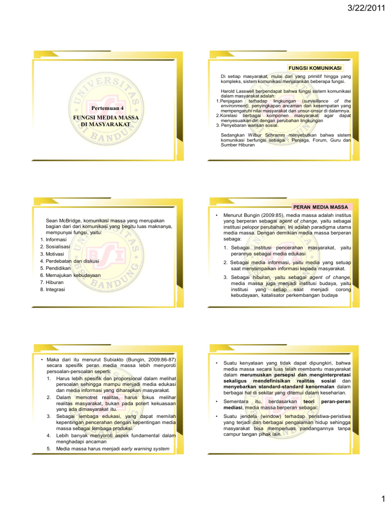 3/22/2011 FUNGSI KOMUNIKASI Di setiap masyarakat, mulai dari yang primitif hingga yang kompleks, sistem komunikasi menjalankan beberapa fungsi. Pertemuan 4 FUNGSI MEDIA MASSA DI MASYARAKAT Harold Lasswell berpendapat bahwa fungsi sistem komunikasi dalam masyarakat adalah: 1.Penjagaan terhadap lingkungan (surveillance of the environment), penyingkapan ancaman dan kesempatan yang mempengaruhi nilai masyarakat dan unsur-unsur di dalamnya. 2.Korelasi berbagai komponen masyarakat agar dapat menyesuaikan diri dengan perubahan lingkungan 3. Penyebaran warisan sosial. Sedangkan Wilbur Schramm menyebutkan bahwa sistem komunikasi berfungsi sebagai : Penjaga, Forum, Guru dan Sumber Hiburan PERAN MEDIA MASSA • Sean McBridge, komunikasi massa yang merupakan bagian dari dari komunikasi yang begitu luas maknanya, mempunyai fungsi, yaitu: 1. Informasi 2. Sosialisasi 3. Motivasi 4. Perdebatan dan diskusi 5. Pendidikan 6. Memajukan kebudayaan 7. Hiburan 8. Integrasi • Maka dari itu menurut Subiakto (Bungin, 2009:86-87) secara spesifik peran media massa lebih menyoroti persoalan-persoalan seperti: 1. Harus lebih spesifik dan proporsional dalam melihat persoalan sehingga mampu menjadi media edukasi dan media informasi yang diharapkan masyarakat. 2. Dalam memotret realitas, harus fokus melihar realitas masyarakat, bukan pada potert kekuasaan yang ada dimasyarakat itu. 3. Sebagai lembaga edukasi, yang dapat memilah kepentingan pencerahan dengan kepentingan media massa sebagai lembaga produksi. 4. Lebih banyak menyoroti aspek fundamental dalam menghadapi ancaman 5. Media massa harus menjadi early warning system Menurut Bungin (2009:85), media massa adalah institus yang berperan sebagai agent of change, yaitu sebagai institusi pelopor perubahan. Ini adalah paradigma utama media massa. Dengan demikian media massa berperan sebaga: 1. Sebagai institusi pencerahan masyarakat, yaitu perannya sebagai media edukasi 2. Sebagai media informasi, yaitu media yang setuap saat menyampaikan informasi kepada masyarakat. 3. Sebagai hiburan, yaitu sebagai agent of change, media massa juga menjadi institusi budaya, yaitu institusi yang setiap saat menjadi corong kebudayaan, katalisator perkembangan budaya • Suatu kenyataan yang tidak dapat dipungkiri, bahwa media massa secara luas telah membantu masyarakat dalam merumuskan persepsi dan menginterpretasi sekaligus mendefinisikan realitas sosial dan menyebarkan standard-standard kenormalan dalam berbagai hal di sekitar yang ditemui dalam keseharian. • Sementara itu, berdasarkan teori peran-peran mediasi, media massa berperan sebagai: • Suatu jendela (window) terhadap peristiwa-peristiwa yang terjadi dan berbagai pengalaman hidup sehingga masyarakat bisa memperluas pandangannya tanpa campur tangan pihak lain. 1 3/22/2011 • Suatu cermin atas peristiwa yang terjadi di masyarakat dan di dunia sehingga dapat memberikan refleksi yang dapat dipercaya. • Suatu saringan dan penjaga gerbang—gatekeeper yang memilihkan bagian-bagian dari pengalaman tertentu untuk mendapatkan perhatian lebih atau kurang. • Suatu guider atau interpreter yang memberi petunjuk dan arahan atas apa yang membingungkan masyarakat. • Suatu forum atau platform untuk menyampaikan ide-ide atau pikiran kepada masyarakat. • Suatu interlocutor yang tidak hanya memberikan informasi tetapi juga merespon pertanyaan-pertanyaan dari masyarakat. Penilaian tentang mutu atau kualitas siaran atau publikasi seringkali bersifat normatif, sehingga standarnya cenderung subyektif. Hal tersebut terjadi karena masing-masing orang / pihak mempunyai field of experience dan frame of reference yang berbeda untuk menilai apa yang dilihatnya. Oleh karena itu dibuat peraturan-peraturan hukum sebagai peraturan standar yang mengikat penayangan atau publikasi informasi kepada masyarakat. Mutu dan kualitas publikasi atau siaran seringkali dikaitkan dengan konsep akuntabilitas media Akuntabilitas melibatkan hubungan dengan pihak internal dan eksternal. Hubungan dengan pihak internal media, yaitu: editor, wartawan, dsb, melibatkan kontrol yang ketat. Media cenderung ingin melindungi dirinya dari klaim pihak eksternal sehingga cenderung menekan dan membatasi pemberitaan agar terus berada pada batas aman. Hal ini berpengaruh pada tingkat otonomi dan kebebasan ekspresi pada pekerja media. Contoh kasus yang menarik yaitu pada program “Empat Mata”. Tayangan ini mengundang kontroversi karena masyarakat merasa program ini melanggar norma-norma susila. Sedangkan pekerja media merasa ini adalah bentuk kreatifitas seni. Untuk amannya, media merubah judul program tersebut dan membuat konsep baru dengan image baru pula. MUTU DAN KUALITAS PROGRAM Sedemikian penting fungsi dan peranan media massa bagi masyarakat sehingga mutu atau kualitas informasi dan program yang ditayangkan di media sangat penting untuk diperhatikan. Berkenaan dengan peran media dalam menyebarkan dan mempublikasikan informasi, media sudah seharusnya bersifat bebas dari berbagai kepentingan ekonomi, politik dan kebudayaan. Selain itu, media juga harus seharusnya memperhatikan tata aturan hukum maupun norma agama, sosial dan budaya demi mengantisipasi efek-efek negatif yang bisa muncul di masyarakat atau pemirsa. AKUNTABILITAS Akuntabilitas yaitu: suatu proses pengkajian terhadap aktifitas media, baik tentang kualitas maupun efek yang ditimbulkan dari publikasi, yang dinilai dengan menggunakan harapan-harapan yang muncul dari masyarakat (apa ayang dinilai baik secara umum). Proses akuntabilitas media harus memenuhi tiga kriteria umum, yaitu: • Proses tersebut harus menghargai kebebasan publikasi. • Proses tersebut harus menjaga atau membatasi bahaya yang muncul dari publikasi pada individu atau pada masyarakat. • Proses tersebut sebaiknya memunculkan aspek positif dari publikasi daripada membatasi publikasi. Sedangkan hubungan pihak eksternal, akuntabilitas berkenaan dengan: • Institusi sosial yang dipengaruhi media dan institusi yang operasionalnya tergantung pada