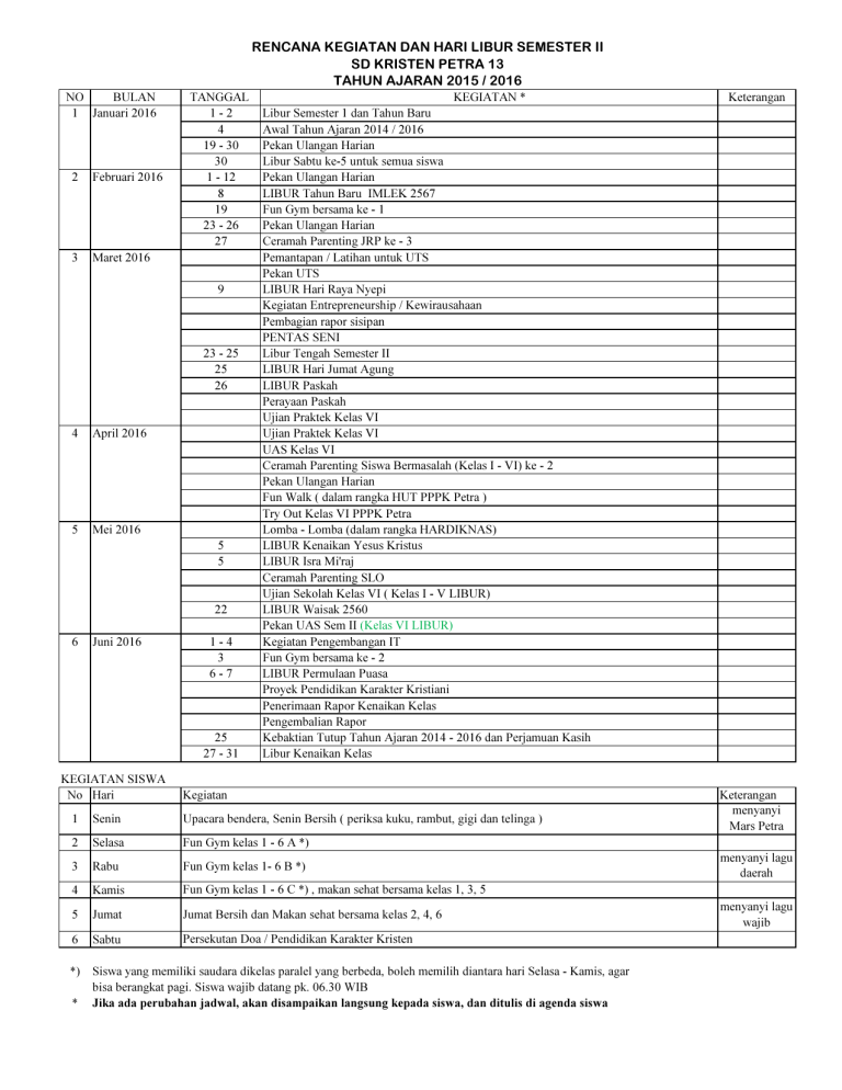 RENCANA KEGIATAN DAN HARI LIBUR SEMESTER II SD KRISTEN PETRA 13 TAHUN AJARAN 2015 / 2016 NO BULAN 1 Januari 2016 2 Februari 2016 3 Maret 2016 TANGGAL 1-2 4 19 - 30 30 1 - 12 8 19 23 - 26 27 9 23 - 25 25 26 4 April 2016 5 Mei 2016 5 5 22 6 Juni 2016 1-4 3 6-7 25 27 - 31 KEGIATAN SISWA No Hari KEGIATAN * Libur Semester 1 dan Tahun Baru Awal Tahun Ajaran 2014 / 2016 Pekan Ulangan Harian Libur Sabtu ke-5 untuk semua siswa Pekan Ulangan Harian LIBUR Tahun Baru IMLEK 2567 Fun Gym bersama ke - 1 Pekan Ulangan Harian Ceramah Parenting JRP ke - 3 Pemantapan / Latihan untuk UTS Pekan UTS LIBUR Hari Raya Nyepi Kegiatan Entrepreneurship / Kewirausahaan Pembagian rapor sisipan PENTAS SENI Libur Tengah Semester II LIBUR Hari Jumat Agung LIBUR Paskah Perayaan Paskah Ujian Praktek Kelas VI Ujian Praktek Kelas VI UAS Kelas VI Ceramah Parenting Siswa Bermasalah (Kelas I - VI) ke - 2 Pekan Ulangan Harian Fun Walk ( dalam rangka HUT PPPK Petra ) Try Out Kelas VI PPPK Petra Lomba - Lomba (dalam rangka HARDIKNAS) LIBUR Kenaikan Yesus Kristus LIBUR Isra Mi'raj Ceramah Parenting SLO Ujian Sekolah Kelas VI ( Kelas I - V LIBUR) LIBUR Waisak 2560 Pekan UAS Sem II (Kelas VI LIBUR) Kegiatan Pengembangan IT Fun Gym bersama ke - 2 LIBUR Permulaan Puasa Proyek Pendidikan Karakter Kristiani Penerimaan Rapor Kenaikan Kelas Pengembalian Rapor Kebaktian Tutup Tahun Ajaran 2014 - 2016 dan Perjamuan Kasih Libur Kenaikan Kelas Kegiatan 1 Senin Upacara bendera, Senin Bersih ( periksa kuku, rambut, gigi dan telinga ) 2 Selasa Fun Gym kelas 1 - 6 A *) 3 Rabu Fun Gym kelas 1- 6 B *) 4 Kamis Fun Gym kelas 1 - 6 C *) , makan sehat bersama kelas 1, 3, 5 5 Jumat Jumat Bersih dan Makan sehat bersama kelas 2, 4, 6 6 Sabtu Persekutan Doa / Pendidikan Karakter Kristen *) Siswa yang memiliki saudara dikelas paralel yang berbeda, boleh memilih diantara hari Selasa - Kamis, agar bisa berangkat pagi. Siswa wajib datang pk. 06.30 WIB * Jika ada perubahan jadwal, akan disampaikan langsung kepada siswa, dan ditulis di agenda siswa Keterangan Keterangan menyanyi Mars Petra menyanyi lagu daerah menyanyi lagu wajib