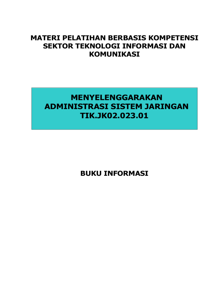 MATERI PELATIHAN BERBASIS KOMPETENSI SEKTOR TEKNOLOGI INFORMASI DAN KOMUNIKASI MENYELENGGARAKAN ADMINISTRASI SISTEM JARINGAN TIK.JK02.023.01 BUKU INFORMASI MATERI UNIT KOMPETENSI MENYELENGGARAKAN ADMINISTRASI SISTEM JARINGAN 1.1 Uraian Singkat Materi : Menyelenggarakan administrasi sistem jaringan Jaringan komputer adalah sebuah sistem yang terdiri atas komputer dan perangkat jaringan lainnya yang bekerja bersama-sama untuk mencapai suatu tujuan yang sama. Tujuan dari jaringan komputer adalah: Membagi sumber daya: contohnya berbagi pemakaian printer, CPU, memori, harddisk Komunikasi: contohnya surat elektronik, instant messaging, chatting Akses informasi: contohnya web browsing Agar dapat mencapai tujuan yang sama, setiap bagian dari jaringan komputer meminta dan memberikan layanan (service). Pihak yang meminta layanan disebut klien (client) dan yang memberikan layanan disebut pelayan (server). Arsitektur ini disebut dengan sistem client-server, dan digunakan pada hampir seluruh aplikasi jaringan komputer. Klasifikasi Berdasarkan skala : Local Area Network (LAN) Metropolitant Area Network (MAN) Wide Area Network (WAN) Berdasarkan fungsi : Pada dasarnya setiap jaringan komputer ada yang berfungsi sebagai client dan juga server. Tetapi ada jaringan yang memiliki komputer yang khusus didedikasikan sebagai server sedangkan yang lain sebagai client. Ada juga yang tidak memiliki komputer yang khusus berfungsi sebagai server saja. Karena itu berdasarkan fungsinya maka ada dua jenis jaringan komputer: Client-server Yaitu jaringan komputer dengan komputer yang didedikasikan khusus sebagai server. Sebuah service/layanan bisa diberikan oleh sebuah komputer atau lebih. Contohnya adalah sebuah domain seperti www.detik.com yang dilayani oleh banyak komputer web server. Atau bisa juga banyak service/layanan yang diberikan oleh satu komputer. Contohnya adalah server jtk.polban.ac.id yang merupakan satu komputer dengan multi service yaitu mail server, web server, file server, database server dan lainnya. Peer-to-peer Yaitu jaringan komputer dimana setiap host dapat menjadi server dan juga menjadi client secara bersamaan. Contohnya dalam file sharing antar komputer di Jaringan Windows Network Neighbourhood ada 5 komputer (kita beri nama A,B,C,D dan E) yang memberi hak akses terhadap file yang dimilikinya. Pada satu saat A mengakses file share dari B bernama data_nilai.xls dan juga memberi akses file soal_uas.doc kepada C. Saat A mengakses file dari B maka A berfungsi sebagai client dan saat A memberi akses file kepada C maka A berfungsi sebagai server. Kedua fungsi itu dilakukan oleh A secara bersamaan maka jaringan seperti ini dinamakan peer to peer. Berdasarkan topologi jaringan : Berdasarkan (topologi jaringan), jaringan komputer dapat dibedakan atas: Topologi bus Topologi bintang Topologi cincin 1.2 Beberapa Pengertian dalam Unit Kompetensi Ini : Beberapa pengertian yang dipergunakan di dalam unit kompetensi ini, yaitu : a. Password, adalah suatu bentuk data autentik rahasia yang digunakan oleh user ketika akan menjalankan suatu program atau situs yang tidak ingin atau tidak dapat dirubah atau dilihat semua orang/orang lain (bersifat rahasia). b. kriptografi, adalah ilmu untuk menjaga kerahasiaan berita/informasi. c. topologi adalah hal yang menjelaskan hubungan geometris antara unsur-unsur dasar penyusun jaringan, yaitu node, link, dan station. d. Access Control Lists (ACLs), adalah daftar dari kendali akses yang menunjukkan hak akses dan informasi untuk audit yang digunakan oleh sistem, misalnya oleh Windows NT atau oleh proxy server. Didalam Windows NT, ACLs ini akan digunakan bersama-sama dengan sistem akses file sytem NTFS (New Technology File System). Windows NT menggunakan daftar ini untuk melihat siapa saja yang telah diberikan hak untuk mengakses sumber daya tertentu (file atau folder) dan hak apa yang telah diberikan kepadanya, seperti membaca, menulis dan mengeksekusi. Didalam sistem file UNIX, hak akses ini dapat dilihat dari bit-bit kode akses yang meliputi akses untuk user, akses untuk group user serta akses untuk global user. Akses untuk user berlaku untuk user yang besangkutan, akses untuk group user berlaku untuk user-user lain yang masih berada dalam satu group dengan user yang bersangkutan sedangan akses global user berlaku untuk user yang tidak berada dalam satu group dengan user yang bersangkutan. Setiap file dalam file sistem UNIX memiliki bit-bit pengendali tersebut. e. Challenge/Response, adalah Proses otentifikasi melibatkan prosedur challenge/response yang terjadi pada saat dimulainya sebuah otentifikasi. Ketika seorang pemakai ingin meminta hak akses kepada sistem maka sistem akan mengirimkan challenge kepada pemakai kemudian pemakai mengirimkan kode yang sesuai. Sistem akan membandingkan kode yang dikirimkan oleh pemakai dengan kode yang ada didalam database. Jika ada kecocokan maka sistem akan memberikan hak akses sesuai dengan hak yang dimiliki oleh pengguna yang bersangkutan. Contohnya, pada saat seorang administrator Web ingin mengakses IIS (Internet Information Service) di Windows NT maka proses challenge/response terjadi agar sistem dapat memberikan hak akses yang sesuai. Contoh lain dalam sistem UNIX yang menggunakan one-time password, seorang pemakai yang ingin melakukan koneksi terminal (telnet) ke dalam sistem harus memasukkan password sebelum sistem memberikan hak akses terhadap terminal. Proses challenge/response yang terjadi disini yaitu pemakai menghubungi server melalui port telnet (21), kemudian server membentuk hash serta challenge key. Pemakai kemudian membalas challenge key tersebut dengan onetime-password yang sesuai. Selanjutnya response/jawaban dari pemakai akan dibandingkan dengan database yang ada didalam sistem, sebelum diputuskan untuk memberikan akses atau tidak. f. NTLM, adalah NTLM adalah teknik otentifikasi Challenge/Response yang digunakan oleh Window NT. NTLM singkatan dari Windows NT LAN Manager, sebab teknik ini dikembangkan pertama kali da