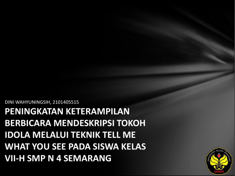 DINI WAHYUNINGSIH, 2101405515 PENINGKATAN KETERAMPILAN BERBICARA MENDESKRIPSI TOKOH IDOLA MELALUI TEKNIK TELL ME WHAT YOU SEE PADA SISWA KELAS VII-H SMP N 4 SEMARANG Identitas Mahasiswa - NAMA : DINI WAHYUNINGSIH - NIM : 2101405515 - PRODI : Pendidikan Bahasa, Sastra Indonesia, dan Daerah (Pendidikan Bahasa dan Sastra Indonesia) - JURUSAN : Bahasa & Sastra Indonesia - FAKULTAS : Bahasa dan Seni - EMAIL : ce_endute pada domain yahoo.co.id - PEMBIMBING 1 : Dr. Subyantoro,M.Hum. - PEMBIMBING 2 : Drs.Hari Bakti M,M.Hum. - TGL UJIAN : 2009-10-02 Judul PENINGKATAN KETERAMPILAN BERBICARA MENDESKRIPSI TOKOH IDOLA MELALUI TEKNIK TELL ME WHAT YOU SEE PADA SISWA KELAS VII-H SMP N 4 SEMARANG Abstrak Berbicara adalah keterampilan menyampaikan pesan melalui bahasa lisan. Dengan berbicaralah pertama-tama dipenuhi kebutuhan berkomunikasi dengan lingkungan sekitar. Berdasarkan observasi awal dan wawancara dengan guru bidang studi Bahasa dan Sastra Indonesia, keterampilan berbicara mendeskripsi tokoh idola siswa kelas VII-H SMP Negeri 4 Semarang masih kurang. Rendahnya kemampuan siswa dalam berbicara disebabkan faktor internal yang berasal dari siswa, dan faktor eksternal yang berasal dari teknik yang digunakan guru dalam mengajar. Pemilihan teknik tell me what you see sebagai upaya untuk meningkatkan keterampilan berbicara mendeskripsi tokoh idola didasarkan pada tuntutan kurikulum tingkat satuan pendidikan yang memberikan kebebasan pada guru untuk memilih pendekatan dan teknik yang akan digunakan pada pembelajaran. Berdasarkan penjelasan di atas, permasalahan yang dikaji dalam penelitian ini adalah bagaimanakah peningkatan keterampilan berbicara mendeskripsi tokoh idola dan perubahan perilaku siswa kelas VII-H SMP Negeri 4 Semarang setelah mengikuti proses pembelajaran melalui teknik tell me what you see. Tujuan dari penelitian ini adalah untuk mengetahui peningkatan keterampilan berbicara mendeskripsi tokoh idola dan perubahan perilaku siswa kelas VII-H SMP Negeri 4 Semarang setelah mengikuti proses pembelajaran melalui teknik tell me what Kata Kunci berbicara, mendeskripsi tokoh idola, dan teknik tell me what you see. Referensi Afniyanti, Yuni. 2006. Peningkatan Pembelajaran Menceritakan Tokoh Idola melalui Pendekatan Kontekstual dengan Media Gambar pada Siswa Kelas VII-C SMP N 23 Semarang Tahun Ajaran 2005/2006. Skripsi. Universitas Negeri Semarang. Akhadiah, Sabarti, dkk. 1997. Menulis I. Jakarta: Depdikbud. Alfiah. 2006. Pengembangan Proses Pembelajaran Kompetensi Menceritakan Pengalaman Pribadi Siswa Kelas VII-B SMP Negeri 5 Semarang Menggunakan Media Foto. Skripsi. Universitas Negeri Semarang. Wibowo, Ari. 2008. Teknik Bercerita. http://omahku.com/?l=en&id=13 - 30k. (diunduh: 5April 2008) Arief, Zaenal. 2005. Peningkatan Keterampilan Berbicara Siswa Kelas X-4 SMA Negeri 1 Jepara melalui Diskusi dengan Pendekatan Kontekstual Fokus Pemodelan. Skripsi. Universitas Negeri Semarang. Arsjad, Maidar G dan Mukti US. 1988. Pembinaan Kemampuan Berbicara Bahasa Indonesia. Jakarta: Departemen Pendidikan Nasional. Depdiknas. 2003. Kurikulum 2006 Standar Kompetensi Mata Pelajaran Bahasa dan Sastra Indonesia SMP. Jakarta: Departemen Pendidikan Nasional. Depdiknas. 2001. Kamus Besar Bahasa Indonesia. Jakarta: Balai Pustaka. Ekayani, Eni. 2006. Peningkatan Kemampuan Mendeskripsikan secara Lisan Terima Kasih http://unnes.ac.id