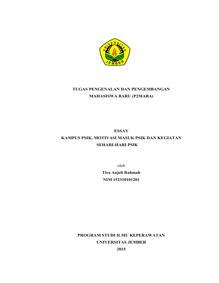 TUGAS PENGENALAN DAN PENGEMBANGAN MAHASISWA BARU (P2MABA) ESSAY KAMPUS PSIK, MOTIVASI MASUK PSIK DAN KEGIATAN SEHARI-HARI PSIK oleh Tira Anjeli Rahmah NIM 152310101201 PROGRAM STUDI ILMU KEPERAWATAN UNIVERSITAS JEMBER 2015 Deskripsi Kampus Program Studi Ilmu Keperawatan Universitas Jember Awal perencanaan Program studi ilmu keperawatan atau PSIK diadakan sebuah pertemuan. pada pertemuan tersebut rektor mengutarakan niatnya bahwa Universitas Jember berkeinginan untuk membuka PSIK. Hal ini didasarkan atas masih terbatasnya tenaga keperawatan di rumah sakit baik di Jember maupun secara nasional yang berpendidikan pada level sarjana keperawatan (S-1). Rencana pembukaaan Program Studi Ilmu Keperawatan di Universitas Jember, sejatinya sudah mulai dirintis sejak akhir Desember 2001. Pada waktu itu Rektor Universitas Jember mengundang tenaga keperawatan dari Akademi Kebidanan Jember, PPNI Kabupaten Jember, Akademi Keperawatan UNMUH Jember, RSUD dr. Soebandi Jember, Akademi Keperawatan Lumajang dan Akademi Keperawatan Universitas Jember. Blambangan Banyuwangi, serta ketua PSPD Pada tanggal 19 Juli melalui SK Dirjen Dikti No. 2580/D/T/2005 tentang ijin penyelenggaraan Program Studi Ilmu Keperawatan (S1) pada Universitas Jember, secara resmi PSIK Universitas Jember menjadi program studi baru dilingkungan Universitas Jember. Sedangkan tahukah kalian, kampus yang mempunyai dua gedung yang mana satu berwarna biru dan yang satu berwarna cream? Dimana letak kampus tersebut diantara fakultas kedokteran, fakultas kedokteran gigi dan dibelakang fakultas farmasi. Ya, pasti semua orang tahu kampus apa yang saya maksud. Kampus yang dimaksud adalah kampus Program Studi Ilmu Keperawatan. Kampus dimana mempunyai halaman yang luas dengan berbagai macam tananaman yang sederhana, terdiri dari dari beberapa pohon yang tertanam dalam tanah. Halaman yang bersih, rapi dan nyaman untuk ditempati. Selain itu di program studi ilmu keperawatan terdapat sebuah kantin. Dimana kantin tersebut menyediakan berbagai makanan, minuman untuk mahasiswa Program Studi Ilmu Keperawatan. Dimana kampus berwarna biru digunakan untuk proses belajar mengajar dan melaksakan kegiatan di laboratorium yang terdiri dari tiga lantai. Dimana dilantai satu terdiri dari beberapa laboratorium. Dimana dilantai satu juga terdapat sebuah musholah kecil dengan dua kamar mandi. Dilantai dua juga seperti itu ada berbagai ruangan dari laboratorium dan ruang dosen. Selain ruang ruang itu terdapat sebuah musholah dan kamar mandi. Dilantai tiga terdapat banyak ruang dosen program studi ilmu keperawatan universitas jember. Sedangkan di gedung yang berwarna cream yang mempunyai tiga lantai dimana lantai satu adalah tempat ruang akademik, ruang para petinggi atau pengurus atau biasa disebut sebagai TU. Di lantai pertama terdapat ruang akademik, mushola kecil, kamar mandi, dan ruang sekretariat. Selain itu dilantai dua terdapat ruang baca, dimana ruang baca ini mempunyai beberapa koleksi buku-buku yang dapat digunakan oleh mahasiswa-mahasiswi dalam proses belajar dan kamar mandi. Dilantai tiga terdapat empat ruang kuliah, ruang siding dan sebuah kamar mandi yang besar. Kampus PSIK ini merupakan kampus dengan akreditasi B dengan mahasiswa baru sebanyak 358 mahasiswa-i. Hal ini merupakan suatu prestasi yang dibanggakan oleh pihak PSIK karena adanya kemajuan dalam tingkat mutu pendidikan. Selain itu, kampus PSIK ini juga telah berperan penting terhadap masyarakat, karena basic jurusan dibidang kesehatan juga. Berbagai prestasi juga telah diraih oleh mahasiswa-i program studi ilmu keperawatan. Selain itu, warga atau mahasiswa-i program studi ilmu keperawatan sangat pintar-pintar, kritis, baik, murah senyum, penyabar, disiplin, dan tegas karena kita semua dididik menjadi seorang yang mempunyai jiwa seperti itu supaya jika lulus mereka siap terjun kemasyarakat. Motivasi masuk Program Studi Ilmu Keperawatan Universitas Jember Untuk masuk program studi ilmu keperawatan Universitas Jember tentu tidaklah mudah. Dari proses seleksi yang begitu ketat dengan saingan beberapa ribu orang yang yang mendaftar dari berbagai kalangan atau wilayah. Dengan proses SNMPT, SBMPTN, SBMPTR, dan ahli jenis. Alhamdulillah ketika pendaftaran SNMPT penuh kebimbangan dalam menemukan jurusan apa yang akan ditempuh selesai SMA nanti. Banyak pertimbangan pula yang terjadi. Ketika pengisian data, pengisian jurusan juga sempat terjadi dilema besar tentang jurusan. Beberapa hari berpikir untuk mencari jurusan apa yang akan ditempuh. Sebelum itu, saya juga mempertimbangkan mau dibawa kemana saya, apa keinginan kedua orang tua saya, keinginan keluarga besar saya juga. Saya tertarik dan berminat serta mempunyai niat menjadi seorang perawat dan berkuliah di Program Studi Ilmu Keperawatan Universitas Jember karena beberapa alasan. Alasan pertama saya bermimpi setelah saya lulus kuliah saya bisa bekerja memakai baju putih tapi waktu itu masih keadaan bingung dan hal itu yang mendorong saya untuk bertanya kepada guru konseling saya yang mana beliau menyarankan untuk mengambil kesehatan ataupun kimia murni. Alasan kedua dari kedua orang tua yang mana ingin sekali mempunyai anak yang basicnya bekerja di bidang kesehatan yang mana bisa bekerja dirumah sakit, mengabdi kepada masyarakat, dan bisa merawat bapak ibu, itulah yang mendorong diri saya bertekad mengambil jurusan ini. Alasan terbesar saya mengambil jurusan ini adalah ketika merawat nenek saya sakit. Dari kecil sampai usia 17tahun selalu bersama. Ketika saya kelas 2 SMA nenek saya mendapat musibah yakni terjatuh dan terkena diabetes militus kering. Beberapa bulan kemudian beliau dirawat dirumah sakit, tentunya saya juga ikut menemani beliau dirumah sakit karena beberapa alasan dimana salah satunya yang menjaga tidak ada (semua kerja), beliau tidak mau jika tanpa saya maklum dari kecil sampai besar beliau selalu bersama saya. Waktu melihat orang sakit terutama melihat orang yang kita cintai dan sayangi sakit rasa hati itu teriris sekali. Ketika dirumah s