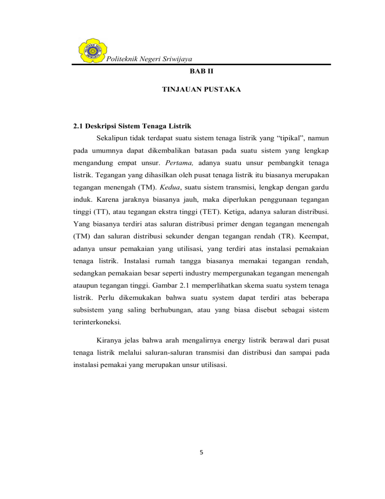 Politeknik Negeri Sriwijaya BAB II TINJAUAN PUSTAKA 2.1 Deskripsi Sistem Tenaga Listrik Sekalipun tidak terdapat suatu sistem tenaga listrik yang “tipikal”, namun pada umumnya dapat dikembalikan batasan pada suatu sistem yang lengkap mengandung empat unsur. Pertama, adanya suatu unsur pembangkit tenaga listrik. Tegangan yang dihasilkan oleh pusat tenaga listrik itu biasanya merupakan tegangan menengah (TM). Kedua, suatu sistem transmisi, lengkap dengan gardu induk. Karena jaraknya biasanya jauh, maka diperlukan penggunaan tegangan tinggi (TT), atau tegangan ekstra tinggi (TET). Ketiga, adanya saluran distribusi. Yang biasanya terdiri atas saluran distribusi primer dengan tegangan menengah (TM) dan saluran distribusi sekunder dengan tegangan rendah (TR). Keempat, adanya unsur pemakaian yang utilisasi, yang terdiri atas instalasi pemakaian tenaga listrik. Instalasi rumah tangga biasanya memakai tegangan rendah, sedangkan pemakaian besar seperti industry mempergunakan tegangan menengah ataupun tegangan tinggi. Gambar 2.1 memperlihatkan skema suatu system tenaga listrik. Perlu dikemukakan bahwa suatu system dapat terdiri atas beberapa subsistem yang saling berhubungan, atau yang biasa disebut sebagai sistem terinterkoneksi. Kiranya jelas bahwa arah mengalirnya energy listrik berawal dari pusat tenaga listrik melalui saluran-saluran transmisi dan distribusi dan sampai pada instalasi pemakai yang merupakan unsur utilisasi. 5 6 Politeknik Negeri Sriwijaya Gambar 2.1 Sistem Tenaga Listrik 7 Politeknik Negeri Sriwijaya Catatan: PTL = Pembangkit Tenaga Listrik GI = Gardu Induk TT = Tegangan Tinggi TET = Tegangan Ekstra Tinggi TM = Tegangan Menengah GD = Gardu Distribusi TR = Tegangan Rendah (Abdul kadir 2006 hal.3 dan5) 2.2 Definisi Saluran Distribusi Jaringan distribusi tenaga listrik merupakan semua bagian dari sistem tenaga listrik yang menghubungkan sumber daya besar (big power source) dengan rangkaian pelayanan pada konsumen. Sumber daya besar tersebut dapat berupa : a. Pusat pembangkit tenaga listrik yang langsung berhubungan dengan jaringan distribusi. b. Gardu induk, yaitu gardu yang di supply dari pusat pembangkit tenaga listrik melalui jaringan – jaringan transmisi dan sub transmisi. Salah satu fungsi dari gardu induk adalah untuk mensupply tenaga listrik ke gardu distribusi melalui jaringan distribusi. c. Gardu distribusi, yaitu gardu yang di supply dari gardu induk melalui jaringan distribusi. Salah satu fungsi dari gardu distribusi adalah sebagai sarana supply tenaga listrik kekonsumen yang lataknya jauh dari gardu induk maupun pusat pembangkit tenaga listrik. Adapun fungsi utama dari sistem distribusi adalah menyalurkan tenaga listrik dari sumber daya (pembangkit) ke pemakai atau konsumen, baik buruk suatu jaringan distribusi dapat dinilai dari bermacam-macam factor, antara lain mengenai hal-hal sebagai berikut : a. Regulasi tegangan b. Kontinuitas pelayanan 8 Politeknik Negeri Sriwijaya c. Efisiensi d. Fleksibilitas e. Harga system Dari 5 faktor diatas, masalah-masalah yang dihadapi dalam suatu system jaringan distribusi adalah bagaimana menyalurkan tenaga listrik ke konsumen dengan cara sebaik-baiknya untuk saat tertentu dan juga untuk masa yang akan datang. System distribusi tenaga listri harus memenuhi beberapa syarat sebagai berikut : a. Gangguan terhadap pelayanan pada suatu daerah tidak boleh terlalu lama. b. Gangguan terhadap pelayanan (interruption) tidak boleh terlalu sering. c. Harus fleksibel (mudah menyesuaikan diri dengan keadaan yang terjadi, seperti perubahan-perubahan pada sistem perubahan beban yang tidak menelan biaya yang tinggi). d. Regulasi tegangan tidak terlampau besar . e. Biaya sistem operasional harus serendah mungkin. Bagian – bagian dari system jaringan distribusi tenaga listrik secara garis besar. Untuk jaringan distribusi pada umumnya terdiri dari dua bagian besar, yaitu sebagai berikut : a. Jaringan Distribusi Primer Jaringan distribusi primer yaitu jaringan tenaga listrik yang menyalurkan daya listrik dari gardu induk sub transmisi ke gardu distribusi. Jaringan ini merupakan jaringan tegangan menengah atau jaringan tegangan primer. Biasanya jaringan ini menggunakan 6 jenis jaringan yaitu sistem radial dan sistem lup (loop), sistem ring, sistem network, sistem spindel dan system cluster. (Abdul Kadir, 2006, Hal 21) b. Jaringan Distribusi Sekunder Jaringan distribusi sekunder mempergunakan tegangan rendah. 9 Politeknik Negeri Sriwijaya Sebagaimana halnya dengan distribusi primer, terdapat pula pertimbangan-pertimbangan prihal keadaan pelayanan dan rugulasi tegangan, distribusi sekunder Yaitu jaringan tenaga listrik yang menyalurkan daya listrik dari gardu distribusi ke konsumen. Jaringan ini sering disebut jaringan tegangan rendah. (Abdul Kadir, 2006, Hal 27) 2.3 Bentuk-bentuk Konfigurasi Distribusi Bentuk jaringan distribusi primer mempunyai konfigurasi bermacammacam di antaranya adalah : 1. Konfigurasi Primer Radial 2. Konfigurasi Primer Loop 3. Konfigurasi Primer Grid/Network 4. Konfigurasi Primer Spindle 5. Konfigurasi Primer Cluster Jaringan Distribusi Primer adalah bagian dari sistem distribusi yang menghubungakan gardu induk ke beberapa gardu hubung dan gardu distribusi pada suatu tegangan primer. 2.3.1 Konfigurasi primer radial Jaringan primer bentuk radial ini merupakan bentuk jaringan yang paling banyak dan umum dipakai terutama digunakan pada daerah tingkat kerapatan bebannya rendah. Jaringan ini mempunyai satu jalur daya ke beban sehingga bila saluran tersebut mendapat gangguan maka semua beban pada saluran itu akan kehilangan daya. Salah satu kelemahan sistem ini adalah kotinuitas pelayanannya kurang baik dan keandalannya rendah serta jatuh tegangan terjadi besar terutama untuk beban yang terdapat pada ujung saluran, kerapatan arus yang besar pada jaringan tipe radial ini terdapat pada saluran antara sumber daya dan gardu distribusi terdekat 10 Politeknik Negeri Sriwijaya dan arus semakin kecil untuk gardu distribusi berikutnya dan 