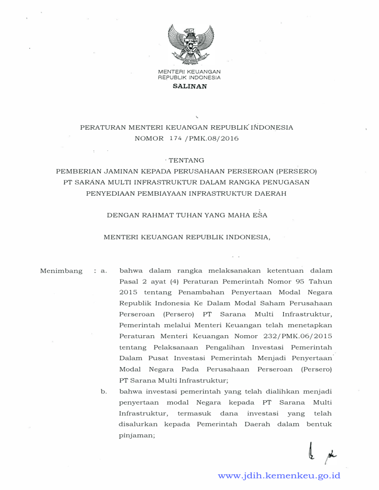MENTER!KEUANGAN REPUBUK INDONESIA SALINAN PERATURAN MENTER! KEUANGAN REPUBLIK INDONESIA NOMO R 174 /PMK.08/2016 ·TENTANG PEMBERIAN JAMINAN KEPADA PERUSAHAAN PERSEROAN (PERSERO) PT SAR.ANA MULTI INFRASTRUKTUR DALAM RANGKA PENUGASAN PENYEDIAAN PEMBIAYAAN INFRASTRUKTUR DAE RAH DENGAN RAHMAT TUHAN YANG MAHA ESA MENTER! KEUANGAN REPUBLIK INDONESIA, Menimbang a. bahwa dalam rangka melaksanakan ketentuan dalam Pasal 2 ayat (4) Peraturan Pemerintah Nomor 95 Tahun 2015 tentang Penambahan Penyertaan Modal Negara Republik Indonesia Ke Dalam Modal Saham Perusahaan Perseroan (Persero) PT Sarana Multi Infrastruktur, Pemerintah melalui Menteri Keuangan telah menetapkan Peraturan Menteri Keuangan Nomor 232/PMK. 06/2015 tentang Pelaksanaan Pengalihan Investasi Pemerintah Dalam Pusat Investasi Pemerintah Menjadi Penyert�an Modal PT b. Negara Pada Perusahaan Perseroan (Persero) Sarana Multi Infrastruktur; bahwa investasi pemerintah yang telah dialihkan menjadi penyertaan modal Infrastruktur, Negara termasuk kepada dana PT investasi Sarana Multi yang telah disalurkan kepada Pemerintah Daerah dalam bentuk pmJaman; www.jdih.kemenkeu.go.id - c. bahwa dalam sebelumnya 2 - rangka telah mengelola diberikan pinjaman oleh Pusat yang Investasi Pemerintah kepada Pemerintah Daerah dan melaksanakan peran Pemerintah untuk memenuhi kebutuhan pembiayaan infrastruktur di daerah, Menteri Keuangan memberikan penugasan kepada PT Sarana Multi Infrastruktur (Persero); d. bahwa untuk mendukung penugasan kepada Sarana PT Multi Infrastruktur (Persero) sebagaimana dimaksud dalam huruf PT c, Menteri Keuangan memberikan jaminan kepada Sarana Multi Infrastruktur diamanatkan di dalam (Persero) Pasal 7 sebagaimana Peraturan Menteri Keuangan Nomor 232/PMK. 06/ 2015 tentang Pelaksanaan Pengalihan Investasi Pemerintah Dalam Pusat Investasi Pemerintah Menjadi Perusahaan Penyertaan Perseroan Modal (Persero) PT Negara Sarana Pada Multi Infrastruktur; e. bahwa berdasarkan pertimbangan sebagaimana dimaksud dalam huruf a, huruf b, huruf menetapkan Pemberian (Persero) PT Peraturan Jaminan c, Menteri Kepada dan huruf d, perlu Keuangan Perusahaan tentang Perseroan Sarana Multi Infrastruktur Dalam Rangka Penugasan Penyediaan Pembiayaan Infrastruktur Daerah; Mengingat 1. Undang-Undang Nomor 17 Tahun 2003 tentang Keuangan Negara (Lembaran Negara Republik Indonesia Tahun 2003 Nomor 47, Tambahan Lembaran Negara Republik Indonesia Nomor 4286); 2. Undang-Undang Nomor 19 Tahun 2003 tentang Badan Usaha Milik Negara (Lembaran Negara Republik Indonesia Tahun 2003 Nomor 70, Tambahan Lembaran Negara Republik Indonesia Nomor 4297); 3. Undang-Undang Nomor Perbendaharaan Negara 1 Tahun (Lembaran 2004 tentang Negara Republik Indonesia Tahun 2004 Nomor 5, Tambahan Lembaran Negara Republik Indonesia Nomor 4355); www.jdih.kemenkeu.go.id - 4. Undang-Undang 3 - Nomor 33 Tahun 2004 tentang Perimbangan Keuangan Antara Pemerintah Pusat dan Pemerintahan Daerah (Lembaran Negara Republik Indonesia Tahun 2004 Nomor 126, Tambahan Lembaran Negara Republik Indonesia Nomor 4438); 5. Peraturan Pemerintah Nomor 95 Tahun 2015 tentang Penambahan Penyertaan Modal Negara Republik Indonesia Ke Dalam Modal Saham Perusahaan Perseroan (Persero) PT Sarana Multi Infrastruktur (Lembaran Negara Republik Indonesia Tahun 2015 Nomor 297); 6. Peraturan Menteri Keuangan Nomor 232/ PMK. 06/ 2015 tentang Pelaksanaan Pengalihan Investasi Pemerintah Dalam Pusat Investasi Pemerintah Menjadi Penyertaan Modal PT Negara Pada Perusahaan Perseroan (Persero) Sarana Multi Infrastruktur (Berita Negara Republik Indonesia Tahun 2015 Nomor 1915); MEMUTUSKAN: Menetapkan PERATURAN MENTER! KEUANGAN TENTANG PEMBERIAN JAMINAN KEPADA PERUSAHAAN PERSEROAN PT SARANA PENUGASAN MULTI INFRASTRUKTUR PENYEDIAAN (PERSERO) DALAM PEMBIAYAAN RANGKA INFRASTRUKTUR DAERAH. BAB I KETENTUAN UMUM Pasal 1 Dalam Peraturan Menteri ini yang dimaksud dengan: 1. Pemerintah Daerah yang selanjutnya disingkat Pemda adalah gubernur, bupati, atau walikota, dan perangkat daerah sebagai unsur penyelenggara pemerintahan daerah. 2. Perusahaan Perseroan (Persero) PT Infrastruktur yang selanjutnya disingkat Sarana PT Multi SMI adalah Badan Usaha Milik Negara yang didirikan berdasarkan Peraturan Pemerintah Nomor 66 Tahun 2007 tentang www.jdih.kemenkeu.go.id - Penyertaan Pendirian 4 - Modal Negara Perusahaan Pembiayaan Republik Perseroan Infrastruktur Indonesia (Persero) sebagaimana untuk Di Bidang telah diubah dengan Peraturan Pemerintah Nomor 75 Tahun 2008. 3. Dana Alokasi Umum yang selanjutnya disingkat DAU adalah dana yang bersumber dari pendapatan Anggaran Pendapatan dan Belanja Negara yang dialokasikan dengan tujuan pemerataan kemampuan keuangan antar-daerah untuk mendanai kebutuhan daerah dalam rangka pelaksanaan desentralisasi. 4. Dana Bagi Basil yang selanjutnya disingkat DBH adalah dana yang bersumber dari pendapatan Anggaran Pendapatan dan Belanja Negara yang dialokasikan kepada daerah berdasarkan angka persentase untuk mendanai daerah kebutuhan pelaksanaan rangka dalam desentralisasi. 5. Perjanjian Pinjaman Pembiayaan Infrastruktur Daerah yang selanjutnya disebut Perjanjian Pinjaman Pembiayaan adalah kesepakatan tertulis mengenai Pinjaman antara PT 6. SMI dan Pemda. Kewajiban Daerah adalah kewajiban finansial yang timbul sehubungan dengan Pinjaman sebagaimana disepakati dalam Perjanjian Pinjaman Pembiayaan, yang dapat berupa sejumlah utang pokok dan/ atau bunga yang telah jatuh tempo, beserta seluruh denda dan/ atau biaya lain. 7. Tunggakan adalah jumlah Kewajiban Daerah yang telah jatuh tempo dan belum dibayar berdasarkan Perjanjian Pinjaman Pembiayaan. 8. Rekening Dana Infrastruktur Jaminan Daerah Penugasan adalah Pembiayaan rekening tempat peny1mpanan uang negara yang ditentukan oleh Menteri Keuangan selaku mengelola Dana Bendahara Jaminan Umum Negara untuk Penugasan Pembiayaan Pembiayaan Infrastruktur Infrastruktur Daerah. 9. Dana Jaminan Penugasan Daerah adalah dana yang bersumber dari Anggaran www.jdih.kemenkeu.go.id - 5 - Pendapatan d
