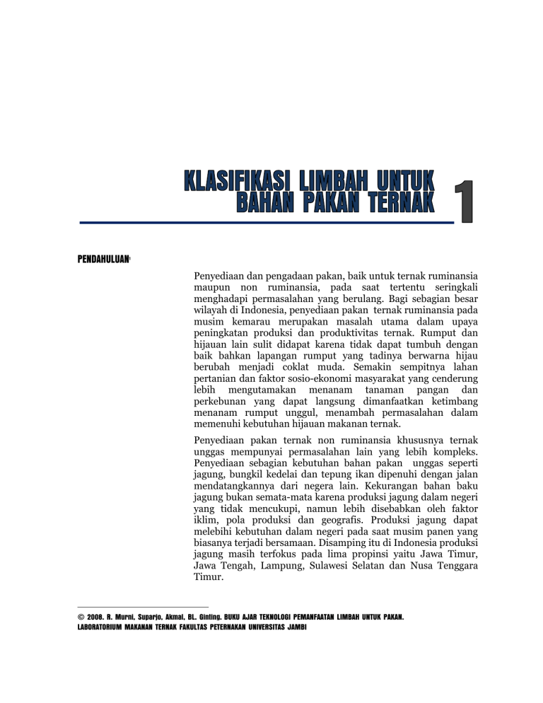 PENDAHULUAN 1 Penyediaan dan pengadaan pakan, baik untuk ternak ruminansia maupun non ruminansia, pada saat tertentu seringkali menghadapi permasalahan yang berulang. Bagi sebagian besar wilayah di Indonesia, penyediaan pakan ternak ruminansia pada musim kemarau merupakan masalah utama dalam upaya peningkatan produksi dan produktivitas ternak. Rumput dan hijauan lain sulit didapat karena tidak dapat tumbuh dengan baik bahkan lapangan rumput yang tadinya berwarna hijau berubah menjadi coklat muda. Semakin sempitnya lahan pertanian dan faktor sosio-ekonomi masyarakat yang cenderung lebih mengutamakan menanam tanaman pangan dan perkebunan yang dapat langsung dimanfaatkan ketimbang menanam rumput unggul, menambah permasalahan dalam memenuhi kebutuhan hijauan makanan ternak. Penyediaan pakan ternak non ruminansia khususnya ternak unggas mempunyai permasalahan lain yang lebih kompleks. Penyediaan sebagian kebutuhan bahan pakan unggas seperti jagung, bungkil kedelai dan tepung ikan dipenuhi dengan jalan mendatangkannya dari negera lain. Kekurangan bahan baku jagung bukan semata-mata karena produksi jagung dalam negeri yang tidak mencukupi, namun lebih disebabkan oleh faktor iklim, pola produksi dan geografis. Produksi jagung dapat melebihi kebutuhan dalam negeri pada saat musim panen yang biasanya terjadi bersamaan. Disamping itu di Indonesia produksi jagung masih terfokus pada lima propinsi yaitu Jawa Timur, Jawa Tengah, Lampung, Sulawesi Selatan dan Nusa Tenggara Timur. © 2008. R. Murni, Suparjo, Akmal, BL. Ginting. BUKU AJAR TEKNOLOGI PEMANFAATAN LIMBAH UNTUK PAKAN. LABORATORIUM MAKANAN TERNAK FAKULTAS PETERNAKAN UNIVERSITAS JAMBI PENGERTIAN LIMBAH Dewasa ini telah terjadi pergeseran pola penyediaan bahan baku pakan pada upaya pencarian bahan alternatif sebagai pengganti bahan baku pakan konvensional. Bahan baku alternatif secara umum bersumber dari limbah pertanian (crop residue), hasil sampingan agroindustri (agro-industry by-product), limbah ternak dan pengolahan ternak (animal waste) dan limbah perikanan (fishery waste) dan bahan pakan non konvensional (non-conventional feed). Limbah diartikan sebagai suatu substansi yang didapatkan selama pembuatan sesuatu (by-product), barang sisa (residue) atau sesuatu yang tidak berguna dan harus dibuang (waste). Limbah dapat pula diartikan sebagai hasil samping dari suatu kegiatan atau aktivitas. Bahan pakan non konvensional menunjukkan semua bahan pakan yang secara tradisional tidak umum digunakan sebagai pakan ternak atau dalam produksi ransum ternak secara komersial. Dalam konteks bidang peternakan, sebagian besar limbah pertanian, hasil sampingan agroindustri, limbah pengolahan ternak termasuk dalam kategori bahan pakan non-konvensional (Gambar 1, I) karena belum umum digunakan sebagai bahan pakan ternak. Beberapa jenis limbah lain (Gambar 1, II), seperti tepung ikan yang berasal dari sisa pengolahan ikan, dedak, bekatul dan bungkil kedelai, tidak termasuk bahan pakan nonkonvensional karena bahan tersebut sudah umum digunakan sebagai bahan penyusun ransum secara komersial. Pengelompokan suatu bahan pakan ke dalam pakan nonkonvensional dapat berubah seiring dengan pemanfaatannya sebagai bahan baku penyusun ransum ternak. A B II C I Gambar 1. Ilustrasi hubungan antara limbah (A), bahan pakan konvensional (B) dan bahan pakan non konvensional (C) Klasifikasi Limbah sebagai Bahan Pakan Ternak |2 KEUNTUNGAN PEMANFAATAN LIMBAH SEBAGAI PAKAN TERNAK Limbah yang dihasilkan dari suatu aktivitas belum mempunyai nilai ekonomis dan pemanfaatannya dibatasi oleh waktu dan ruang sehingga limbah dapat dianggap sebagai sumberdaya tambahan yang dapat dioptimalkan. Pemanfaatan limbah sebagai pakan ternak mampu memberi nilai ekonomis melalui pengurangan biaya pakan dan membantu menekan pencemaran lingkungan. Beberapa keuntungan dalam pemanfaatan limbah sebagai pakan ternak antara lain : 1. Sanitasi lingkungan: upaya pemanfaatan limbah sebagai pakan ternak secara tidak langsung mampu meningkatkan kebersihan dan menekan pencemaran akibat pembuangan limbah yang tidak tepat. Limbah peternakan dan perikanan berpotensi menyebarkan atau menularkan penyakit berbahaya bagi manusia dan merupakan media yang cocok bagi pertumbuhan mikroorganisme. Beberapa limbah agroindustri mempunyai kandungan air yang tinggi sehingga mudah mengalami perombakan yang menimbulkan bau busuk. Pembakaran limbah berarti membuang-buang potensi atau zat-zat makanan yang terkandung di dalamnya dan dapat menimbulkan polusi asap. 2. Menekan impor bahan pakan: substitusi penggunaan bahan baku yang pemenuhan ketersediaannya masih diimpor dengan limbah dengan kandungan zat makanan yang setara merupakan alternatif yang bijaksana. Industri lokal seperti industri perunggasan dapat mengolah dan memanfaatkan seluruh limbah usahanya menjadi poultry offal meal (berasal dari darah, kaki, kepala, usus dan bulu) yang merupakan pakan bernilai gizi tinggi dan dapat menjadi pengganti sumber protein. Limbah yang berasal dari buah-buahan dan sayur-sayuran seperti limbah jeruk, limbah tomat dan kentang dapat diolah menjadi bahan pakan dengan kualitas yang lebih baik. Terbentuknya beberapa bahan pakan baru berkualitas berasal dari berbagai limbah tentunya dapat mengurangi jumlah impor bahan pakan yang selama ini dilakukan terutama tepung ikan, tepung daging dan bungkil-bungkilan. 3. Menciptakan lapangan kerja baru: kegiatan pengolahan limbah menjadi bahan pakan tentunya memerlukan tenaga manusia yang juga berarti menciptakan lapangan kerja baru. 4. Memberi nilai tambah terhadap limbah: pemanfaatkan limbah yang mungkin sebelumnya belum digunakan sebagai bahan pakan dengan sendirinya akan memberikan nilai ekonomis terhadap limbah yang ada. Pemilihan jenis limbah yang akan dimanfaatkan sebagai bahan pakan harus mempertimbangkan nilai ekonomis yang diberikan, palatabilitas, ketersediaan dan kesinambungan, kandungan Klasifikasi Limbah sebagai Bahan Pakan Ternak |3 nutrisi, tambahan biaya akibat transportasi, peralatan tambahan u