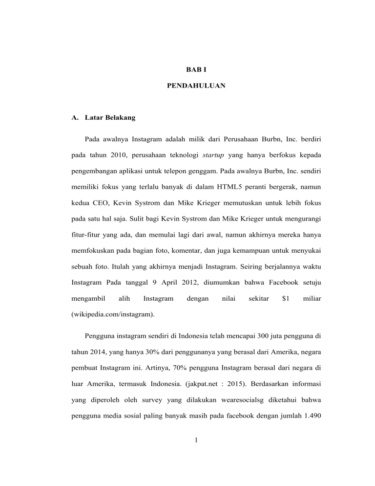 BAB I PENDAHULUAN A. Latar Belakang Pada awalnya Instagram adalah milik dari Perusahaan Burbn, Inc. berdiri pada tahun 2010, perusahaan teknologi startup yang hanya berfokus kepada pengembangan aplikasi untuk telepon genggam. Pada awalnya Burbn, Inc. sendiri memiliki fokus yang terlalu banyak di dalam HTML5 peranti bergerak, namun kedua CEO, Kevin Systrom dan Mike Krieger memutuskan untuk lebih fokus pada satu hal saja. Sulit bagi Kevin Systrom dan Mike Krieger untuk mengurangi fitur-fitur yang ada, dan memulai lagi dari awal, namun akhirnya mereka hanya memfokuskan pada bagian foto, komentar, dan juga kemampuan untuk menyukai sebuah foto. Itulah yang akhirnya menjadi Instagram. Seiring berjalannya waktu Instagram Pada tanggal 9 April 2012, diumumkan bahwa Facebook setuju mengambil alih Instagram dengan nilai sekitar $1 miliar (wikipedia.com/instagram). Pengguna instagram sendiri di Indonesia telah mencapai 300 juta pengguna di tahun 2014, yang hanya 30% dari penggunanya yang berasal dari Amerika, negara pembuat Instagram ini. Artinya, 70% pengguna Instagram berasal dari negara di luar Amerika, termasuk Indonesia. (jakpat.net : 2015). Berdasarkan informasi yang diperoleh oleh survey yang dilakukan wearesocialsg diketahui bahwa pengguna media sosial paling banyak masih pada facebook dengan jumlah 1.490 1 2 juta pengguna. Sedangkan Instagram sendiri penggunanya masih sama dengan pengguna Skype dengan jumlah 300 juta pengguna di tahun 2014. Berikut adalah jumlah pengguna media sosial di dunia per Agustus 2015 : Tabel 1. Jumlah pengguna media sosial di dunia per Agustus 2015 Sumber : http://wearesocial.net/ Seperti namanya, Instagram mempunyai karakter "instan", dan juga "telegram" yang cara kerjanya untuk mengirimkan informasi kepada orang lain dengan cepat (wikipedia.com/instagram). Sedangkan karakteristik Instagram menurut penelitian yang dilakukan oleh Eman Wally dan Dr. Swapna Koshy dalam jurnal yang berjudul, “The use of Instagram as a marketing tool by Emirati female entrepreneurs: an exploratory study” dapat diketahui karakter Instagram 3 yang paling penting adalah gratis. Selanjutnya fitur Instagram kedua adalah tidak ada peraturan pemerintah atau pajak pada iklan yang membuatnya media yang paling nyaman untuk digunakan di mempromosikan produk mereka. The most important characteristic of Instagram that made it convenient to use for marketing by small businesses is the fact that it is free of charge. The second Instagram feature that made it suitable for small businesses is that there are no governmental regulations or taxes on the advertisements which make it the most convenient medium to use in promoting their products. (Wally dan Koshy, 2014:12). Berbeda dari yang dituturkan oleh Eman Wally dan Dr. Swapna Koshy di atas, Linnea Berg dan Lisa Sterner dalam jurnal yang berjudul, “Marketing on Instagram (A qualitative study on how companies make use of Instagram as a marketing tool)” mengatakan bahwa salah satu karakter utama instagram adalah real time, jelas terlihat di instagram feed atau tampilan yang terus diperbarui sebagai content yang muncul adalah yang terbaru. Karakteristik yang kedua adalah keberadaan hashtags atau tagar yang memungkinkan informasi statistik kecil dari instagram yang berguna untuk menjangkau kelompok pelanggan tertentu. Karakteristik unik ketiga pada Instagram adalah memfokuskan pada jenis konten dibagi yaitu; gambar dan video (Berg dan Sterner, 2015: 1-66). Dengan mengutamakan layanan posting melalui foto dan video, instagram tidak hanya dijadikan media untuk sekadar having fun tetapi juga kini dimanfaatkan oleh banyak pembisnis sebagai lahan mencari keuntungan. Hingga tahun 2015 ini, sudah tidak terhitung lagi jumlah online shop yang menggunakan instagram sebagai medianya. Seperti halnya media sosial lainnya, ternyata 4 instagram juga memiliki faktor – faktor yang sekaligus menjadi kelebihan Instagram. Berdasarkan penelitian yang dilakukan Betari Kiranasari dapat diketahui dari hasil penelitian tersebut keuntungan menggunakan Instagram dalam aspek kognitif, bisa mendapatkan pengetahuan yang mereka butuhkan seperti tren apa yang sedang berlangsung, berita apa yang sedang hangat diperbincangkan, dan sebagainya. Selain itu aspek Integrasi sosial, online seller dapat berinteraksi baik dengan sesama seller maupun dengan buyer. Bisa mendapatkan banyak relasi dan rekan baik secara online maupun offline dengan berjualan menggunakan Instagram. Kemudian Instagram digunakan tidak selalu untuk berjualan semata, melainkan untuk kebutuhan hiburan seperti melihat foto-foto bagus, berbelanja online, dan lain sebagainya. Selain hal yang telah disebutkan di atas, terdapat juga aspek kemudahan akses, biaya relatif, dan lifestyle envy atau dalam menggunakan Instagram tidak hanya sekedar sebagai media sharing, namun sekaligus sebagai media pengukur tingkat kelas sosial dari lifestyle yang ditampilkan di gallery penggunanya (Kiranasari, 2014: 78-79). Penggunaan Instagram sebagai media dalam menampilkan karya dalam gallery penggunanya sendiri telah dilakukan oleh Komunitas Surakarya. Komunitas belajar menulis, lettering dan kaligrafi di Surakarta yang dalam media sosial Instagram bernama Surakarya / @surakarya. Komunitas ini awalnya terbentuk dari beberapa pengurus Surakarya yang tergabung dari komunitas Kaligrafina, Belmenid atau Belajar Menulis Indonesia. 5 Diawali oleh Kaligrafina yang didirikan oleh Prafitriani dan Erwin Indrawan pada Agustus 2014, muncul lah Belmenid, yaitu komunitas ini yang diawali dari obrolan santai empat pendirinya tersebut, akhirnya berkembang di banyak kota di Indonesia. Salah satu pendirinya Hendry Juanda mengatakan, Belmen digagas bersama tiga kawannya yang belum pernah bertemu sama sekali. Mereka adalah Hendry, Nanda, Nduk, dan Kiko. Pada tanggal 19 September 2014, mereka berinisiatif membuat grup Whatsapp yang semuanya punya hobi dan minat yang sama di dunia lettering, kaligrafi, dan tipografi. (Astuti, Tia, detikHOT, 08 Juli, 2015). Ar
