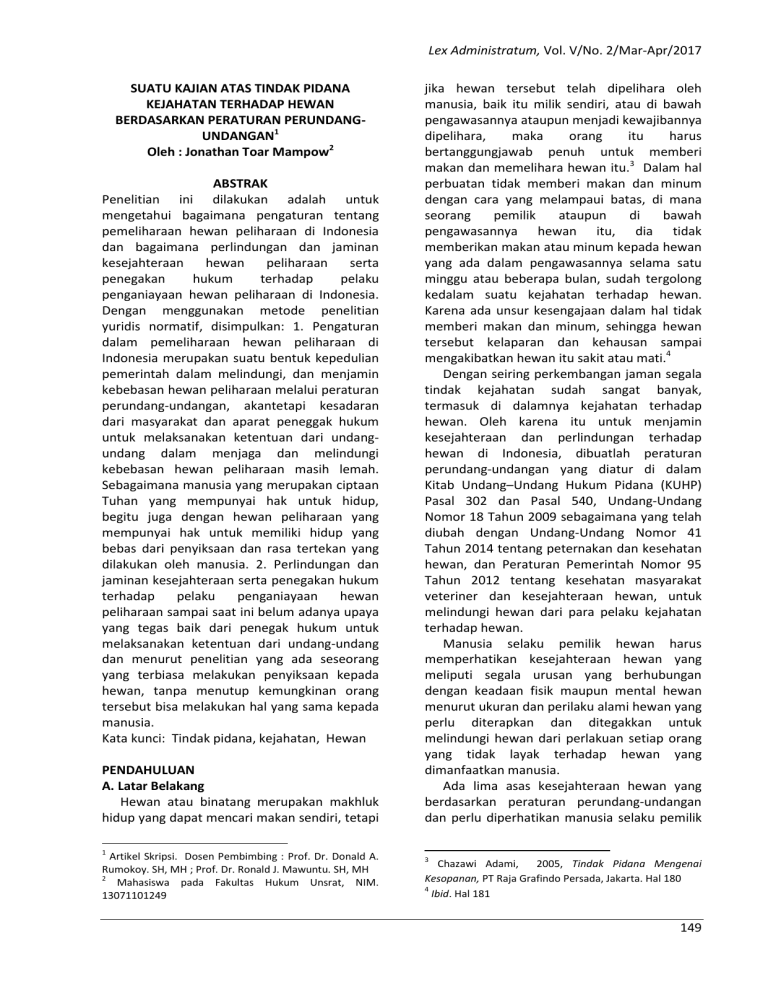 Lex Administratum, Vol. V/No. 2/Mar-Apr/2017 SUATU KAJIAN ATAS TINDAK PIDANA KEJAHATAN TERHADAP HEWAN BERDASARKAN PERATURAN PERUNDANGUNDANGAN1 Oleh : Jonathan Toar Mampow2 ABSTRAK Penelitian ini dilakukan adalah untuk mengetahui bagaimana pengaturan tentang pemeliharaan hewan peliharaan di Indonesia dan bagaimana perlindungan dan jaminan kesejahteraan hewan peliharaan serta penegakan hukum terhadap pelaku penganiayaan hewan peliharaan di Indonesia. Dengan menggunakan metode penelitian yuridis normatif, disimpulkan: 1. Pengaturan dalam pemeliharaan hewan peliharaan di Indonesia merupakan suatu bentuk kepedulian pemerintah dalam melindungi, dan menjamin kebebasan hewan peliharaan melalui peraturan perundang-undangan, akantetapi kesadaran dari masyarakat dan aparat peneggak hukum untuk melaksanakan ketentuan dari undangundang dalam menjaga dan melindungi kebebasan hewan peliharaan masih lemah. Sebagaimana manusia yang merupakan ciptaan Tuhan yang mempunyai hak untuk hidup, begitu juga dengan hewan peliharaan yang mempunyai hak untuk memiliki hidup yang bebas dari penyiksaan dan rasa tertekan yang dilakukan oleh manusia. 2. Perlindungan dan jaminan kesejahteraan serta penegakan hukum terhadap pelaku penganiayaan hewan peliharaan sampai saat ini belum adanya upaya yang tegas baik dari penegak hukum untuk melaksanakan ketentuan dari undang-undang dan menurut penelitian yang ada seseorang yang terbiasa melakukan penyiksaan kepada hewan, tanpa menutup kemungkinan orang tersebut bisa melakukan hal yang sama kepada manusia. Kata kunci: Tindak pidana, kejahatan, Hewan PENDAHULUAN A. Latar Belakang Hewan atau binatang merupakan makhluk hidup yang dapat mencari makan sendiri, tetapi jika hewan tersebut telah dipelihara oleh manusia, baik itu milik sendiri, atau di bawah pengawasannya ataupun menjadi kewajibannya dipelihara, maka orang itu harus bertanggungjawab penuh untuk memberi makan dan memelihara hewan itu.3 Dalam hal perbuatan tidak memberi makan dan minum dengan cara yang melampaui batas, di mana seorang pemilik ataupun di bawah pengawasannya hewan itu, dia tidak memberikan makan atau minum kepada hewan yang ada dalam pengawasannya selama satu minggu atau beberapa bulan, sudah tergolong kedalam suatu kejahatan terhadap hewan. Karena ada unsur kesengajaan dalam hal tidak memberi makan dan minum, sehingga hewan tersebut kelaparan dan kehausan sampai mengakibatkan hewan itu sakit atau mati.4 Dengan seiring perkembangan jaman segala tindak kejahatan sudah sangat banyak, termasuk di dalamnya kejahatan terhadap hewan. Oleh karena itu untuk menjamin kesejahteraan dan perlindungan terhadap hewan di Indonesia, dibuatlah peraturan perundang-undangan yang diatur di dalam Kitab Undang–Undang Hukum Pidana (KUHP) Pasal 302 dan Pasal 540, Undang-Undang Nomor 18 Tahun 2009 sebagaimana yang telah diubah dengan Undang-Undang Nomor 41 Tahun 2014 tentang peternakan dan kesehatan hewan, dan Peraturan Pemerintah Nomor 95 Tahun 2012 tentang kesehatan masyarakat veteriner dan kesejahteraan hewan, untuk melindungi hewan dari para pelaku kejahatan terhadap hewan. Manusia selaku pemilik hewan harus memperhatikan kesejahteraan hewan yang meliputi segala urusan yang berhubungan dengan keadaan fisik maupun mental hewan menurut ukuran dan perilaku alami hewan yang perlu diterapkan dan ditegakkan untuk melindungi hewan dari perlakuan setiap orang yang tidak layak terhadap hewan yang dimanfaatkan manusia. Ada lima asas kesejahteraan hewan yang berdasarkan peraturan perundang-undangan dan perlu diperhatikan manusia selaku pemilik 1 Artikel Skripsi. Dosen Pembimbing : Prof. Dr. Donald A. Rumokoy. SH, MH ; Prof. Dr. Ronald J. Mawuntu. SH, MH 2 Mahasiswa pada Fakultas Hukum Unsrat, NIM. 13071101249 3 Chazawi Adami, 2005, Tindak Pidana Mengenai Kesopanan, PT Raja Grafindo Persada, Jakarta. Hal 180 4 Ibid. Hal 181 149 Lex Administratum, Vol. V/No. 2/Mar-Apr/2017 hewan, untuk memastikan hewan tersebut telah memenuhi syarat dan dapat dikatakan bahwa hewan itu telah sejahtera hidupnya, yaitu : 1. Bebas dari rasa lapar, haus dan kekurangan nutrisi (malnutrisi) 2. Bebas dari rasa sakit dan tidak nyaman. 3. Bebas dari rasa takut dan tertekan. 4. Bebas dari kesakitan, luka dan penyakit. 5. Bebas untuk mengekspresikan pola perilaku normal.5 Akibat dari kekerasan pada hewan yang dilakukan oleh manusia, yaitu hewan tersebut bisa menderita, cacat seumur hidup, dan bisa juga menyebabkan kematian apabila kekerasan yang dilakukan sudah mencapai tingkat yang tidak bisa ditoleransi. Pada dasarnya penganiayaan terhadap hewan sekalipun ringan tetap harus dibuktikan secara hukum, karena telah melanggar hukum positif. Jika praktik penganiayaan terhadap hewan tidak segera dilakukan tindakan hukum sama sekali, maka sama saja kita melegalkan penyiksaan hewan di Indonesia. Berdasarkan latar belakang dalam pembahasan di atas, sehingga penulis memilih tema skripsi yang berjudul “Suatu Kajian Atas Tindak Pidana Kejahatan Terhadap Hewan Berdasarkan Peraturan Perundang-Undangan”. B. Perumusan Masalah 1. Bagaimana pengaturan tentang pemeliharaan hewan peliharaan di Indonesia ? 2. Bagaimana perlindungan dan jaminan kesejahteraan hewan peliharaan serta penegakan hukum terhadap pelaku penganiayaan hewan peliharaan di Indonesia ? C. Metode Penelitian Jenis penelitian yang dilakukan dalam penyusunan skripsi ini adalah yuridis normatif. Ditinjau dari objek penelitian adalah hukum positif berdasarkan masalah tindak pidana kejahatan terhadap hewan di Indonesia diatur dalam Kitab Undang-Undang Hukum Pidana (KUHP) Pasal 302 dan Pasal 540, dan UndangUndang Nomor 18 Tahun 2009 sebagaimana yang telah diubah dengan Undang-Undang 5 Ibid. Hal. 182 150 Nomor 41 Tahun 2014 tentang Perternakan dan Kesehatan Hewan serta Peraturan Pemerintah Nomor 95 Tahun 2012 tentang Kesehatan Masyarakat Veteriner dan Kesejahteraan Hewan. PEMBAHASAN A. Pengaturan Tentang Pemeliharaan Hewan Peliharaan di Indonesia Undang-Undang Nomor 18 Tahun 2009 sebagaimana yang telah diubah dengan Undang-