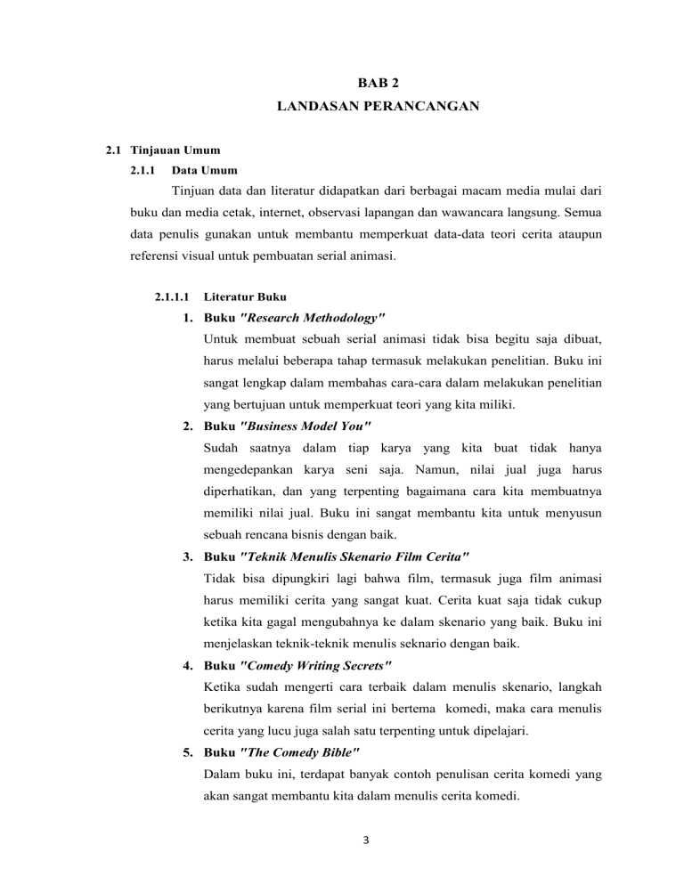 BAB 2 LANDASAN PERANCANGAN 2.1 Tinjauan Umum 2.1.1 Data Umum Tinjuan data dan literatur didapatkan dari berbagai macam media mulai dari buku dan media cetak, internet, observasi lapangan dan wawancara langsung. Semua data penulis gunakan untuk membantu memperkuat data-data teori cerita ataupun referensi visual untuk pembuatan serial animasi. 2.1.1.1 Literatur Buku 1. Buku "Research Methodology" Untuk membuat sebuah serial animasi tidak bisa begitu saja dibuat, harus melalui beberapa tahap termasuk melakukan penelitian. Buku ini sangat lengkap dalam membahas cara-cara dalam melakukan penelitian yang bertujuan untuk memperkuat teori yang kita miliki. 2. Buku "Business Model You" Sudah saatnya dalam tiap karya yang kita buat tidak hanya mengedepankan karya seni saja. Namun, nilai jual juga harus diperhatikan, dan yang terpenting bagaimana cara kita membuatnya memiliki nilai jual. Buku ini sangat membantu kita untuk menyusun sebuah rencana bisnis dengan baik. 3. Buku "Teknik Menulis Skenario Film Cerita" Tidak bisa dipungkiri lagi bahwa film, termasuk juga film animasi harus memiliki cerita yang sangat kuat. Cerita kuat saja tidak cukup ketika kita gagal mengubahnya ke dalam skenario yang baik. Buku ini menjelaskan teknik-teknik menulis seknario dengan baik. 4. Buku "Comedy Writing Secrets" Ketika sudah mengerti cara terbaik dalam menulis skenario, langkah berikutnya karena film serial ini bertema komedi, maka cara menulis cerita yang lucu juga salah satu terpenting untuk dipelajari. 5. Buku "The Comedy Bible" Dalam buku ini, terdapat banyak contoh penulisan cerita komedi yang akan sangat membantu kita dalam menulis cerita komedi. 3 4 6. Buku "Color Basic" Salah satu aspek terpenting dalam film apalagi animasi adalah warna. Bagaimana harus nampak baik dan menarik. Buku ini seperti pedoman awal dalam menentukan pewarnaan 7. Buku "The Animators's Survival Kit" Buku ini seperti buku wajib dimiliki setiap animator yang ingin membuat karya animasi baik dan sesuai dengan standar yang banyak orang gunakan. 8. Buku "Simplified Drawing for Planning Animation" Sebelum masuk kedalam eksekusi 3 dimensi, kita diharuskan untuk membuat stodyboard, dan buku ini menjadi salah satu referensi baik bagaimana sebuah rencana pembuatan film animasi dibuat termasuk storyboard yang baik. 9. Buku "How to Draw and Paint Crazy Cartoon Characters" Ciri khas utama dalam film animasi adalah karakternya yang digambar selalu lucu, menarik dan memiliki keunikan tersendiri. Karena jika tidak apa bedanya dengan film biasa. Buku ini banyak mengajarkan saya membuat karakter dengan baik. 10. Buku "The Encyclopedia Cartooning Techniques" Berbicara animasi tidak bisa lepas dari cartoon karena cartoon memang cikal bakal dari animasi yang kita kenal sekarang. Teknik-teknik dalam animasi dibahas habis dalam buku ini. 11. Buku "Encyclopedia of Animal Science" Mencari tahu sifat-sifat hewan yang menjadi tokoh utama dalam serial animasi saya, buku ini membuat saya tahu beberapa hal yang belum saya ketahui sebelumnya 12. Buku "Kamus Miniku Peternakan" Berlatar tempat di kebun dan peternakan, buku ini menjadi salah satu pedoman referensi saya mengetahui ada apa saja didalam peternakan. 2.1.1.2 Literatur Internet 1. http://www.dailywritingtips.com Dari sinilah saya mendapat data penting mengenai 20 jenis komedi yang dijelaskan secara detail dan sangat mudah dipahami. 5 Diakses pada 14 Februari 2014 http://www.dailywritingtips.com/20-types-and-formsof-humor 2. http://vector.tutsplus.com Di web ini terdapat contoh yang sangat jelas dan mudah dipahami, serta menjadi salah satu sumber referensi terbaik saya untuk membuat karakter yang unik. Diakses pada 4 Maret 2014 ttp://vector.tutsplus.com/articles/theory/the-elements-ofcute-character-design 3. http://duniasapi.com Untuk mempelajari sifat dan tingkah laku dari hewan ternak ketika mereka sedang marah, stress dan juga tanda-tanda yang bisa dilihat pada saat mereka sedang senang Diakses pada 25 Januari 2014 http://duniasapi.com/id/resep/2408-mengurangi-stresspada-ternak.html 2.1.2 Animasi Animasi adalah representasi grafis dari gambar untuk menunjukkan gerakan dalam gambar-gambar. Serangkaian gambar yang dihubungkan bersama dan biasanya difoto oleh kamera. Gambar-gambar telah sedikit berubah antara frame yang satu dengan lainnya sehingga ketika gambargambar itu digeser atau dimainkan kembali dengan cepat (24 frame per detik) tampak ada gerakan mulus dalam gambar. Menurut Webster’s Unabridged Dictionary, animasi adalah sebuah keadaan dimana ada unsur gambar didalamnya, dalam bentuk gambar apapun. Dalam artian bentuk gambar yang merepresentasikan sesuatu atau bahkan gambar abstrak. Kemudian gambar tersebut terasa hidup, kumpulan gambar yang banyak dan digerakan secara cepat, dan dengan kualitas kepadatan gambar yang baik. Bagian terpenting dari animasi adalah terasa hidup. Tokoh terkenal yang luar biasa dalam perkembangan dunia animasi adalah Walt Disney dengan salah satu karyanya adalah Mickey Mouse pada tahun 1930-an. Dan beliau mengatakan "Animasi bisa menjelaskan apa pun pikiran manusia 6 dapat bayangkan". Hal ini membuat manusia bisa menciptakan sesuatu yang apapun mereka inginkan tanpa harus kesulitan dalam memepersiapkan banyak hal, hanya perlu ide dan inspirasi kemudian mulai menggambar dan menggerakan. Tokoh terkenal lain dalam dunia animasi adalah Winsor McCay. Bapak animasi yang mengaku bahwa dia adalah animator pertama di dunia mengatakan bahwa animasi adalah hal unik yang merupakan sebuah pencapaian terbaik dalam hidupnya. Dan menurutnya mengapa hanya melihat gambar jika bisa melihatnya bergerak. Kutipan lain yang luar biasa dari Winsor McCay adalah dia pernah mengatakan "8000 mil dari bulan, tapi saya akan tetap akan menuju kesana". Menunjukan tekadnya untuk terus berkarya dan memberitahu kepada generasi sekarang bahwa dunia animasi tidak akan pernah mati dan istirahat, teruslah berkarya. Menurut saya, animasi itu sendiri adalah memang gambar yang bergerak yang kemudian merepresent