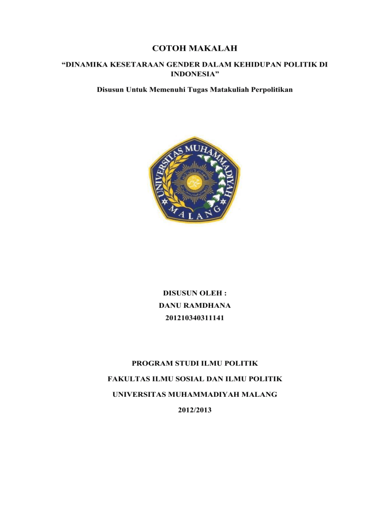 COTOH MAKALAH “DINAMIKA KESETARAAN GENDER DALAM KEHIDUPAN POLITIK DI INDONESIA” Disusun Untuk Memenuhi Tugas Matakuliah Perpolitikan DISUSUN OLEH : DANU RAMDHANA 201210340311141 PROGRAM STUDI ILMU POLITIK FAKULTAS ILMU SOSIAL DAN ILMU POLITIK UNIVERSITAS MUHAMMADIYAH MALANG 2012/2013 KATA PENGANTAR Alhamdulillah, segala puji dan syukur bagi Allah SWT yang telah memberikan kemampuan, kekuatan, serta keberkahan baik waktu, tenaga, maupun pikiran kepada penulis sehingga dapat menyelesaikan makalah yang berjudul “Dinamika Kesetaraan Gender Dalam Kehidupan Politik Di Indonesia” tepat pada waktunya. Dalam penyusunan makalah ini, penulis banyak mendapat tantangan dan hambatan akan tetapi dengan bantuan dari berbagai pihak tantangan itu bisa teratasi. Oleh karena itu, penulis mengucapkan terima kasih yang sebesar-besarnya kepada ibu Dr. Dwi Windyastuti Budi Hendrarti, Dra.,MA dan Dr. Siti Aminah, Dra.,MA selaku dosen Politik Gender Dan Demokrasi atas bimbingan, pengarahan, dan kemudahan yang telah diberikan kepada penulis dalam pengerjaan makalah ini. Penulis menyadari bahwa masih banyak kekurangan pada penulisan makalah ini. Maka dari itu, saran dan kritik yang membangun sangat penulis harapkan dari pembaca sekalian. Penulis berharap semoga makalah ini dapat bermanfaat bagi siapa saja yang membacanya. Surabaya, 4 Juni 2013 Penulis i Daftar isi ii iii BAB I PENDAHULUAN 1.1 Latar belakang Dilihat dari latar belakang historisnya, konsep kesetaraan gender menurut Rowbotham sebenarnya lahir dari pemberontakan kaum perempuan di negara-negara barat akibat penindasan yang dialami mereka selama berabad-abad lamanya. Sejak zaman Yunani, Romawi, Abad Pertengahan (the Middle Ages), dan bahkan pada “abad pencerahan” sekali pun, barat menganggap wanita sebagai makhluk inferior, manusia yang cacat, dan sumber dari segala kejahatan atau dosa. Hal ini pun kemudian memunculkan gerakan perempuan barat menuntut hak dan kesetaraan perempuan dalam bidang ekonomi dan politik yang pada akhirnya dikenal dengan sebutan feminis. Kelahiran “feminisme” dibagi menjadi tiga gelombang, yakni feminisme gelombang pertama yang dimulai dari publikasi Mary Wollstonecraft berjudul “Vindication of the Rights of Women” pada tahun 1972, yang menganggap kerusakan psikologis dan ekonomi yang dialami perempuan disebabkan oleh ketergantungan ekonomi pada laki-laki dan peminggiran perempuan dari ruang publik. Setelah itu, muncul feminisme gelombang kedua dengan doktrinnya yang memandang perbedaan gender sengaja diciptakan untuk memperkuat penindasan terhadap perempuan. Pada gelombang kedua inilah dimulai gugatan perempuan terhadap institusi pernikahan, keibuan (motherhood), hubungan lawan jenis (heterosexual relationship) dan secara radikal mereka berusaha mengubah setiap aspek dari kehidupan pribadi dan politik. Terakhir adalah feminisme gelombang ketiga yang lebih menekankan kepada keragaman (diversity), sebagai contoh ketertindasan kaum perempuan heteroseksual yang dianggap berbeda dengan ketertindasan yang dialami kaum lesbi dan sebagainya. Indonesia pun memiliki sejarah panjang dalam memperjuangkan kesetaraan gender. Sejak era Kartini, kaum perempuan di Indonesia mulai menyadari arti pentingnya kesetaraan gender dalam memperoleh hak-hak publik seperti yang diperoleh kaum lelaki. Pada dasarnya, jaminan persamaan kedudukan laki-laki dan perempuan khususnya di bidang pemerintahan dan hukum telah ada sejak Undang-Undang Dasar 1945 dibentuk yakni dalam pasal 27 ayat 1. Namun pada kenyataannya, masih banyak program-program pembangunan yang biayanya dari anggaran keuangan pemerintah Indonesia sendiri atau dari dana bantuan maupun pinjaman luar negeri, yang hasil maupun dampak positifnya lebih memihak laki-laki, ketimbang perempuan. Selain itu, alokasi dana dan sumber-sumber untuk sektor-sektor yang akrab dengan perempuan 1 dan menyentuh pada kehidupan privat di pelosok-pelosok Indonesia sangatlah minim. Dikeluarkannya Instruksi Presiden nomor 9 Tahun 2000 tentang Pengarusutamaan Gender merupakan indikator bahwa isu gender yang terus bergulir belum mendapatkan perhatian khusus dalam berbagai bidang pembangunan, termasuk pembangunan politik yang berwawasan gender. Bahkan partisipasi perempuan dalam kehidupan politik di Indonesia memperlihatkan representasi yang rendah dalam semua tingkat pengambilan keputusan, baik di tingkat eksekutif, yudikatif, maupun birokrasi, partai politik, bahkan kehidupan politik lainnya. Oleh karena itu pada makalah ini, penulis mencoba untuk membahas pendahuluan yang berisikan latar belakang dan pernyataan argumen. Selanjutnya, penulis juga akan menguraikan beberapa gagasan-gagasan serta bukti-bukti yang mendukung argumen tersebut pada bab berikutnya, yaitu bagian pembahasan. Dan di bagian terakhir makalah ini, penulis akan mencoba untuk memberikan ringkasan kesimpulan dan juga saran. 1.2 Rumusan Masalah 1. Bagaimana permasalahan kesetaraan gender di Indonesia? 2. Bagaimana arti pentingnya kesetaraan gender dalam kehidupan politik di Indonesia? 3. Bagaimana upaya memperjuangkan kesetaraan gender dalam kehidupan politik di Indonesia? 1.3 Tujuan Penulisan Adapun tujuan yang ingin dicapai dalam penulisan makalah ini ini adalah 1. Mengetahui permasalahan kesetaraan gender di Indonesia 2. Mengetahui arti pentingnya kesetaraan gender dalam kehidupan politik di Indonesia. 3. Mengetahui upaya memperjuangkan kesetaraan gender dalam kehidupan politik di Indonesia. 1.4 Manfaat Penulisan Adapun manfaat yang ingin dicapai dalam penulisan makalah ini adalah 1. Untuk mengetahui bagaimana permasalahan kesetaraan gender di Indonesia. 2. Untuk mengetahui bagaimana arti pentingnya kesetaraan gender dalam kehidupan politik di Indonesia. 3. Untuk mengetahui bagaimana upaya memperjuangkan kesetaraan gender dalam kehidupan politik di Indonesia. 2 BAB II PEMBAHASAN 2.1 Permasalahan Kesetaraan Gender di Indonesia Pada dasarnya semua orang sepakat bahwa perempuan dan laki-laki berbeda. Namun, gender bukanlah jenis kelamin