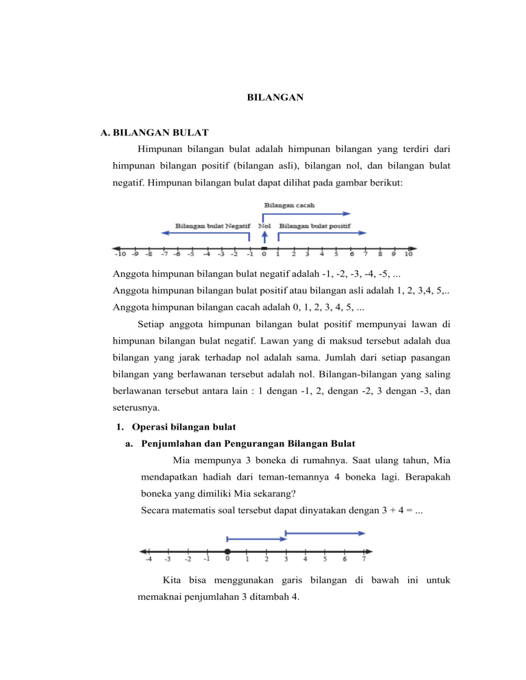 BILANGAN A. BILANGAN BULAT Himpunan bilangan bulat adalah himpunan bilangan yang terdiri dari himpunan bilangan positif (bilangan asli), bilangan nol, dan bilangan bulat negatif. Himpunan bilangan bulat dapat dilihat pada gambar berikut: Anggota himpunan bilangan bulat negatif adalah -1, -2, -3, -4, -5, ... Anggota himpunan bilangan bulat positif atau bilangan asli adalah 1, 2, 3,4, 5,.. Anggota himpunan bilangan cacah adalah 0, 1, 2, 3, 4, 5, ... Setiap anggota himpunan bilangan bulat positif mempunyai lawan di himpunan bilangan bulat negatif. Lawan yang di maksud tersebut adalah dua bilangan yang jarak terhadap nol adalah sama. Jumlah dari setiap pasangan bilangan yang berlawanan tersebut adalah nol. Bilangan-bilangan yang saling berlawanan tersebut antara lain : 1 dengan -1, 2, dengan -2, 3 dengan -3, dan seterusnya. 1. Operasi bilangan bulat a. Penjumlahan dan Pengurangan Bilangan Bulat Mia mempunya 3 boneka di rumahnya. Saat ulang tahun, Mia mendapatkan hadiah dari teman-temannya 4 boneka lagi. Berapakah boneka yang dimiliki Mia sekarang? Secara matematis soal tersebut dapat dinyatakan dengan 3 + 4 = ... Kita bisa menggunakan garis bilangan di bawah ini untuk memaknai penjumlahan 3 ditambah 4. Karena Mia memiliki 3 boneka, maka dari titik asal (0) bergerak 3 satuan ke kanan. Kemudian, karena mendapatkan 4 boneka lagi, berarti terus bergerak ke kanan 4 satuan. Sehingga hasil akhirnya adalah 7 Jadi, boneka yang dimiliki Mia sekarang adalah 7 boneka. Selisih antara dua bilangan bulat sama dengan jarak kedua bilangan tersebut pada garis bilangan. Misalnya : (1) selisih antara 1 dengan 4 adalah 3 satuan, (2) selisih antara -2 dengan 3 adalah 5 satuan. Perhatikan ilustrasi berikut. Selisih dari dua bilangan bulat adalah positif. Dari Gambar 1.6 kita bisa melihat bahwa selisih dari dua bilangan bulat (berbeda) a dan b, dengan a <b, adalah b – a. Di sekolah dasar, kalian sudah mengenal operasi sederhana beberapa bilangan bulat. Berikut diurakan kembali yang sudah kalian pelajari di sekolah dasar dulu, diperdalam dengan pemahaman terhadap berbagai kondisi penjumlahan dan pengurangan pada bilangan bulat. Contoh: 1) Nia mempunyai 6 pasang sepatu di rumahnya. Nia memberikan 2 pasang sepatu kepada sepupunya. Berapakah pasang sepatu yang dimiliki Nia sekarang? Penyelesaian: Secara matematis soal tersebut dapat dinyatakan dengan 6 – 2 = ... Dalam garis bilangan dapat dituliskan sebagai berikut. Awalnya Nia memiliki 6 pasang sepatu, maka bergerak dari titik nol ke kanan 6 satuan. Karena dikurang 2, berarti panah berbalik arah ke kiri 2 satuan. Sehingga hasil akhirnya adalah 4. 2) Seorang penyelam amatir mula-mula berlatih menyelam di kedalaman 2 meter di bawah permukaan laut. Setelah merasa lancar menyelam di kedalaman 2 meter, kemudian ia turun lagi hingga kedalaman 5 meter di bawah permukaan laut. Berapakah selisih kedalaman pada dua kondisi tersebut? Penyelesaian: −5 mewakili posisi 5 meter di bawah permukaan laut. Sedangkan −2 mewakili posisi 2 meter di bawah air laut. Bilangan −2 lebih besar dari pada −5 (mengapa?) Bentuk soal tersebut bisa kita tulis (−2) − (−5) = ... Untuk lebih jelasnya perhatikan ilustrasi berikut. Diperoleh (−2) − (−5) = 3. Jadi selisih kedalaman penyelam pada dua kondisi tersebut adalah 3 meter. Hasil dari –2 – (–5) sama dengan hasil dari –2 + 5 yaitu 3. Secara umum, jika a sebarang bilangan bulat, dan b sebarang bilangan bulat positif, maka a – (–b) = a + b. 3) Tentukan hasil dari 100 – 275 Didapatkan 100 – 275 = –175 Untuk mengoperasikan (menjumlahkan atau mengurangkan) bilangan-bilangan yang terdiri dari banyak angka tentunya tidak efektif jika selalu menggunakan garis bilangan. Pada Contoh 1.5, hasil dari 100 – 275 sama dengan lawan (negatif) dari 275 – 100. Perhatikan ilustrasi berikut. Berikut ini lawan (negatif) dari 275 – 100 Dapat dilihat bahwa lawan (negatif) dari 275 – 100 adalah 175. Jadi hasil dari 100 – 275 = –175 Untuk selanjutnya untuk menjumlahkan atau mengurangkan tidak harus menggunakan garis bilangan. Kalian bisa menggunakan cara yang kalian peroleh ketika masih di SD untuk menjumlahkan atau mengurangkan bilangan bulat. b. Perkalian Bilangan Bulat Perkalian adalah penjumlahan berulang sebanyak bilangan yang dikalikan. Contoh : Sifat-sifat perkalian suatu bilangan 1) Perkalian bilangan positif dengan bilangan positif, hasilnya positif. Contoh: 1) 2) 3) 2) Perkalian bilangan positif dengan bilangan negatif, hasilnya negatif. Contoh: 1) ( ) ( ) ( ) ( ) ( ) 2) ( ) ( 3) ) 3) Perkalian bilangan negatif dengan bilangan positif, hasilnya negatif. Contoh: ( 1) ) 2) 3) 4) Perkalian bilangan negatif dengan bilangan negatif, hasilnya positif. Contoh: 1) ( ) 2) ( ) ( 3) [ ( ) ( ) ( )] [ ] ) c. Pembagian bilangan bulat 1) Pembagian merupakan operasi kebalikan dari perkalian Contoh , karena atau , karena atau Sifat-sifat pembagian bilangan bulat Pembagian bilangan positif dengan bilangan positif, hasilnya positif Contoh 1) 2) 2) Pembagian bilangan positif dengan bilangan negatif, hasilnya negatif Contoh: 1) ( ) 2) ( ) 3) Pembagian bilangan negatif dengan bilangan positif, hasilnya negatif Contoh: 1) 2) 4) Pembagian bilangan negatif dengan bilangan negatif, hasilnya positif. Contoh: ( 1) ) ( 2) ) Sifat Operasi Hitung Bilangan Bulat 1) Sifat komutatif Sifat komutatif (pertukaran) pada penjumlahan dan perkalian. berlaku untuk semua bilangan bulat Contoh: 1) 2) 3) 4) 2) Sifat asosiatif Sifat asosiatif (pengelompokan) pada penjumlahan dan perkalian. ( ) ( ) dan ( ) ( untuk semua bilangan bulat Contoh: 1) ( ) ( ) 2) ( ) ( ) 3) ( ) ( ) 4) ( ) ( ) 3) Sifat distributif (penyebaran) ( ) ( semuabilangan bulat. Contoh: ) ( ) yang berlaku untuk ) berlaku 1) ( ) ( ) ( ) 2) ( ) ( ) ( ) 4) Operasi Campuran Aturan dalam mengerjakan operasi campuran adalah sebagai berikut. a) Operasi dalam tanda kurung dikerjakan terlebih dahulu. b) Perkalian dan pembagian adalah setara, yang ditemui terlebih dahulu dikerjakan terlebih dahulu. c) 