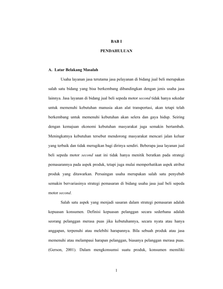 BAB I PENDAHULUAN A. Latar Belakang Masalah Usaha layanan jasa terutama jasa pelayanan di bidang jual beli merupakan salah satu bidang yang bisa berkembang dibandingkan dengan jenis usaha jasa lainnya. Jasa layanan di bidang jual beli sepeda motor second tidak hanya sekedar untuk memenuhi kebutuhan manusia akan alat transportasi, akan tetapi telah berkembang untuk memenuhi kebutuhan akan selera dan gaya hidup. Seiring dengan kemajuan ekonomi kebutuhan masyarakat juga semakin bertambah. Meningkatnya kebutuhan tersebut mendorong masyarakat mencari jalan keluar yang terbaik dan tidak merugikan bagi dirinya sendiri. Beberapa jasa layanan jual beli sepeda motor second saat ini tidak hanya menitik beratkan pada strategi pemasarannya pada aspek produk, tetapi juga mulai memperhatikan aspek atribut produk yang ditawarkan. Persaingan usaha merupakan salah satu penyebab semakin bervariasinya strategi pemasaran di bidang usaha jasa jual beli sepeda motor second. Salah satu aspek yang menjadi sasaran dalam strategi pemasaran adalah kepuasan konsumen. Definisi kepuasan pelanggan secara sederhana adalah seorang pelanggan merasa puas jika kebutuhannya, secara nyata atau hanya anggapan, terpenuhi atau melebihi harapannya. Bila sebuah produk atau jasa memenuhi atau melampaui harapan pelanggan, biasanya pelanggan merasa puas. (Gerson, 2001). Dalam mengkonsumsi suatu produk, konsumen memiliki 1 sejumlah harapan agar apa yang dikonsumsinya sesuai dengan kebutuhan dan keinginan (Tjiptono, 1996 : 59). Kepuasan konsumen merupakan terpenuhinya sejumlah harapan dalam mengkonsumsi suatu produk sesuai dengan kebutuhan dan keinginannya. Semakin tinggi harapan tersebut terealisasi, maka akan semakin tinggi tingkat kepuasannya. Oleh karena itu, salah satu bentuk implementasi strategi pemasaran yang berorientasi pada pelanggan atau konsumen adalah memperhatikan factor-faktor yang menentukan tingkat kepuasan dalam mengkonsumsi. Strategi pemasaran yang berorientasi pada kepuasan konsumen merupakan salah satu kunci keberhasilan dalam persaingan dunia usaha (Foedjiawati, 2005 : 74-75). Kepuasan merupakan respon konsumen yang sekaligus evaluasi atas produk yang dikonsumsi sebelumnya. Kepuasan dapat berarti pula sebagai penilaian terhadap suatu produk yang telah dikonsumsi di mana penilaian tersebut didasarkan pada pandangan individu atau subjektif. Untuk mencapai keberhasilan dalam pemasaran perlu dilakukan adanya suatu pemahaman tentang perilaku konsumen dalam menggunakan jasa. Hal ini merupakan tugas penting yang harus dilakukan oleh manajer pemasaran, sebab dengan mengetahui dan memahami tentang perilaku konsumen perusahaan akan mampu melakukan perbaikan dan pengembangan produk jasanya sesuai dengan apa yang menjadi keinginan dan kebutuhan konsumen. Produk jasa yang dimaksud adalah sekumpulan atribut yang memberikan kepuasan. Kualitas barang/jasa dalam kehidupan sehari-hari mereka, sehingga menimbulkan kepuasan. Kita memperhatikan diri kita sendiri dengan kualitas bila 2 kita akan melakukan pembelian besar, seperti membeli rumah, mobil, barang digital, atau bahkan bila mengadakan liburan. Kualitas merupakan salah satu faktor yang dipertimbangakan untuk menimbulkan kepuasan, sehingga perusahaan membedakan pelayanan mereka dengan perusahaan. Itu merupakan pertimbangan baik atau penting bagi para pelanggan untuk mengukur kepuasan pelanggan tentang kualitas produk jasa pada perusahaan jasa. Kepuasan maupun ketidak puasan pelanggan merupakan topik yang hangat dibicarakan. Kepuasan pelanggan ditentukan oleh kualitas jasa yang dikehendaki pelanggan, sehingga jaminan kualitas menjadi prioritas utama bagi setiap perusahaan, yang ada saat ini khususnya dijadikan sebagai tolok ukur keunggulan daya saing perusahaan. Kualitas pelayanan juga termasuk dalam penilaian konsumen terhadap suatu pembelian. Service adalah pengalaman yang tidak berwujud (intangible) yang diterima oleh konsumen bersamaan dengan produk yang berwujud (tangible) dari suatu produk yang dibeli. Kualitas adalah suatu ukuran yang mengukur kemampuan suatu bisnis dalam memenuhi kebutuhan konsumennya. Ini berarti dalam bisnis ditanamkan sikap yang berorientasi pasar konsumen dengan mendengarkan “suara dari konsumen” (apa yang diinginkan konsumen). Produk service yang berkualitas merupakan hal yang dapat memuaskan konsumen (Davidoff, 1994). Kepuasan konsumen ini tidak hanya terbentuk oleh factor kualitas pelayanan, akan tetapi merupakan suatu proses berupa pengalaman konsumen dalam melakukan pembelian. Besarnya tingkat kepuasan konsumen akan menentukan seberapa penilaian terhadap suatu kualitas pelayanan. 3 Dengan diberikannya kualitas pelayanan yang maksimal membuat konsumen merasa puas. Konsumen yang merasa puas ini pasti akan memberitahukan kepada orang lain sehingga banyak orang yang akan datang dan menggunakan bisnis tersebut yang pada akhirnya sangat membantu perusahaan dalam meningkatkan laba. (Olsen, Teare dan Gummesson, 1996). Untuk menghasilkan service quality yang maksimal, maka manajemen harus mengetahui apa yang menjadi ekspektasi dari konsumen. Bila apa yang menjadi ekspektasi konsumen dipenuhi oleh pihak penyedia jasa maka konsumen akan merasa puas. Persaingan yang terjadi di antara perusahaan-perusahaan untuk menciptakan produk yang berkualitas yang tentunya sesuai dengan keinginan para konsumen pada saat ini semakin meningkat tidak hanya pada perusahaanperusahaan besar tetapi juga dihadapi oleh perusahaan-perusahaan menengah dan kecil. Oleh karena itu setiap perusahaan apabila menginginkan perusahaannya tetap menjadi yang terbaik, seluruh organisasi yang berada disetiap lini perusahaan harus selalu memperhatikan kebutuhan dan keinginan konsumennya serta terus melakukan perbaikan (constinous improvement) untuk tetap menjaga kualitas produk dan juga kepuasan konsumen, karena salah satu kunci untuk menjaga tetap eksis adalah dengan memperhatikan kualitas jasa. Hal ini dilakukan karena adanya kenyataan bahwa konsumen yang tidak puas terhadap barang atau