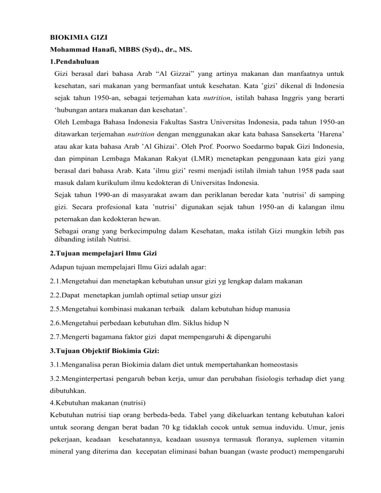 BIOKIMIA GIZI Mohammad Hanafi, MBBS (Syd)., dr., MS. 1.Pendahuluan Gizi berasal dari bahasa Arab “Al Gizzai” yang artinya makanan dan manfaatnya untuk kesehatan, sari makanan yang bermanfaat untuk kesehatan. Kata ‟gizi‟ dikenal di Indonesia sejak tahun 1950-an, sebagai terjemahan kata nutrition, istilah bahasa Inggris yang berarti „hubungan antara makanan dan kesehatan‟. Oleh Lembaga Bahasa Indonesia Fakultas Sastra Universitas Indonesia, pada tahun 1950-an ditawarkan terjemahan nutrition dengan menggunakan akar kata bahasa Sansekerta ‟Harena‟ atau akar kata bahasa Arab ‟Al Ghizai‟. Oleh Prof. Poorwo Soedarmo bapak Gizi Indonesia, dan pimpinan Lembaga Makanan Rakyat (LMR) menetapkan penggunaan kata gizi yang berasal dari bahasa Arab. Kata ‟ilmu gizi‟ resmi menjadi istilah ilmiah tahun 1958 pada saat masuk dalam kurikulum ilmu kedokteran di Universitas Indonesia. Sejak tahun 1990-an di masyarakat awam dan periklanan beredar kata ‟nutrisi‟ di samping gizi. Secara profesional kata ‟nutrisi‟ digunakan sejak tahun 1950-an di kalangan ilmu peternakan dan kedokteran hewan. Sebagai orang yang berkecimpulng dalam Kesehatan, maka istilah Gizi mungkin lebih pas dibanding istilah Nutrisi. 2.Tujuan mempelajari Ilmu Gizi Adapun tujuan mempelajari Ilmu Gizi adalah agar: 2.1.Mengetahui dan menetapkan kebutuhan unsur gizi yg lengkap dalam makanan 2.2.Dapat menetapkan jumlah optimal setiap unsur gizi 2.5.Mengetahui kombinasi makanan terbaik dalam kebutuhan hidup manusia 2.6.Mengetahui perbedaan kebutuhan dlm. Siklus hidup N 2.7.Mengerti bagamana faktor gizi dapat mempengaruhi & dipengaruhi 3.Tujuan Objektif Biokimia Gizi: 3.1.Menganalisa peran Biokimia dalam diet untuk mempertahankan homeostasis 3.2.Menginterpertasi pengaruh beban kerja, umur dan perubahan fisiologis terhadap diet yang dibutuhkan. 4.Kebutuhan makanan (nutrisi) Kebutuhan nutrisi tiap orang berbeda-beda. Tabel yang dikeluarkan tentang kebutuhan kalori untuk seorang dengan berat badan 70 kg tidaklah cocok untuk semua induvidu. Umur, jenis pekerjaan, keadaan kesehatannya, keadaan ususnya termasuk floranya, suplemen vitamin mineral yang diterima dan kecepatan eliminasi bahan buangan (waste product) mempengaruhi kebutuhan kalori seseorang. Akan tetapi mekanisme kontrol secara Fisiologi dan Biokimia yang terjadi dalam tubuh kita menghasilkan suatu keadaan keseimbangan. Seperti halnya makhluk hidup yang lain, manusia bertahan hidup karena adanya perpindahan energi yang berkelanjutan keluar masuk tubuhnya. Makanan menyediakan energi yang dibutuhkan termasuk juga nutrisi esensial yang tidak bisa dibuat dalam tubuh makhluk hidup. Nutiri yang cukup adalah mencakup 6 kompnen utama dari diet yaitu, karohidrat, protein, lipid, vitamin, mineral dan air. Makanan juga mengandung komponen yang tidak diperlukan (nonnutritive components) yang bersama-sama dengan bakteri flora usus serta sel-sel debris dan material buangan lainnya dieksresi keluar tubuh berupa keringat, urine dan feses. 5.Homeostasis. Komposisi intraselluler harus dipertahankan konstant, dapat berubah namun dalam batas-batas perubahan yang kecil. Mekanisme untuk mempertahankan keadaan yang relatif konstant tersebut disebut homeostasis. 6.Air dalam tubuh manusia. Orang normal terdiri dari 55% air, 19% protein, 19% lipid dan kurang dari 1% karbohidrat, dan 7% inorganik. Air dalam tubuh manusia terdapat dalam dua kompartmen, intraselluler dan eksraselluler. Air ekstraselluler ada dua bagian yaitu air interstisial yang seolah-olah menjadi tempat mengapungnya sel dan air yang terdapat dalam plasma darah. Distribusi air yang merata ini tidaklah memperlambat pergerakan atau aliran air dalam tubuh kita. Percobaan dengan infuse radioaktif karbon atau glukosa akan digabungkan dengan karbohidrat atau lipid dalam tubuh kita dalam waktu 30 detik. Hal ini menunjukkan adanya koordinasi dan regulasi reaksi-reaksi Biokimia dalam tubuh kita dengan kecepatan yang sangat tinggi. 7.Komponen utama makanan. 7.1.Protein. Protein tersusun dari asam amina yang terikat dengan ikatan peptida. Lihat kuliah enzim ! Proein yang masih dalm bentuk “native state” tidak bisa dicerna oleh enzim dalam pencernaan kita. Untuk itulah maka harus dimasak dulu. Pemanasan akan meusak bentuk “native state” menjadi bentuk “denatured”. Bentuk “denatured” ini dapat dicerna oleh enzim-enzim yang ada dalam pencernaan kita.. Lihat kuliah pencernaan ! 7.2.Lipida. Dalam makanan banyak sekali macam-macam lipida yang bisa kita peroleh, namun yang paling banyak dan mempunyai nilai nutrisi tinggi adalah trigliserida atau triasilgliserol atau disebut TG. TG terdiri dari gliserol dan tiga asam lemak yang terikat dengan ikatan eser. Asam lemak yang paling sering kita dapatkan adalah asam palmitat adam oleat dan asam stearat. Asam lemak bisa jenuh atau tidak jenuh. Apabila kandungan asam lemak tidak jenuh makin tinggi atau makin tidak jenuh asam lemaknya ( ikatan rangkapnya banyak dan jumlahnya banyak) maka titik rendah titik cairnya (melting point). Lihat kuliah lipida !. 7.3.Karbohidrat. Dalam makanan karbohidrat terbanyak adalah dalam bentuk amilum, laktosa, sukrosa dan glukosa (dextrose). Alfa-D-glukosa adalah merupakan “building block” dari karbohidrat yang terdapat dalam makanan kita. Lihat kuliah karohidat ( KLP ) ! dan pencernaan. Metabolisme karohidrat, lipid dan protein akan diberikan tersendiri. Secara garis besar lihat diagram dibawah ini menggambarkan metabolisme ketiga makromolekul. Diet Protein L-Asam amino Kabohidat Triasilgliserol Monosakarida D-Glukosa Gliserol Asam lemak Asam Piruvat Senyawa keton NH4+ Siklus Urea Asetil-KoA Urea “ TCA Cycle” ATP [H] H2O GTP CO2 ATP Diagram diatas menunjukkan bahwa protein, karbohidrat dan lipida di dalam tubuh dapat diubah menjadi energi fosfat bertenaga tinggi ATP yang diperlukan tubuh untuk bergerak, bernafas, proses anabolik, katabolik dan peristiwa lainnya yang merupakan ciri khas makhluk hidup. Demikian pula makromolekul di atas di dalam tu
