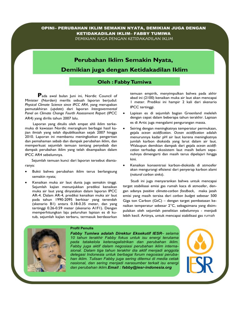 OPINI– PERUBAHAN IKLIM SEMAKIN NYATA, DEMIKIAN JUGA DENGAN KETIDAKADILAN IKLIM– FABBY TUMIWA DEMIKIAN JUGA DENGAN KETIDAKADILAN IKLIM Perubahan Iklim Semakin Nyata, Demikian juga dengan Ketidakadilan Iklim Oleh : Fabby Tumiwa temuan empirik, menyimpulkan bahwa pada akhir abad ini (2100) kenaikan muka air laut akan mencapai 1 meter. Prediksi ini hampir 2 kali dari skenario IPCC tertinggi. Pada awal bulan Juni ini, Nordic Council of Minister (Norden) merilis sebuah laporan berjudul: Physical Climate Science since IPCC AR4, yang merupakan pemutakhiran (update) dari laporan Intergovermental Panel on Climate Change Fourth Assessment Report (IPCC AR4) yang dirilis tahun 2007 lalu. Laporan yang ditulis oleh empat ahli iklim terkemuka di kawasan Nordic merangkum berbagai hasil kajian ilmiah yang telah dipublikasikan sejak 2007 hingga 2010. Laporan ini membantu meningkatkan pengertian dan pemahaman sebab dan dampak perubahan iklim, dan memperkuat sejumlah temuan tentang penyebab dan dampak perubahan iklim yang telah disampaikan dalam IPCC AR4 sebelumnya. Sejumlah temuan kunci dari laporan tersebut diantaranya: • Bukti bahwa perubahan iklim terus berlangsung semakin nyata; • Kenaikan muka air laut dunia juga semakin tinggi. Sejumlah kajian menunjukkan prediksi kenaikan muka air laut yang dinyatakan dalam laporan IPCC AR-4. Dalam AR-4, prediksi kenaikan muka air laut pada tahun 1990-2095 berkisar yang terendah (skenario B1) antara 0.18-0.35 meter, dan yang tertinggi 0.26-0.59 meter (skenario A1F1). Dengan memperhitungkan laju peluruhan lapisan es di kutub, sejumlah kajian terbaru, termasuk berdasarkan Profil Penulis • Lapisan es di sejumlah bagian Greenland meleleh dengan cepat dalam beberapa tahun terakhir. Lapisan es di Artic juga mengalami pengurangan massa. • Seiring dengan meningkatnya temperatur permukaan, gejala ocean acidification. Ocean acidification adalah menurunnya kadar pH air laut karena meningkatnya jumlah karbon dioksida yang larut dalam air laut. Walaupun demikian dampak dari gejala ocean acidification terhadap ekosistem laut masih belum sepenuhnya dimengarti dan masih terus dipelajari hingga kini. • Kenaikan konsentrasi karbon-dioksida di atmosfer akan mengurangi efisiensi dari penyerap karbon alami (natural carbon sinks). Studi ini juga menyarankan bahwa untuk mencapai target stabilisasi emisi gas rumah kaca di atmosfer, dengan adanya positive climate-carbon feedback, maka jatah emisi yang masih tersisa dari carbon budget sebesar 500 Giga ton Carbon (GtC) – dengan target pembatasan kenaikan temperatur sebesar 2°C, sebagaimana yang disimpulakan oleh sejumlah penelitian sebelumnya - menjadi lebih kecil. Artinya, untuk mencapai stabilisasi gas rumah Fabby Tumiwa adalah Direktur Eksekutif IESR– selama 10 tahun terakhir Fabby fokus untuk isu energi terutama pada tatakelola ketenagalistrikan dan perubahan iklim. Fabby juga aktif dalam negosiasi perubahan iklim internasional. Dalam tiga tahun terakhir dia aktif menjadi anggota delegasi Indonesia untuk berbagai forum negosiasi perubahan iklim. Tulisan Fabby juga sering ditemui di media cetak nasional, dan sering menjadi narasumber terkait isu energi dan perubahan iklim.Email : fabby@iesr-indonesia.org Page 2 OPINI– Perubahan Iklim Semakin Nyata, Demikian Juga Dengan Ketidakadilan Iklim– Fabby Tumiwa kaca di atmosfer dengan batasan temperatur 2°C, jatah karbon yang dapat di-emisi hingga 2050, lebih sedikit dari alokasi yang pernah diperkirakan sebelumnya. Laporan Norden ini menjadi sangat penting, jika ditilik bahwa negosiasi internasional dalam payung United Nations Framework Convention on Climate Change (UNFCCC) yang berlangsung sejak tahun 1995, hingga 2009 di Copenhagen gagal mencapai kesepakatan yang substansi untuk menurunkan emisi gas rumah kaca, biang kerok pemanasan global dan perubahan iklim, secara signifikan sebagaimana yang direkomendasikan oleh laporanlaporan IPCC sejak dua dekade lalu. Perundingan perubahan iklim global yang terjadi di Copenhagen pada Desember 2009, yang merupakan puncak dari proses Bali Road Map, yang pada awalnya diharapkan melahirkan Kesepakatan penurunan emisi yang lebih ambisius untuk mencapai kenaikan temperatur rata-rata dibawah 2C, setelah revolusi industri di abad 18, pada kenyataannya memberikan hasil yang mengecewakan.Kajian yang dilakukan oleh Joeri Rogelj, dkk yang dipublikasikan di jurnal Nature No. 464 (22 April 2010) berjudul Copenhagen Accord Pledges are Paltry menyimpulkan bahwa komitmen pengurangan emisi gas rumah kaca yang dijanjikan atau ditargetkan oleh negara-negara maju dan berkembang sesuai dengan arahan kesepakatan Copenhagen Accord sesungguhnya tidak membatasi kenaikan temperatur dibawah 2°C, melainkan menuju ke 3°C, bahkan 5° C (gambar 1). Saat ini rata-rata suhu permukaan bumi telah meningkat 1°C dari temperatur sebelum revolusi industri. Gb. 1. Proyeksi kenaikan temperatur global hingga tahun 2100 Apa akibatnya? Laporan IPCC pertama hingga keempat menyatakan bahwa kenaikan temperatur yang lebih tinggi akan membawa konsekuensi yang besar terhadap ekosistem, ketersediaan air bersih, intensitas cuaca ekstrim, dan lain sebagainya. Laporan Norden ini memberikan konfirmasi bahwa peradaban manusia sedang menuju kepada masa depan yang sangat menantang, yang dapat berdampak pada keberlanjutan manusia dan lingkun- Dari perspektif keadilan iklim global, sudah sepantasnya negara-negara maju bertanggung jawab dan harus bersedia menurunkan emisi gas rumah kaca mereka untuk memberikan ruang yang cukup bagi negara-negara berkembang untuk memanfaatkan sisa ruang atmosfer (atmospheric space) yang tersedia, yang makin tergerus akibat peningkatan laju emisi negara-negara maju dan sedikit negara berkembang yang lebih maju (advance developing country). OPINI– Perubahan Iklim Semakin Nyata, Demikian Juga Dengan Ketidakadilan Iklim– Fabby Tumiwa Negara-negara industri harus menurunkan emisi mereka secara drastis dari sekarang hingga tahun 2050 mendatang, sehingga memung