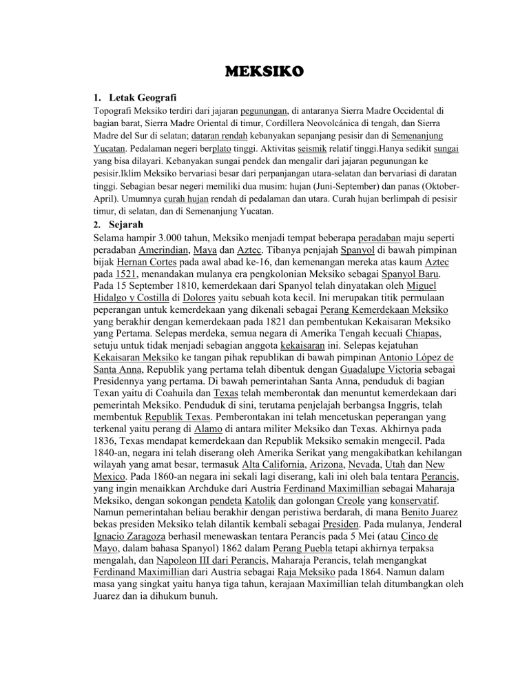 MEKSIKO 1. Letak Geografi Topografi Meksiko terdiri dari jajaran pegunungan, di antaranya Sierra Madre Occidental di bagian barat, Sierra Madre Oriental di timur, Cordillera Neovolcánica di tengah, dan Sierra Madre del Sur di selatan; dataran rendah kebanyakan sepanjang pesisir dan di Semenanjung Yucatan. Pedalaman negeri berplato tinggi. Aktivitas seismik relatif tinggi.Hanya sedikit sungai yang bisa dilayari. Kebanyakan sungai pendek dan mengalir dari jajaran pegunungan ke pesisir.Iklim Meksiko bervariasi besar dari perpanjangan utara-selatan dan bervariasi di daratan tinggi. Sebagian besar negeri memiliki dua musim: hujan (Juni-September) dan panas (OktoberApril). Umumnya curah hujan rendah di pedalaman dan utara. Curah hujan berlimpah di pesisir timur, di selatan, dan di Semenanjung Yucatan. 2. Sejarah Selama hampir 3.000 tahun, Meksiko menjadi tempat beberapa peradaban maju seperti peradaban Amerindian, Maya dan Aztec. Tibanya penjajah Spanyol di bawah pimpinan bijak Hernan Cortes pada awal abad ke-16, dan kemenangan mereka atas kaum Aztec pada 1521, menandakan mulanya era pengkolonian Meksiko sebagai Spanyol Baru. Pada 15 September 1810, kemerdekaan dari Spanyol telah dinyatakan oleh Miguel Hidalgo y Costilla di Dolores yaitu sebuah kota kecil. Ini merupakan titik permulaan peperangan untuk kemerdekaan yang dikenali sebagai Perang Kemerdekaan Meksiko yang berakhir dengan kemerdekaan pada 1821 dan pembentukan Kekaisaran Meksiko yang Pertama. Selepas merdeka, semua negara di Amerika Tengah kecuali Chiapas, setuju untuk tidak menjadi sebagian anggota kekaisaran ini. Selepas kejatuhan Kekaisaran Meksiko ke tangan pihak republikan di bawah pimpinan Antonio López de Santa Anna, Republik yang pertama telah dibentuk dengan Guadalupe Victoria sebagai Presidennya yang pertama. Di bawah pemerintahan Santa Anna, penduduk di bagian Texan yaitu di Coahuila dan Texas telah memberontak dan menuntut kemerdekaan dari pemerintah Meksiko. Penduduk di sini, terutama penjelajah berbangsa Inggris, telah membentuk Republik Texas. Pemberontakan ini telah mencetuskan peperangan yang terkenal yaitu perang di Alamo di antara militer Meksiko dan Texas. Akhirnya pada 1836, Texas mendapat kemerdekaan dan Republik Meksiko semakin mengecil. Pada 1840-an, negara ini telah diserang oleh Amerika Serikat yang mengakibatkan kehilangan wilayah yang amat besar, termasuk Alta California, Arizona, Nevada, Utah dan New Mexico. Pada 1860-an negara ini sekali lagi diserang, kali ini oleh bala tentara Perancis, yang ingin menaikkan Archduke dari Austria Ferdinand Maximillian sebagai Maharaja Meksiko, dengan sokongan pendeta Katolik dan golongan Creole yang konservatif. Namun pemerintahan beliau berakhir dengan peristiwa berdarah, di mana Benito Juarez bekas presiden Meksiko telah dilantik kembali sebagai Presiden. Pada mulanya, Jenderal Ignacio Zaragoza berhasil menewaskan tentara Perancis pada 5 Mei (atau Cinco de Mayo, dalam bahasa Spanyol) 1862 dalam Perang Puebla tetapi akhirnya terpaksa mengalah, dan Napoleon III dari Perancis, Maharaja Perancis, telah mengangkat Ferdinand Maximillian dari Austria sebagai Raja Meksiko pada 1864. Namun dalam masa yang singkat yaitu hanya tiga tahun, kerajaan Maximillian telah ditumbangkan oleh Juarez dan ia dihukum bunuh. Selepas kematian Juárez, anarki telah terjadi dan berlarut-larut selama 30 tahun bermula dengan Pemberontakan Meksiko yang diketuai oleh Porfirio Díaz pada tahun 1910. Tokoh-tokoh yang terkenal sewaktu Pemberontakan Meksiko termasuklah Francisco I. Madero, Venustiano Carranza, Pancho Villa, Alvaro Obregon, Victoriano Huerta, dan Emiliano Zapata. Kaum pemberontak telah menewaskan tentara persekutuan, tetapi mereka terpaksa menghadapi pergolakan di dalam dan negara berada dalam keadaan konflik selama dua dekade lagi. Pemberontakan berakhir pada 1930-an, Partai Institusi Revolusi (PRI) mengambil alih pucuk pemerintahan dan berkuasa selama 70 tahun hingga akhir abad ke-20. PRI merupakan suatu barisan yang terdiri dari beberapa kelompok pemberontak yang menginginkan pertandingan politik berjalan secara aman. Pada Juli 2000, Partai Aksi Nasional (PAN) yang dipimpin oleh Vicente Fox Quesada telah berhasil merampas negara ini dari PRI melalui pemilu yang bebas. Krisis pertama yang dihadapi oleh Presiden Fox ialah pemberontakan di Chiapas olh kelompok Ejército Zapatista de Liberación Nacional (EZLN). Chiapas merupakan negera bagian yang termiskin di Meksiko dan pemberontakan telah bermula sejak 1994. Sebaik sahaja diangkat sebagai Presiden, ia telah mengarahkan semua laskar segera mundur dari negeri tersebut. Jalan raya pemisah juga ditarik balik dan markas militer di sana telah ditutup. Setahun selepas itu, satu perjanjian damai telah dibuat dengan kelompok pemberontak EZLN. Di samping itu, Presiden Fox terpaksa berhadapan dengan masalah kebijakan di negara ini yang terkenal dengan pengambilan sogok. Ini ditambah pula dengan tingkat kejahatan yang amat tinggi terutama di Mexico City merupakan masalah yang utama di negara ini. 3. Ekonomi Sejak Perang Dunia II, negara ini telah mengubah tumpuan dari ekonomi berdasarkan pertanian kepada ekonomi pertambangan. Meksiko kaya dengan minyak bumi dan pada satu ketika merupakan negara terbesar ke-10 penghasil minyak bumi di dunia. Di samping itu, negara ini merupakan pengekspor perak yang terpenting di dunia. Antara dasawarsa 1940-an dan 1980-an negara ini mengalami pertumbuhan ekonomi yang sangat pesat tetapi ia ambruk akibat pinjaman yang berlebihan. Pada tahun 1980-an, negara ini dilanda inflasi. Tetapi ia kembali pulih pada 1990, saat menyertai NAFTA. Kini, pemerintah Meksiko yang baru telah mengalihkan tumpuan dari minyak bumi kepada industri ringan dan ekspor pula. Selain itu, sektor pariwisata telah menjadi sumber ekonomi yang semakin penting. 4. Pendidikan Pendidikan di Meksiko dibagi menurut kelas. Para pelajar dari keluarga berada belajar di sekolah swasta yang lengkap dengan pelbagai kemudahan serta bahan rujukan, sedangkan