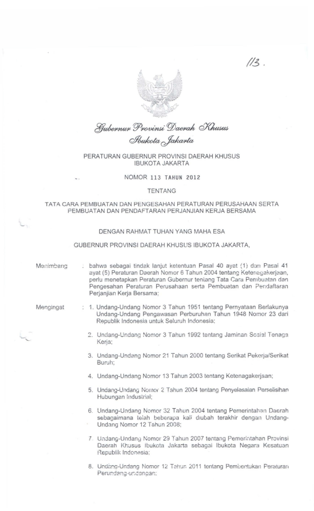 (/3. PERATURAN GUBERNUR PROVINSI DAERAH KHUSUS IBUKOTA JAKARTA NOMOR 113 TAHUN 2012 TENTANG TATA CARA PEMBUATAN DAN PENGESAHAN PERATURAN PERUSAHAAN SERTA PEMBUATAN DAN PENDAFTARAN PERJANJIAN KERJA BERSAMA DENGAN RAHMAT TUHAN YANG MAHA ESA GUBERNUR PROVINSI DAERAH KHUSUS IBUKOTA JAKARTA, bahwa sebagai tindak lanjut ketentuan Pasal 40 ayat (1) deln P2!:al 41 ayat (5) Peraturan Daerah Nomor 6 Tahun 2004 tentang Ke\enc:gakerj<lan, perlu menetapkan Peraturan Gubernur ten lang Tata Cara Pembuat3n dan Pengesahan Peraturan Perusahaan serta Pembuatan dan ?er;daftaran Perjanjian Kerja Bersama; Mengingat 1. Undang-Undang Nomor 3 Tahun 1951 tentang Pernyataan Berlakunya Undang-Undang Pengawasan Perburuhan Tahun 1948 NOI-:10r 23 dari Republik Indonesia untuk Seluruh Indonesia: -'-.- 2. Unctang-LJndnng Nomor 3 Tahun 1992 tentang Jaminan Sosi'3! Tenaga Kerja; 3. Undang-Undang Nomor 21 Tahun 2000 tentang Serikat Pekerja/Serikat Buruh; 4. Undang-Undang NomoI' 13 Tahun 2003 tentang Ketenagakerjaan; 5. Undang-Undang Nomo( 2 Tahun 2004 tentang Penyelesaian Per~eiisihan Hubungan Industr!81; 6. Undang-Undang Nomor 32 Tahun 2004 tentang Pemerintah8!l Dae;rah sebagaimana t",ah beberapa kaii diu bah terakhir dengan UndangUndang NomoI' 12 Tahun 2008; 7. U:ldang-Undany NomoI' 29 Tahun 2007 tentang Pemeri"tahan Provinsi Daerah Kh"ISUS ibukota Jaka:1a sebagai Ibukota Ne9ara Kesatuan !"epublik Indonp,sia: 8. Undi:r.G-Ur:dang !'Jamar 12 Ta!lur. 2011 tentang Perur.cRng ·u::.dan93r:; Pem0et~t:.Jkan Peraturan 2 9. Peraturan Pemerintah Nomer 58 Tahun 2005 tentang Pengelolaan Keuangan Daerah; 10. Peraturan Pemerintah Nomor 38 Tahun 2007 tentang Pembagian Urusan Pemerintahan, antara Pemerintah, Pemerintahan Daerah Provinsi dan Pemerintahan Daerah Kabupaten/Kota; 11. Peraturan Menteri Dalam Negeri Nomor 13 Tahun 2006 tentang Pedoman Pengelolaan Keuangan Daerah sebagaimana telah beberapa kali diubah terakhir dengan Peraturan Menteri Dalam Negeri Nomor 21 Tahun 2011; 12. Peraturan Menteri Tenaga Kerja dan Transmigrasi Nomor PER 161 MEN/XI/2011 tentang Tata Cara Pembuatan dan Pengesahan Peraturan Perusahaan serta Pembuatan dan Pendaftaran Perjanjian Kerja Bersama; 13. Peraturan Daerah Nomor 6 Tahun 2004 tentang Ketenagakerjaan; 14. Peraturan Daerah Nomor 5 Tahun 2007 tentang Pokok-pokok Pengelolaan Keuangan Daerah; 15. Peraturan Daerah Nomor 10 Tahun 2008 tentang Organisasi Perangkat Daerah; 16. Peraturan Gubernur Nomor 119 Tahun 2009 tentang Organisasi dan Tata Kerja Dinas Tenaga Kerja dan Transmigrasi; 17. Peraturan Gubernur Nomor 136 Tahun 2009 tentang Pelaksanaan Program Jaminan Sosial dalam Hubungan Kerja di Luar Jam Kerja; MEMUTUSKAN : - Menetapkan PERATURAN GUBERNUR TENTANG TATA CARA PEMBUATAN DAN PENGESAHAN PERATURAN PERUSAHAAN SERTA PEMBUATAN DAN PENDAFTARAN PERJANJIAN KERJA BERSAMA. BABI KETENTUAN UMUM Pasal1 Dalam Peraturan Gubernur ini yang dimaksud dengan : 1. Daerah adalah Provinsi Daerah Khusus Ibukota Jakarta. 2. Pemerintah Daerah adalah Gubernur dan Perangkat Daerah sebagai unsur Penyelenggara Pemerintahan Daerah. 3. Gubernur adalah Kepala Daerah Provinsi Daerah Khusus Ibukota Jakarta. 3 4. Dinas Tenaga Kerja dan Transmigrasi yang selanjutnya disebut Dinas adalah Dinas Tenaga Kerja dan Transmigrasi Provinsi Daerah Khusus Ibukota Jakarta. 5. Kepala Dinas Tenaga Kerja dan Transmigrasi yang selanjutnya disebut Kepala Dinas adalah Kepala Dinas Tenaga Kerja dan Transmigrasi Provinsi Daerah Khusus Ibukota Jakarta. 6. Suku Dinas Tenaga Kerja dan Transmigrasi yang selanjutnya disebut Suku Dinas adalah Suku Dinas Tenaga Kerja dan Transmigrasi Kota Administrasi di Provinsi Daerah Khusus Ibukota Jakarta. 7. Kepala Suku Dinas Tenaga Kerja dan Transmigrasi yang selanjutnya disebut Kepala Suku Dinas adalah Kepala Suku Dinas Tenaga Kerja dan Transmigrasi Kota Administrasi di Provinsi Daerah Khusus Ibukota Jakarta. 8. Pekerja/Buruh adalah setiap orang yang bekerja dengan menerima upah atau imbalan dalam bentuk lain. 9. Perusahaan adalah : a. Setiap bentuk usaha yang berbadan hukum atau tidak, milik orang perseorangan, milik persekutuan, atau milik badan hukum, atau milik swasta maupun milik negara yang mempekerjakan pekerja/ buruh dengan membayar upah atau imbalan dalam bentuk lain; dan b. Usaha-usaha sosial dan usaha-usaha lain yang mempunyai pengurus dan mempekerjakan orang lain dengan membayar upah atau imbalan dalam bentuk lain. 10. Pengusaha adalah : a. Orang perseorangan, persekutuan atau badan hukum yang menjalankan suatu perusahaan milik sendiri; b. Orang perseorangan, persekutuan atau badan hukum yang secara berdiri sendiri menjalankan perusahaan bukan miliknya; dan c. Orang perseorangan, persekutuan atau badan hukum yang berada di Indonesia mewakili perusahaan sebagaimana dimaksud dalam huruf a dan huruf b, yang berkedudukan di luar wilayah Indonesia. 11. Peraturan Perusahaan yang selanjutnya disingkat PP adalah peraturan yang dibuat secara tertulis oleh pengusaha yang memuat syaratsyarat kerja dan tata tertib perusahaan. 12. Perjanjian Kerja Bersama yang selanjutnya disingkat PKB adalah perjanjian yang merupakan hasil perundingan antara serikat pekerja/ serikat buruh atau beberapa serikat pekerja/serikat buruh yang tercatat pada instansi yang bertanggung jawab di bidang ketenagakerjaan dengan pengusaha atau beberapa pengusaha atau perkumpulan pengusaha yang memuat syarat-syarat kerja, hak dan kewajiban kedua belah pihak. 4 13. Serikat Pekerja/Serikat Buruh adalah organisasi yang dibentuk dari, oleh dan untuk pekerja/buruh baik di perusahaan maupun di luar perusahaan, yang bersifat bebas, terbuka, mandiri, demokratis dan bertanggung jawab guna memperjuangkan, membela serta melindungi hak dan kepentingan pekerja/buruh serta meningkatkan kesejahteraan pekerja/buruh dan keluarganya. BAB II PERATURAN PERUSAHAAN Bagian Kesatu Tata Cara Pembuatan Peraturan Perusahaan Pasal2 (1) Pengusaha yang mempekerjakan pekerja/buruh sekurang-kurangnya 10 (sepuluh) orang wajib membuat PP. (2) PP sebagaimana dimaksud pada ayat (1) beris