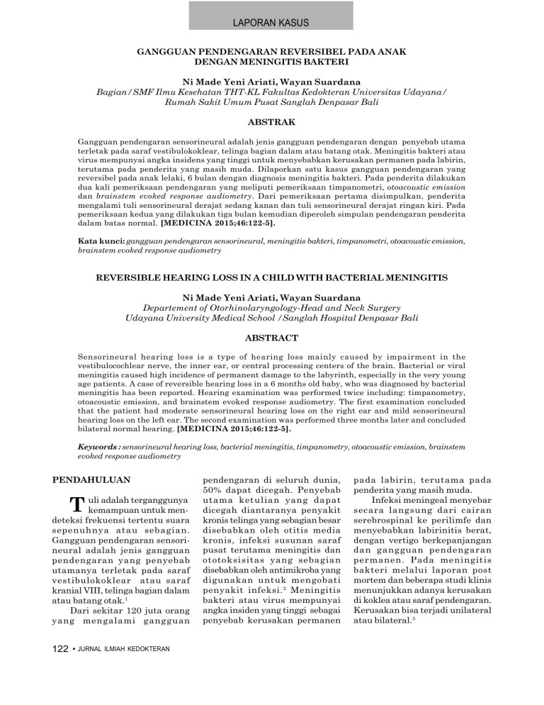 LAPORAN KASUS MEDICINA VOLUME 46 NOMOR 2 M E I 2015 GANGGUAN PENDENGARAN REVERSIBEL PADA ANAK DENGAN MENINGITIS BAKTERI Ni Made Yeni Ariati, Wayan Suardana Bagian/SMF Ilmu Kesehatan THT-KL Fakultas Kedokteran Universitas Udayana/ Rumah Sakit Umum Pusat Sanglah Denpasar Bali ABSTRAK Gangguan pendengaran sensorineural adalah jenis gangguan pendengaran dengan penyebab utama terletak pada saraf vestibulokoklear, telinga bagian dalam atau batang otak. Meningitis bakteri atau virus mempunyai angka insidens yang tinggi untuk menyebabkan kerusakan permanen pada labirin, terutama pada penderita yang masih muda. Dilaporkan satu kasus gangguan pendengaran yang reversibel pada anak lelaki, 6 bulan dengan diagnosis meningitis bakteri. Pada penderita dilakukan dua kali pemeriksaan pendengaran yang meliputi pemeriksaan timpanometri, otoacoustic emission dan brainstem evoked response audiometry. Dari pemeriksaan pertama disimpulkan, penderita mengalami tuli sensorineural derajat sedang kanan dan tuli sensorineural derajat ringan kiri. Pada pemeriksaan kedua yang dilakukan tiga bulan kemudian diperoleh simpulan pendengaran penderita dalam batas normal. [MEDICINA 2015;46:122-5]. Kata kunci: gangguan pendengaran sensorineural, meningitis bakteri, timpanometri, otoacoustic emission, brainstem evoked response audiometry REVERSIBLE HEARING LOSS IN A CHILD WITH BACTERIAL MENINGITIS Ni Made Yeni Ariati, Wayan Suardana Departement of Otorhinolaryngology-Head and Neck Surgery Udayana University Medical School /Sanglah Hospital Denpasar Bali ABSTRACT Sensorineural hearing loss is a type of hearing loss mainly caused by impairment in the vestibulocochlear nerve, the inner ear, or central processing centers of the brain. Bacterial or viral meningitis caused high incidence of permanent damage to the labyrinth, especially in the very young age patients. A case of reversible hearing loss in a 6 months old baby, who was diagnosed by bacterial meningitis has been reported. Hearing examination was performed twice including: timpanometry, otoacoustic emission, and brainstem evoked response audiometry. The first examination concluded that the patient had moderate sensorineural hearing loss on the right ear and mild sensorineural hearing loss on the left ear. The second examination was performed three months later and concluded bilateral normal hearing. [MEDICINA 2015;46:122-5]. Keywords : sensorineural hearing loss, bacterial meningitis, timpanometry, otoacoustic emission, brainstem evoked response audiometry PENDAHULUAN T uli adalah terganggunya kemampuan untuk mendeteksi frekuensi tertentu suara sepenuhnya atau sebagian. Gangguan pendengaran sensorineural adalah jenis gangguan pendengaran yang penyebab utamanya terletak pada saraf vestibulokoklear atau saraf kranial VIII, telinga bagian dalam atau batang otak.1 Dari sekitar 120 juta orang yang mengalami gangguan 122 • JURNAL ILMIAH KEDOKTERAN pendengaran di seluruh dunia, 50% dapat dicegah. Penyebab utama ketulian yang dapat dicegah diantaranya penyakit kronis telinga yang sebagian besar disebabkan oleh otitis media kronis, infeksi susunan saraf pusat terutama meningitis dan ototoksisitas yang sebagian disebabkan oleh antimikroba yang digunakan untuk mengobati penyakit infeksi. 2 Meningitis bakteri atau virus mempunyai angka insiden yang tinggi sebagai penyebab kerusakan permanen pada labirin, terutama pada penderita yang masih muda. Infeksi meningeal menyebar secara langsung dari cairan serebrospinal ke perilimfe dan menyebabkan labirinitis berat, dengan vertigo berkepanjangan dan gangguan pendengaran permanen. Pada meningitis bakteri melalui laporan post mortem dan beberapa studi klinis menunjukkan adanya kerusakan di koklea atau saraf pendengaran. Kerusakan bisa terjadi unilateral atau bilateral.3 Gangguan Pendengaran Reversibel Pada Anak dengan Meningitis Bakteri | Yeni Ariati, dkk. Gangguan pendengaran pada anak-anak dapat menyebabkan kesulitan berbahasa dan mungkin tidak terdiagnosis pada saat pemeriksaan selama perawatan di rumah sakit atau pada pasien rawat jalan. 4 Identifikasi dini gangguan pendengaran sangat penting karena bila terjadi osifikasi dari koklea setelah meningitis dapat mempersulit implantasi koklea. Oleh karena itu pada penderita pasca-meningitis bakteri dianjurkan melakukan pemeriksaan dan evaluasi pendengaran secara rutin. 5 Tingginya angka insiden gangguan pendengaran pascameningitis bakteri dan pentingnya identifikasi dini gangguan pendengaran pada anak yang menderita meningitis menyebabkan penulis ingin menyampaikan satu kasus gangguan pendengaran yang reversibel pada anak usia 6 bulan yang didiagnosis meningitis bakteri. ILUSTRASI KASUS Penderita KYP, lelaki, 6 bulan dikonsulkan pada tanggal 22 Juni 2011 oleh teman sejawat Pediatri dengan diagnosis meningitis bakteri untuk dilakukan evaluasi fungsi pendengaran. Penderita merupakan rujukan dari RSU Klungkung dengan observasi febris dan bangkitan kejang, suspek meningoensefalitis. Selama perawatan di RSUP Sanglah penderita didiagnosis meningitis bakteri berdasarkan gejala klinis berupa demam dan bangkitan kejang. Saat itu hasil analisis cairan serebrospinal menunjukkan hasil Nonne (++) dan Pandy (+++) dengan jumlah sel 219/mm3 dan kadar glukosa cairan serebrospinal 23,88 mg/dl. Biakan darah pada penderita tidak menunjukkan adanya pertumbuhan kuman. CT-scan kepala tidak menunjukkan adanya kelainan. Sejak dirawat mulai tanggal 20 Mei 2011 penderita diberikan obat sefotaksim 3 x 300 mg IV, deksametason 3 x 1 mg IV, dan fenobarbital 50 mg IV satu kali bolus kemudian dilanjutkan dengan dosis rumatan 2 x 17 mg. Pada tanggal 25 Juni 2011 dilakukan pemeriksaan timpanometri, otoacoustic emission (OAE) dan brainstem evoked response audiometry (BERA) di poliklinik THT-KL. Pemeriksaan timpanometri menunjukkan hasil tipe A pada kedua telinga (Gambar 1A), sedangkan pemeriksaan OAE menunjukkan ada kecurigaan kelainan atau refer pada kedua telinga kanan dan kiri (Gambar 1B), dan pemeriksaan BERA menunjukkan 