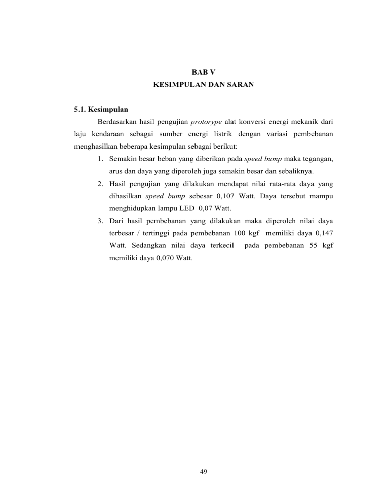 BAB V KESIMPULAN DAN SARAN 5.1. Kesimpulan Berdasarkan hasil pengujian protorype alat konversi energi mekanik dari laju kendaraan sebagai sumber energi listrik dengan variasi pembebanan menghasilkan beberapa kesimpulan sebagai berikut: 1. Semakin besar beban yang diberikan pada speed bump maka tegangan, arus dan daya yang diperoleh juga semakin besar dan sebaliknya. 2. Hasil pengujian yang dilakukan mendapat nilai rata-rata daya yang dihasilkan speed bump sebesar 0,107 Watt. Daya tersebut mampu menghidupkan lampu LED 0,07 Watt. 3. Dari hasil pembebanan yang dilakukan maka diperoleh nilai daya terbesar / tertinggi pada pembebanan 100 kgf memiliki daya 0,147 Watt. Sedangkan nilai daya terkecil memiliki daya 0,070 Watt. 49 pada pembebanan 55 kgf 50 5.2. Saran Saran yang bisa diberikan sebagai masukan apabila dilakukan penelitian lanjutan pengujian pengaruh variasi beban terhadap energi listrik yang dihasilkan pada alat konversi energi bebasis prototype skala laboratorium: 1. Beban yang digunakan sebaiknya lebih besar lagi agar nilai daya listrik yang dihasilkan juga semakin besar. penelitan yang telah dilakukan membuktikan besar kecilnya beban sangatlah berpengaruh terhadap nilai dari daya listriknya. 2. Beban manusia yang digunakan oleh peneliti sebaiknya diganti dengan beban kendaraan, ini karena beban manusia tidak memiliki parameter ukur yang pasti ketika beban menekan speed bump. 3. Penelitian yang dilakukan pada alat ini nilai daya yang dihasilkan fluktuatif, sebainya gunakan alat tambahan berupa (stabilizer listrik) agar nilai daya yang dihasilkan tidak lagi fluktuatif. 4. Pada penelitian ini mengunakan generator (dinamo sepeda) dengan arus 0,5 Ampere, sebaiknya generator yang digunakan memiliki arus yang lebih besar agar daya yang dihasilkan juga semakin besar, ini membuktikan semakin besar arus generator maka daya gererator yang dihasilkan juga semakin besar dan sebaliknya semakin kecil arus generator maka daya yang dihasilkan oleh generator juga semakin kecil, hal tersebut akan mempengaruhi efisiensi dari generatornya. 5. Pada lampiran 3 merupakan gambar dan ukuran pada speed bump (polisi tidur) yang dikeluarkan oleh menteri perhubungan no 3 tahun 1994. Pada penelitian ini ukuran tidak disesuaikan pada peraturan tersebut dikarenakan alat penelitian ini hannya berbasis prototype, akan tetapi fungsi dari alat ini sama yaitu untuk mengurangi kecepatan kendaraan. Sebaiknya untuk penelitian selanjuatnya agar prototype disesuaikan dengan peraturan menteri perhubungan yang ada.