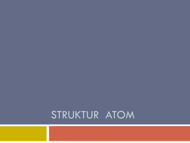 STRUKTUR ATOM Perkembangan konsep atom itu dikemukakan oleh Demokritos yang tidak didukung oleh eksperimen yang meyakinkan, sehingga tidak dapat diterima oleh beberapa ahli ilmu pengetahuan dan filsafat. Pengembangan konsep atom-atom secara ilmiah dimulai oleh John Dalton (1805), kemudian dilanjutkan oleh Thomson (1897), Rutherford (1911) dan disempurnakan oleh Bohr (1914). Hasil eksperimen yang memperkuat konsep atom ini menghasilkan gambaran mengenai susunan partikel-partikel tersebut di dalam atom. Gambaran ini berfungsi untuk memudahkan dalam memahami sifat-sifat kimia suatu atom. 1. Model Atom Dalton John Dalton mengemukakan hipotesa tentang atom berdasarkan hukum kekekalan massa (Lavoisier) dan hukum perbandingan tetap (Proust). Teori yang diusulkan Dalton: a. Atom merupakan bagian terkecil dari materi yang sudah tidak dapat dibagi lagi. b. Atom digambarkan sebagai bola pejal yang sangat kecil, suatu unsur memiliki atom-atom yang identik dan berbeda untuk unsur yang berbeda. c. Atom-atom bergabung membentuk senyawa dengan perbandingan bilangan bulat dan sederhana. Misalnya air terdiri atom-atom hidrogen dan atom-atom oksigen. d. Reaksi kimia merupakan pemisahan atau penggabungan atau penyusunan kembali dari atom-atom, sehingga atom tidak dapat diciptakan atau dimusnahkan. Hipotesa Dalton digambarkan dengan model atom sebagai bola pejal seperti ada tolak peluru. Teori atom Dalton tidak dapat menerangkan suatu larutan dapat menghantarkan listrik. Bagaimana mungkin suatu bola pejal dapat menghantarkan listrik, padahal listrik adalah elektron yang bergerak. Berarti ada partikel lain yang dapat menyebabkan terjadinya daya hantar listrik. 2. Model Atom Thomson Kelemahan dari Dalton diperbaiki oleh JJ. Thomson, eksperimen yang dilakukannya tabung sinar kotoda. Hasil eksperimennya menyatakan ada partikel bermuatan negatif dalam atom yang disebut elektron. Thomson mengusulkan model atom seperti roti kismis atau kue onde-onde. Suatu bola pejal yang permukaannya dikelilingi elektron dan partikel lain yang bermuatan positif sehingga atom bersifat netral. Kelemahan Thomson tidak dapat menjelaskan susunan mutan positif dan negatif dalam atom tersebut. 3. Model Atom Rutherford Eksperimen yang dilakukan Rutherford adalah penembakan lempeng tipis dengan partikel alpha. Ternyata partikel itu ada yang diteruskan, dibelokkan atau dipantulkan. Berarti di dalam atom terdapat susunan- susunan partikel bermuatan positif dan negatif. Hipotesa dari Rutherford adalah atom yang tersusun dari inti atom dan elektron yang mengelilinginya. Inti atom bermuatan positif dan massa atom terpusat pada inti atom. Model Atom Rutherford seperti tata surya. Kelemahan dari Rutherford tidak dapat menjelaskan mengapa elektron tidak jatuh ke dalam inti atom. Berdasarkan teori fisika, gerakan elektron mengitari inti ini disertai pemancaran energi sehingga lama - kelamaan energi elektron akan berkurang dan lintasannya makin lama akan mendekati inti dan jatuh ke dalam inti Ambilah seutas tali dan salah satu ujungnya Anda ikatkan sepotong kayu sedangkan ujung yang lain Anda pegang. Putarkan tali tersebut di atas kepala Anda. Apa yang terjadi? Benar. Lama kelamaan putarannya akan pelan dan akan mengenai kepala Anda karena putarannya lemah dan Anda pegal memegang tali tersebut. Karena Rutherford adalah telah dikenalkan lintasan/kedudukan elektron yang nanti disebut dengan kulit. 4. Model Atom Niels Bohr Kelemahan dari Rutherford diperbaiki oleh Niels Bohr dengan percobaannya menganalisa spektrum warna dari atom hidrogen yang berbentuk garis. Hipotesis Bohr adalah; a. Atom terdiri dari inti yang bermuatan positif dan dikelilingi oleh elektron yang bermuatan negatif di dalam suatu lintasan. b. Elektron dapat berpindah dari satu lintasan ke yang lain dengan menyerap atau memancarkan energi sehingga energi elektron atom itu tidak akan berkurang. Jika berpindah lintasan ke lintasan yang lebih tinggi maka elektron akan menyerap energi. Jika beralih ke lintasan yang lebih rendah maka akan memancarkan energi. PARTIKEL DASAR PENYUSUN ATOM A. Partikel Dasar Penyusun Atom Perkembangan model yang didasari oleh hasil eksperimen menghasilkan data partikel dasar penyusun atom. 1. Elektron Pernahkah Anda memperhatikan Tabung Televisi? Tabung Televisi merupakan tabung sinar katoda. Percobaan tabung sinar katoda pertama kali dilakukan William Crookes (1875). Hasil eksperimennya adalah ditemukannya seberkas sinar yang muncul dari arah katoda menuju ke anoda yang disebut sinar katoda. Kelebihan atom Bohr adalah bahwa atom terdiri dari beberapa kulit untuk tempat berpindahnya elektron. Kelemahan model atom ini adalah: tidak dapat menjelaskan spekrum warna dari atom berelektron banyak. Sehingga diperlukan model atom yang lebih sempurna dari model atom Bohr. George Johnstone Stoney (1891) yang memberikan nama sinar katoda disebut “elektron”. Kelemahan dari Stoney tidak dapat menjelaskan pengertian atom dalam suatu unsur memiliki sifat yang sama sedangkan unsur yang berbeda akan memiliki sifat berbeda, padahal keduanya sama-sama memiliki elektron. Antoine Henri Becquerel (1896) menentukan sinar yang dipancarkan dari unsur-unsur Radioaktif yang sifatnya mirip dengan elektron. Joseph John Thomson (1897) melanjutkan eksperimen William Crookes yaitu pengaruh medan listrik dan medan magnet dalam tabung sinar katoda. Hasil percobaannya membuktikan bahwa ada partikel bermuatan negatif dalam suatu atom karena sinar tersebut dapat dibelokkan ke arah kutub positif medan listrik. 1. Gambaran susunan partikel-partikel dasar dalam atom disebut… A. Konsep atom B. Model atom C. Teori atom D. Definisi atom E. Sejarah atom 2. Pernyataan berikut yang bukan tentang teori atom Dalton adalah… A. Atom adalah bagian terkecil dari materi yang tidak dapat dibagi lagi B. Atom tidak dapat diciptakan dan tidak dapat dimusnahkan C. Atom dari unsur yang berbeda dapat bergabung membentuk senyawa D. Reaksi kimia melibatkan pemisahan atau penggabungan atau penyusunan kembali atom-