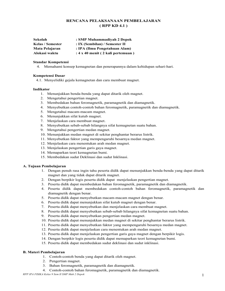 RENCANA PELAKSANAAN PEMBELAJARAN ( RPP KD 4.1 ) Sekolah Kelas / Semester Mata Pelajaran Alokasi waktu : SMP Muhammadiyah 2 Depok : IX (Sembilan) / Semester II : IPA (Ilmu Pengetahuan Alam) : 4 x 40 menit ( 2 kali pertemuan ) Standar Kompetensi 4. Memahami konsep kemagnetan dan penerapannya dalam kehidupan sehari-hari. Kompetensi Dasar 4.1. Menyelidiki gejala kemagnetan dan cara membuat magnet. Indikator 1. Menunjukkan benda-benda yang dapat ditarik oleh magnet. 2. Mengetahui pengertian magnet. 3. Membedakan bahan feromagnetik, paramagnetik dan diamagnetik. 4. Menyebutkan contoh-contoh bahan feromagnetik, paramagnetik dan diamagnetik. 5. Mengetahui macam-macam magnet. 6. Menunjukkan sifat kutub magnet. 7. Menjelaskan cara membuat magnet. 8. Menyebutkan sebab-sebab hilangnya sifat kemagnetan suatu bahan. 9. Mengetahui pengertian medan magnet. 10. Menunjukkan medan magnet di sekitar penghantar berarus listrik. 11. Menyebutkan faktor yang mempengaruhi besarnya medan magnet. 12. Menjelaskan cara menentukan arah medan magnet. 13. Menjelaskan pengertian garis gaya magnet. 14. Memaparkan teori kemagnetan bumi. 15. Membedakan sudut Deklinasi dan sudut Inklinasi. A. Tujuan Pembelajaran 1. Dengan penuh rasa ingin tahu peserta didik dapat menunjukkan benda-benda yang dapat ditarik magnet dan yang tidak dapat ditarik magnet. 2. Dengan berpikir logis peserta didik dapat menjelaskan pengertian magnet. 3. Peserta didik dapat membedakan bahan feromagnetik, paramagnetik dan diamagnetik. 4. Peserta didik dapat membedakan contoh-contoh bahan feromagnetik, paramagnetik dan diamagnetik dengan benar. 5. Peserta didik dapat menyebutkan macam-macam magnet dengan benar. 6. Peserta didik dapat menunjukkan sifat kutub magnet dengan benar. 7. Peserta didik dapat menyebutkan dan menjelaskan cara membuat magnet. 8. Peserta didik dapat menyebutkan sebab-sebab hilangnya sifat kemagnetan suatu bahan. 9. Peserta didik dapat menyebutkan pengertian medan magnet. 10. Peserta didik dapat menunjukkan medan magnet di sekitar penghantar berarus listrik. 11. Peserta didik dapat menyebutkan faktor yang mempengaruhi besarnya medan magnet. 12. Peserta didik dapat menjelaskan cara menentukan arah medan magnet. 13. Peserta didik dapat menjelaskan pengertian garis gaya magnet dengan berpikir logis. 14. Dengan berpikir logis peserta didik dapat memaparkan teori kemagnetan bumi. 15. Peserta didik dapat membedakan sudut deklinasi dan sudut inklinasi. B. Materi Pembelajaran 1. Contoh-contoh benda yang dapat ditarik oleh magnet. 2. Pengertian magnet. 3. Bahan feromagnetik, paramagnetik dan diamagnetik. 4. Contoh-contoh bahan feromagnetik, paramagnetik dan diamagnetik. RPP IPA FISIKA Kelas 9 Sem II SMP Muh 2 Depok 1 5. 6. 7. 8. 9. 10. 11. 12. 13. 14. 15. Macam-macam magnet. Sifat kutub magnet. Cara membuat magnet. Sebab-sebab hilangnya sifat kemagnetan suatu bahan. Pengertian medan magnet. Menunjukkan medan magnet di sekitar penghantar berarus listrik. Menyebutkan faktor yang mempengaruhi besarnya medan magnet. Cara menentukan arah medan magnet. Pengertian garis gaya magnet. Teori kemagnetan bumi. Sudut Deklinasi dan sudut Inklinasi. C. Metode Pembelajaran 1. Pendekatan 2. Metode 3. Model Pembelajaran : Pembelajaran Kontekstual : Diskusi-informasi, Tanya jawab dan Percobaan : Pembelajaran Langsung, dan Pembelajaran Kooperatif D. Strategi Pembelajaran PERTEMUAN PERTAMA 1. Kegiatan Pendahuluan a. Motivasi dan Apersepsi: Apakah kayu dapat ditarik oleh magnet ? Apakah tembaga tergolong bahan feromagnetik atau paramagnetik? Apakah kita dapat membuat magnet? b. Prasyarat pengetahuan: Apakah yang dimaksud dengan bahan magnetik? Bagaimana cara membuat magnet? c. Pra eksperimen: Berhati-hatilah dalam melakukan praktikum. 2. Kegiatan Inti a. Peserta didik dibagi dalam kelompok-kelompok yang beranggota 4-5 peserta didik,dengan tidak membeda-bedakan teman. b. Guru memancing siswa untuk berpikir logis dan membimbing siswa untuk mengetahui bahanbahan yang dapat ditarik magnet dan yang ditolak magnet. c. Peserta didik (dibimbing oleh guru) mendiskusikan pengertian magnet. d. Guru memancing siswa untuk berpikir logis dan membimbing siswa untuk berdiskusi membedakan bahan feromagnetik, paramagnetik dan diamagnetik, serta menyebutkan contoh masing-masing. e. Perwakilan peserta didik diminta untuk menyebutkan macam-macam magnet. f. Peserta didik mempresentasikan hasil diskusi kelompok secara klasikal dengan penuh rasa percaya diri. g. Guru menanggapi hasil diskusi kelompok peserta didik dan memberikan informasi yang sebenarnya. h. Perwakilan dari tiap kelompok diminta untuk mengambil sebuah magnet batang, sebuah statif, dan seutas benang. i. Guru mempresentasikan langkah kerja untuk melakukan eksperimen mengamati arah gerak magnet batang. j. Peserta didik dalam setiap kelompok melakukan eksperimen sesuai dengan langkah kerja yang telah dijelaskan oleh guru. k. Guru memeriksa eksperimen yang dilakukan peserta didik apakah sudah dilakukan dengan benar atau belum. Jika masih ada peserta didik atau kelompok yang belum dapat melakukannya dengan benar, guru dapat langsung memberikan bimbingan. l. Peserta didik dalam setiap kelompok mendiskusikan cara membuat magnet dan hal-hal yang dapat menghilangkan sifat kemagnetan suatu bahan. RPP IPA FISIKA Kelas 9 Sem II SMP Muh 2 Depok 2 m. Peserta didik mempresentasikan hasil diskusi kelompok secara klasikal. n. Guru menanggapi hasil diskusi kelompok peserta didik dan memberikan informasi yang sebenarnya. o. Peserta didik (dibimbing oleh guru) mendiskusikan pengertian medan magnet dan garis gaya magnet dengan berpilir logis dan cermat. p. Guru memberikan instruksi kepada peserta didik untuk melakukan eksperimen mengamati gaya antar-kutub magnet batang dan medan magnet q. Peserta didik secara berkelompok melakukan eksperimen dengan menggunakan dua buah magnet batang, sebuah statif, seutas benang, selembar kertas HVS, dan sejumput serbuk besi. r. Guru memeriksa eksperimen yang dilakukan peserta didik apakah sudah dilakukan den